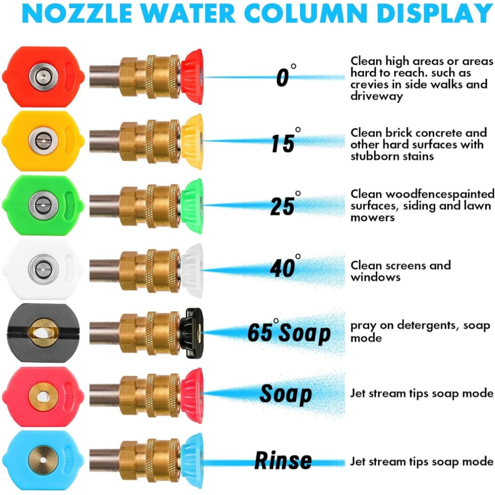 7 Pieces Spray Nozzles: 7 Different Spray Angle Modes, includes 1 Black soap nozzle(65 Degree), 1 Red Nozzle Tip (0 Degree), 1 Yellow Nozzle Tip (15 Degree), 1 GreenNozzle Tip (25 Degree), 1 White Nozzle Tip (40 Degree), 1 Blue Rinse Nozzle, 1 Pink Soap Nozzle.