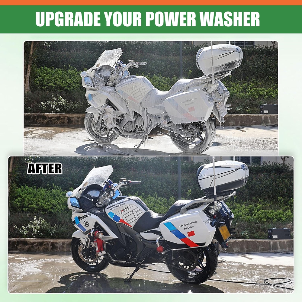 Wide Application: This versatile car wash foam cannon is perfect for motorcycle and car detailing, providing gentle yet thorough cleaning for your vehicles. Beyond automotive use, it is also ideal for cleaning the exterior of your house, driveways, patios and more. The kit comes with 7 power washer nozzle tips, each designed for different cleaning scenarios—from wide-angle foam application to narrow, high-pressure rinsing—meeting all your diverse cleaning needs in one convenient set.