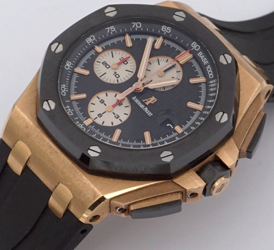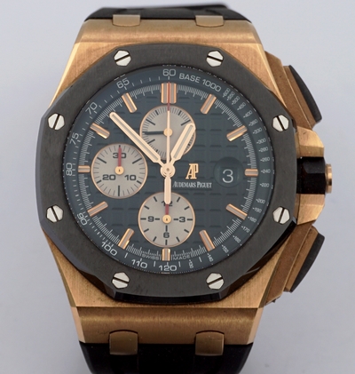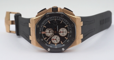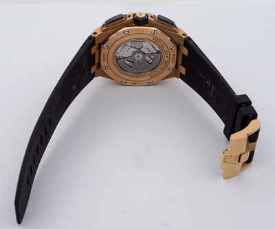 Audemars Piguet Royal Oak Offshore Herrenarmbanduhr, 44mm Durchmesser ohne Krone, Gehäuse in 18k Roségold, AP Kautschukband mit AP Stitschließe in 18k Roségold;