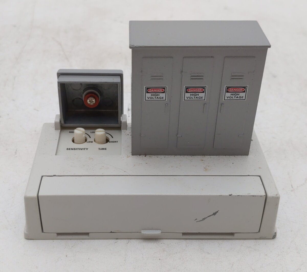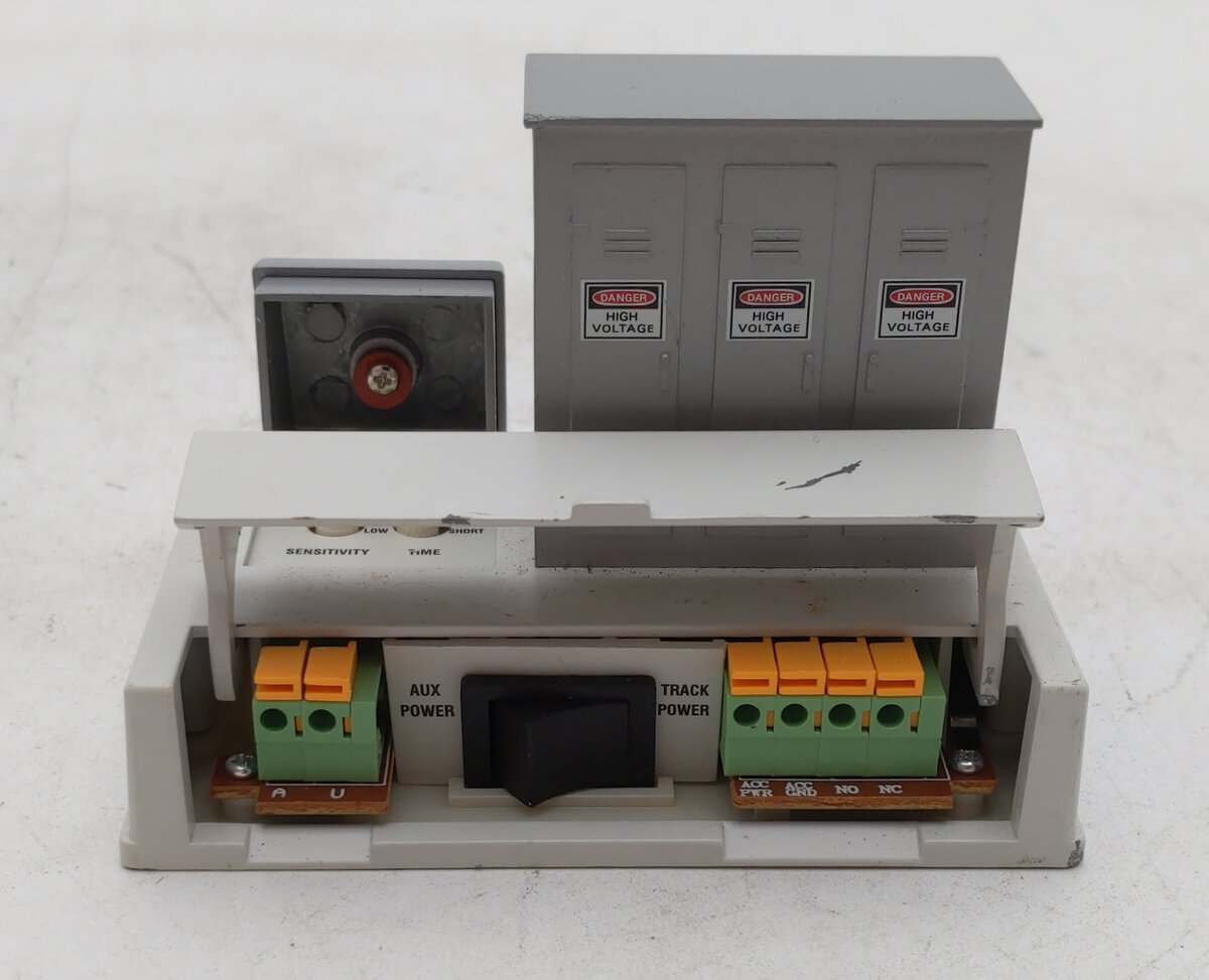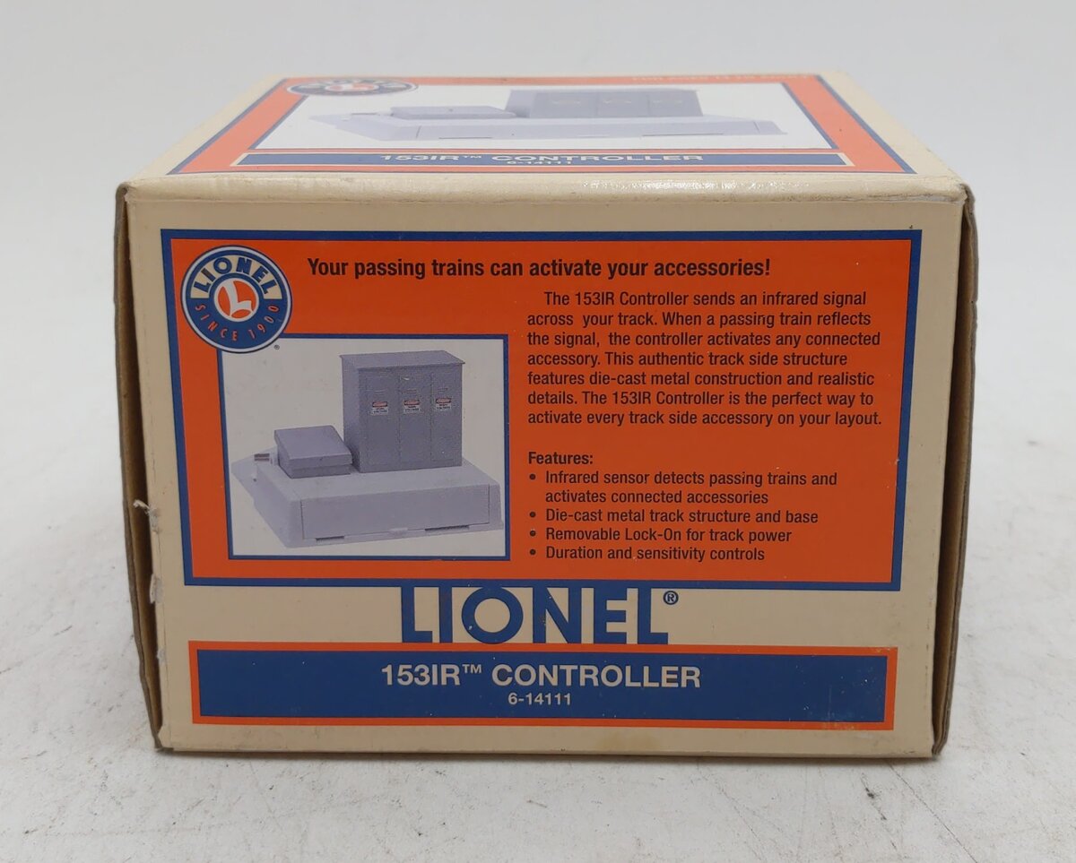 Here is a Lionel 6-14111 O Gauge 153IR Controller. Using infrared, the 153IR sends a signal across your tracks. When the signal is reflected, the accessory to which the 153IR is connected begins to operate. Controls for time delay (from zero to five seconds) and signal sensitivity give the 153IR tremendous flexibility in controlling the exact moment you want your accessory to operate. Designed into a realistic, die-cast track-side building, the 153IR looks at home on any layout. Several can be placed around your layout and won't look out of place like some plastic models on the market today. Powered by a removable track clip or from an auxiliary power supply (not included), the 153IR is a model of flexibility and control. Features infrared sensors detect passing trains and activate connected accessories, and time delay adjustment knob (from 0 to 5 seconds). It measures 5 inches x 4 1/2 inches x 3 1/2 inches. The wires and track clips are NOT included. It is just the controller.