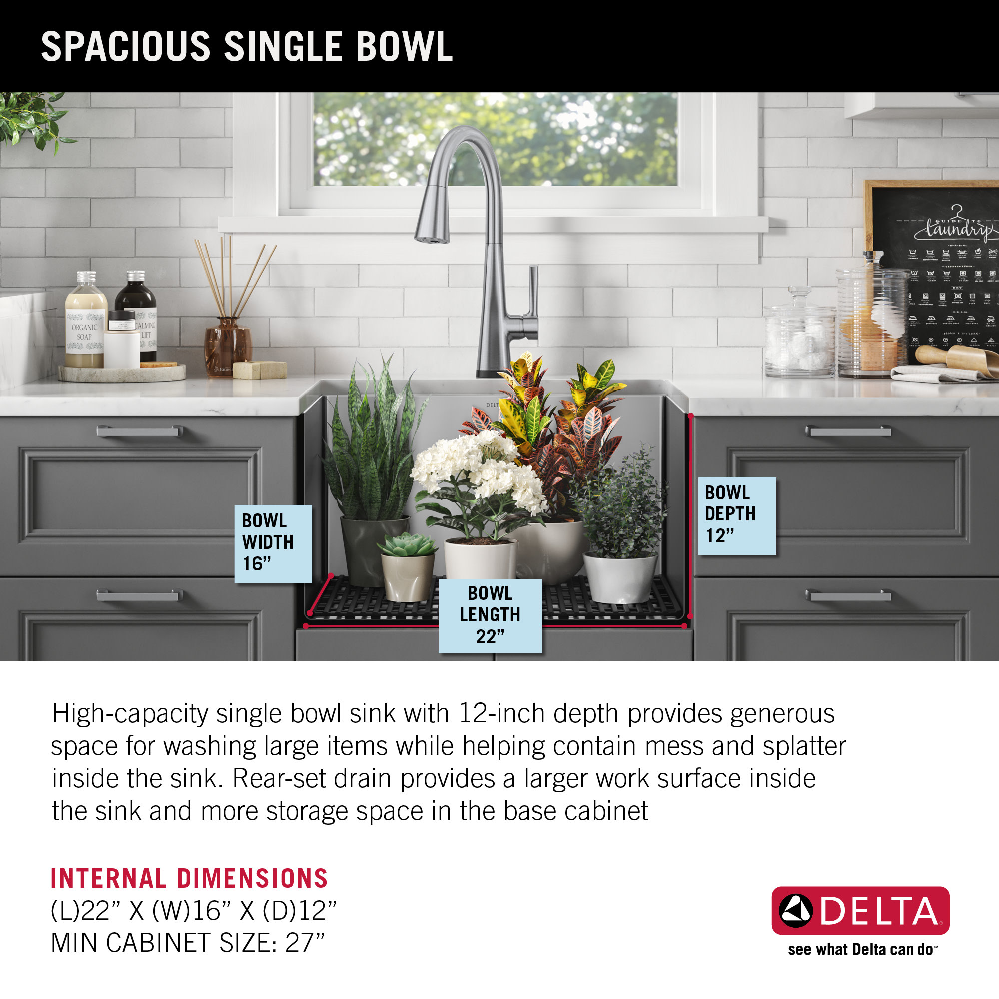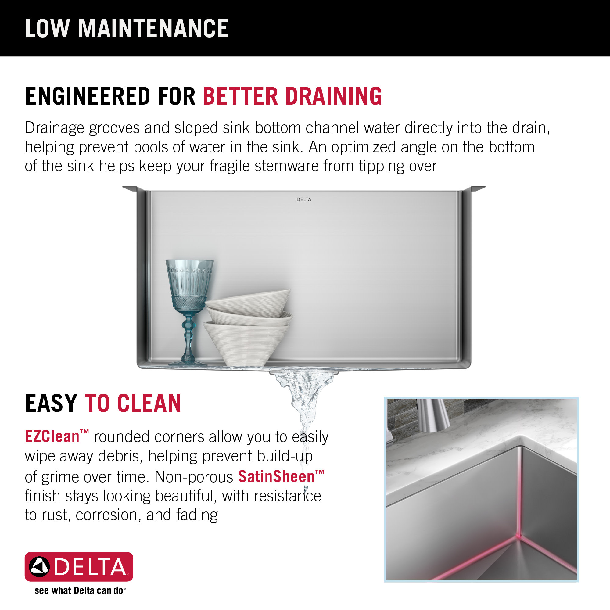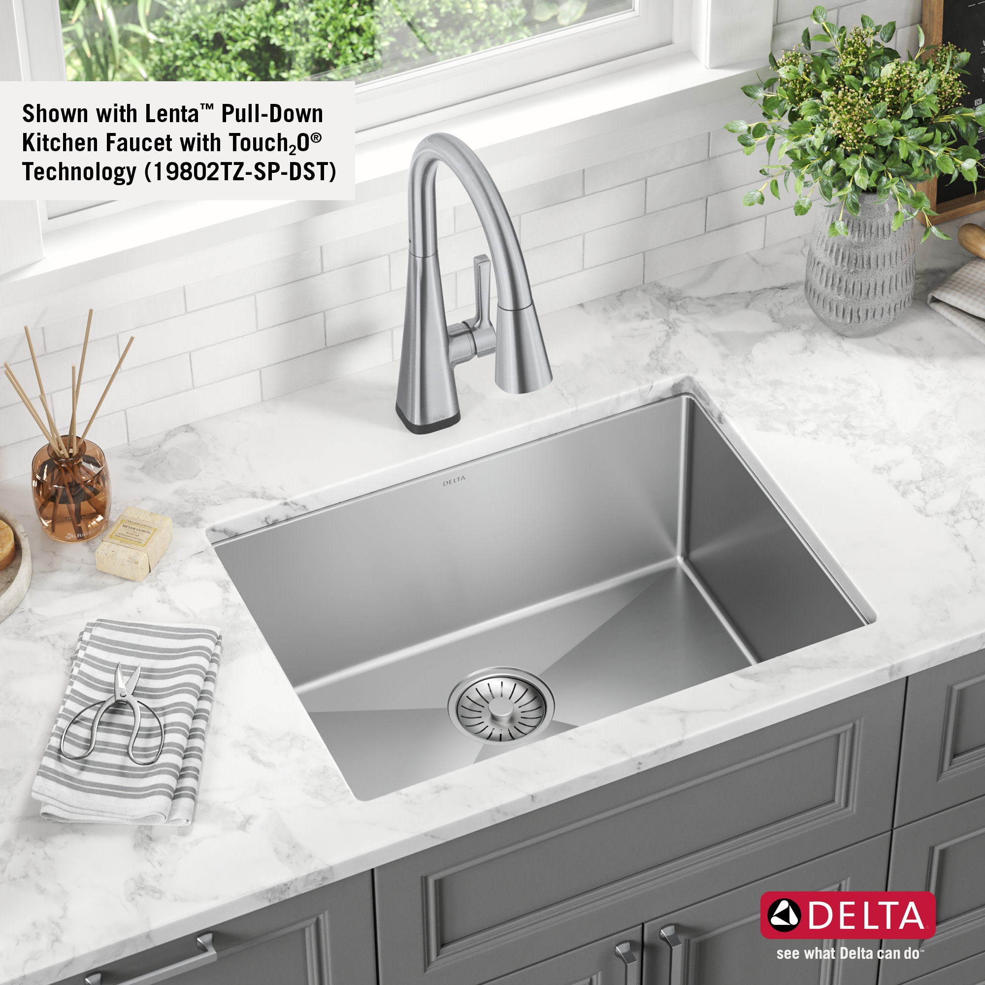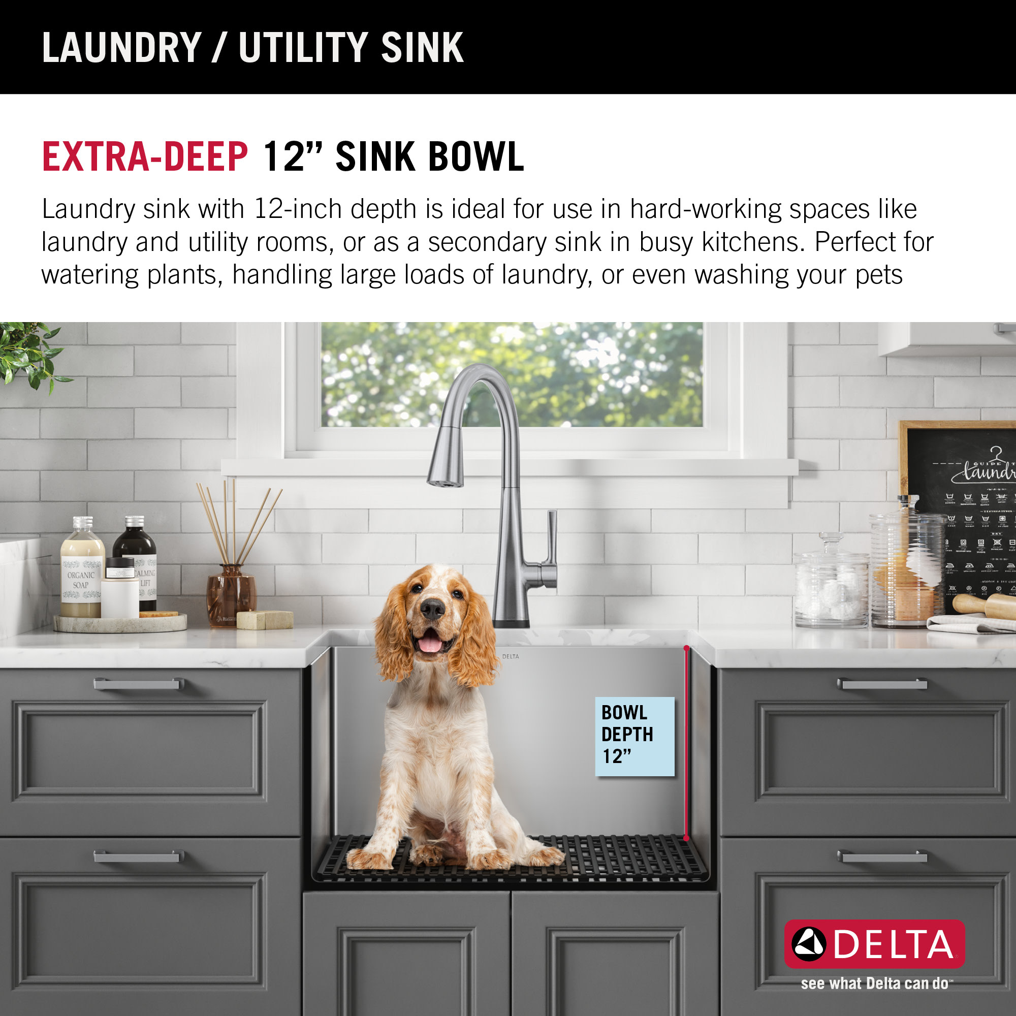 The Delta® Lenta™ Stainless Steel Sink Collection is defined by sleek lines and rounded corners, offering a contemporary aesthetic that blends perfectly with any décor style. A perfect addition to any utility room, mud room, laundry room, or kitchen, this sink features a 12-inch deep single bowl that offers ample room for handling the dirtiest tasks, including soaking laundry, watering plants, or even bathing your pet. The undermount design installs seamlessly for a clean look with no exposed mounting deck, allowing you to wipe water and debris into the sink. Heavy-duty TRU16™ gauge stainless steel offers lasting durability with resistance to dents and damage, while smooth SatinSheen™ finish creates an easy-to-clean surface so your sink stays beautiful with less effort. The kit comes with a stylish black silicone bottom grid that helps protect the sink surface and promotes better drainage by keeping dishes and heavy items elevated. Multi-layer NoiseDefend™ soundproofing helps reduce noise and vibration. A sloped bottom with channel grooves improves drainage, while EZClean™ corners help reduce build-up over time. Installation-ready kit comes with mounting hardware and stainless steel drain assembly to get your home improvement project moving fast. Pairs with the Lenta™ Pull-Down Kitchen Faucet with Touch2O® Technology for flexible functionality and a coordinated look. Lenta™ sinks are backed by a Lifetime Limited Warranty so that you can choose Delta® products with confidence