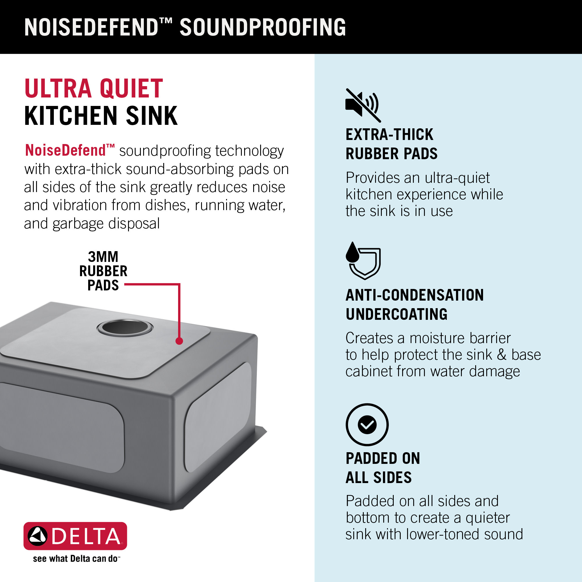 - NoiseDefend soundproofing technology with thick sound-absorbing rubber pads on all sides of the sink greatly reduces noise and vibration while the sink is in use