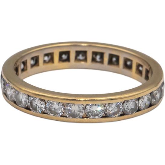 Crafted in 14k yellow gold, the ring showcases a seamless channel setting for the diamonds.