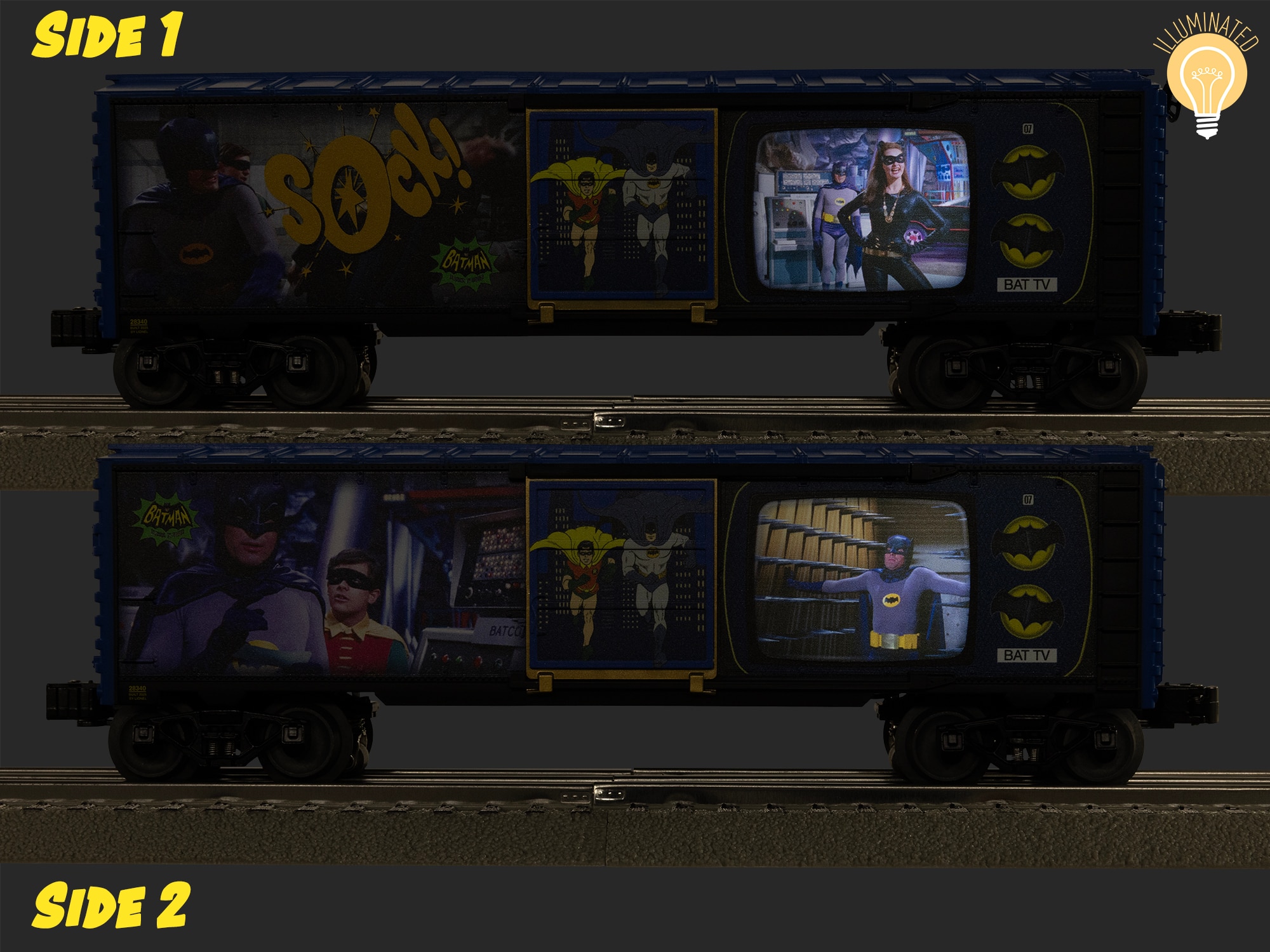 This is a Lionel 2528340 O Batman Illuminated Classic TV Boxcar. Features: Illuminated TV Screen effect! Die-cast trucks. Operating couplers. LED Illuminated classic Batman still on each side.