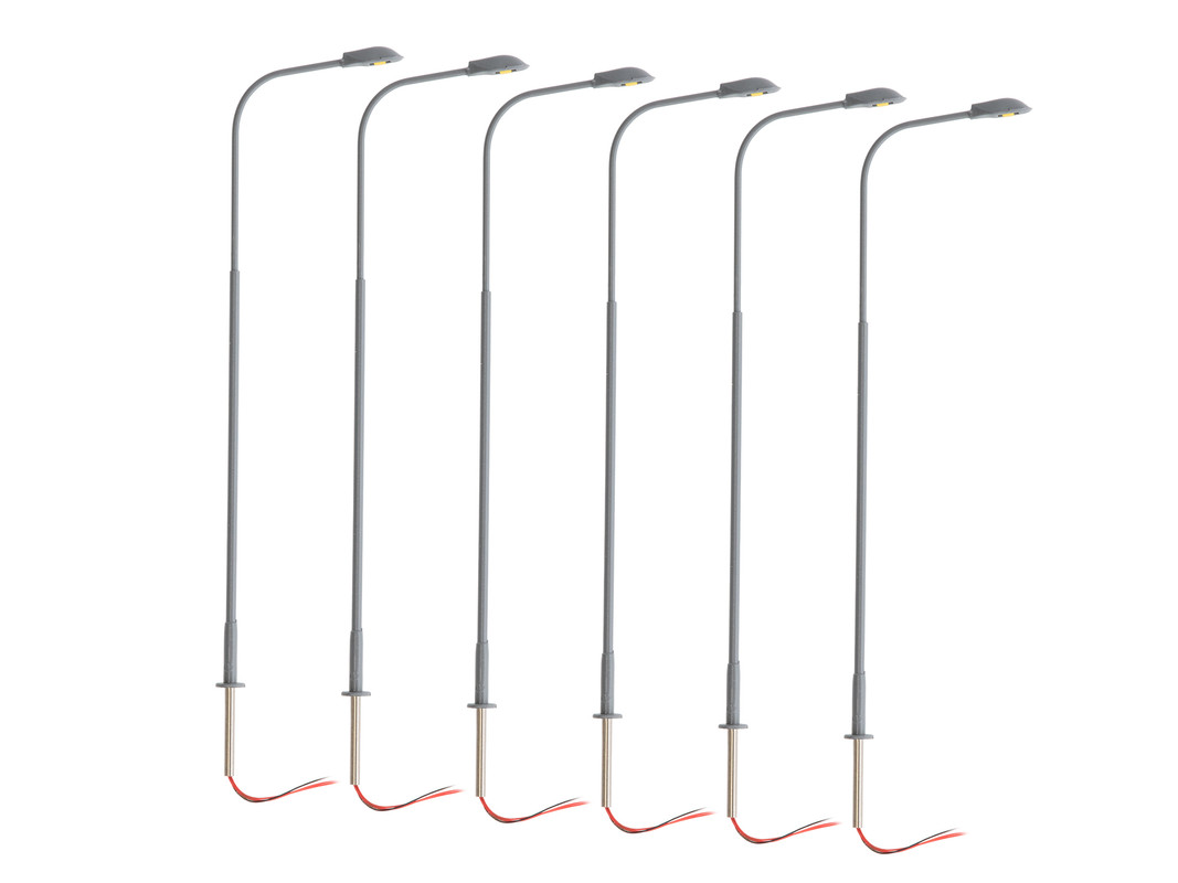 This is a Lionel 2456086 HO Scale Gray Single Arm Cobra Head (Pack of 6). It features: Warm White LED Illuminated & Resistors included suitable for 6-18v AC or DC. Power: Electric & Dimensions: Height: 4'.