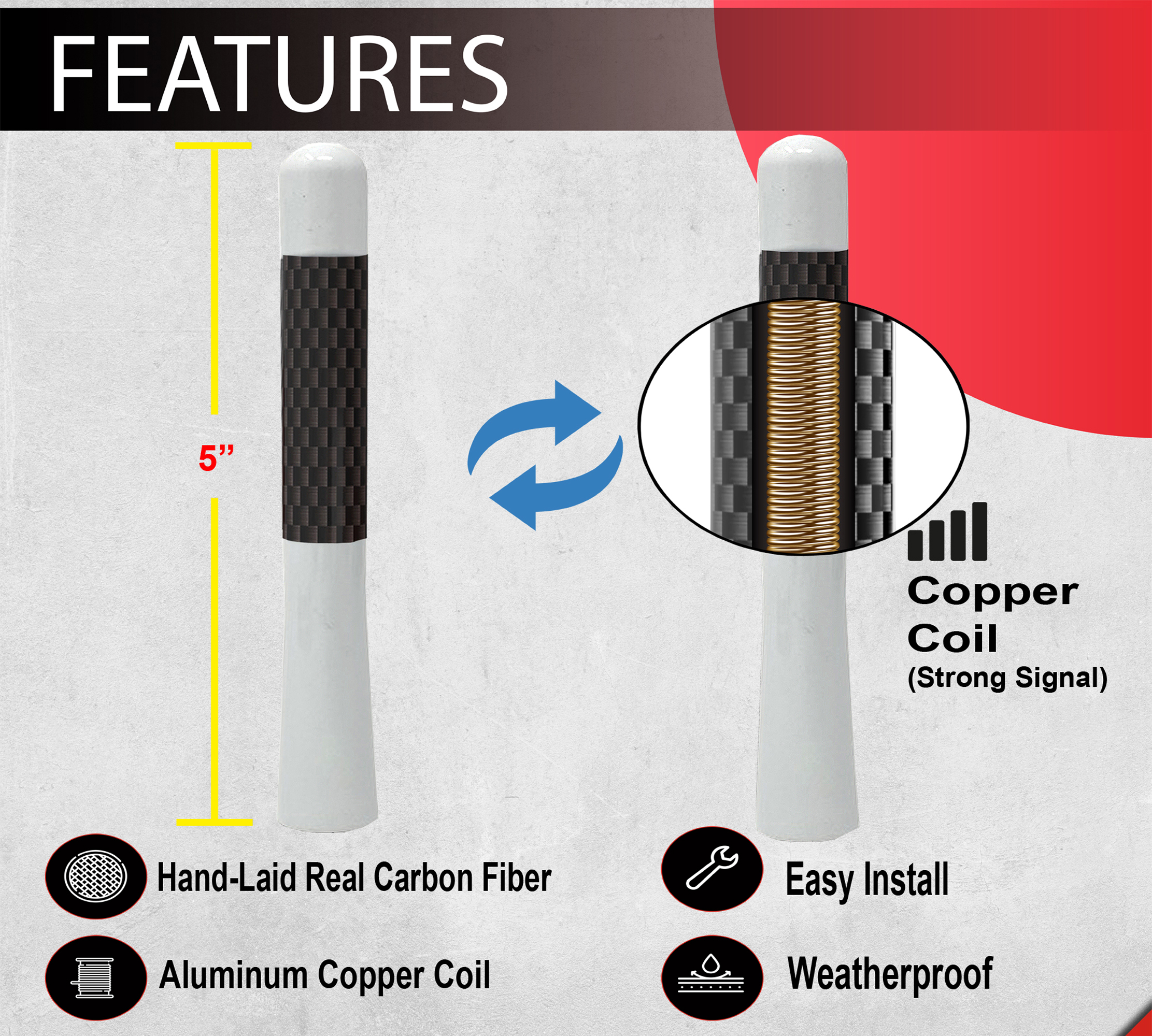• STURDY AND DURABLE: Our carbon fiber antenna is built to last. Made with high-quality materials, it can withstand most weather conditions and car washes. You can trust that it will not easily be bent or damaged, providing you with long-term use.