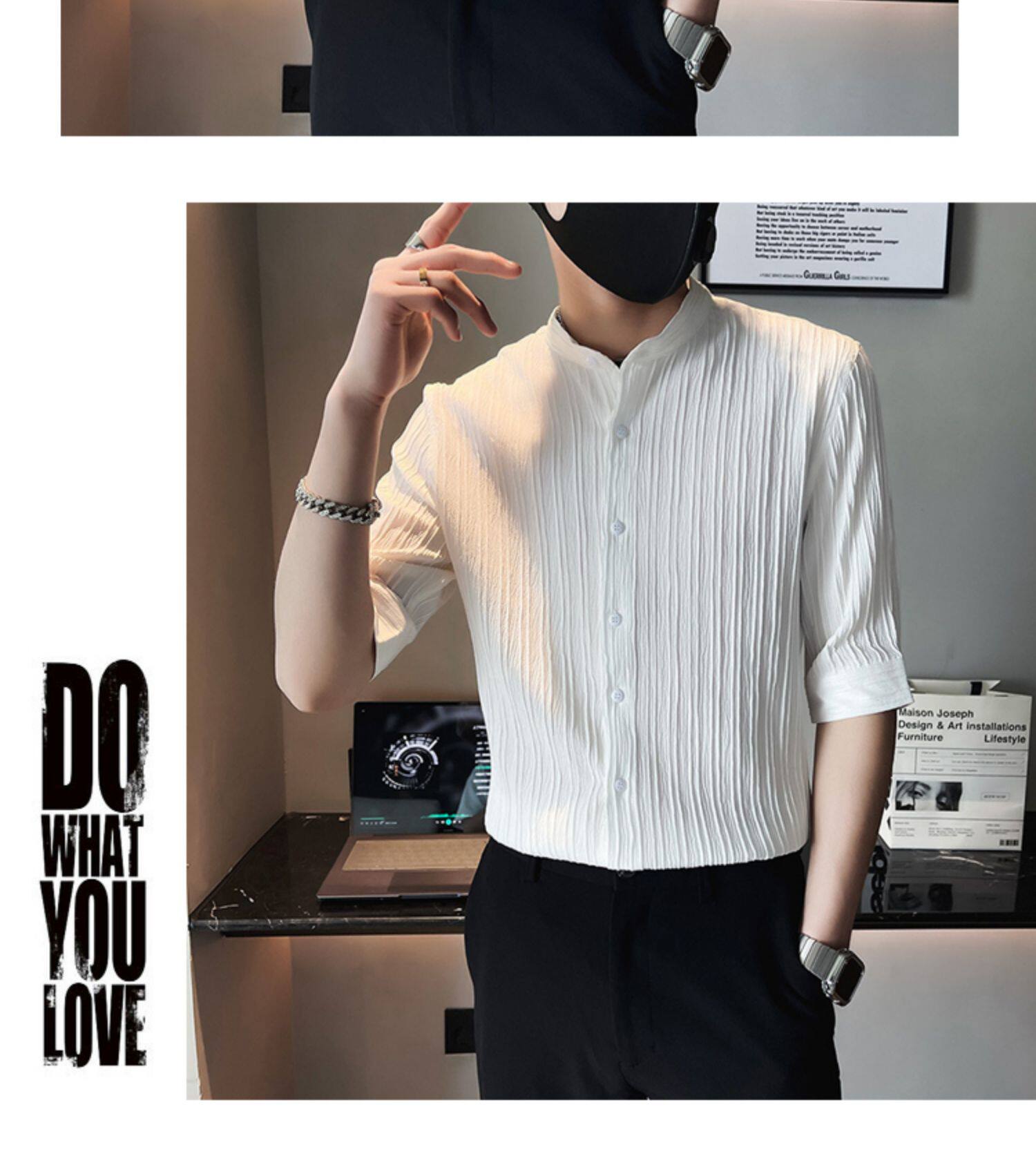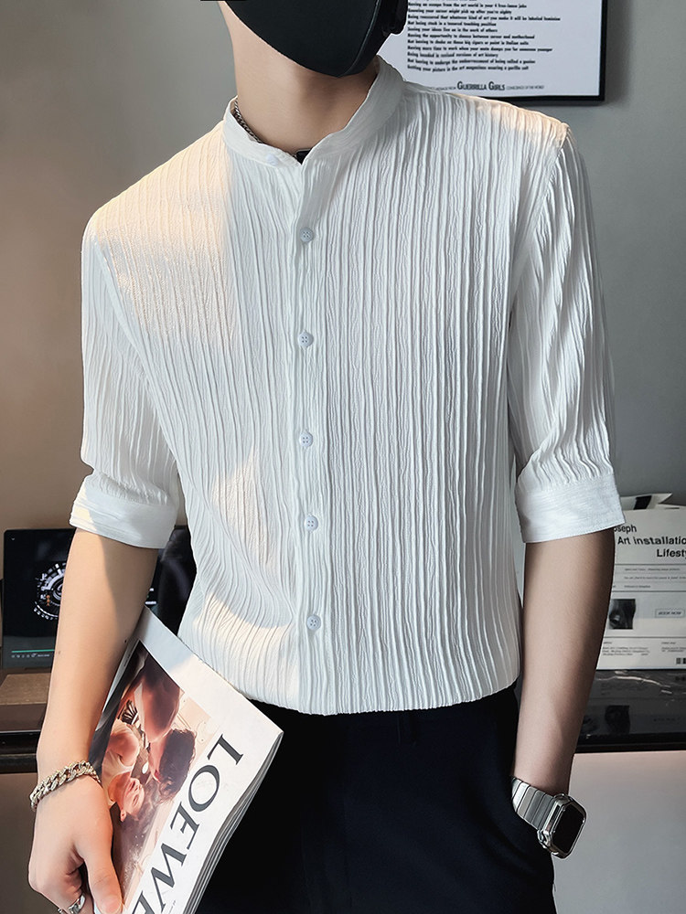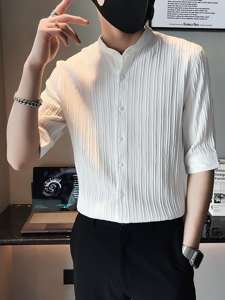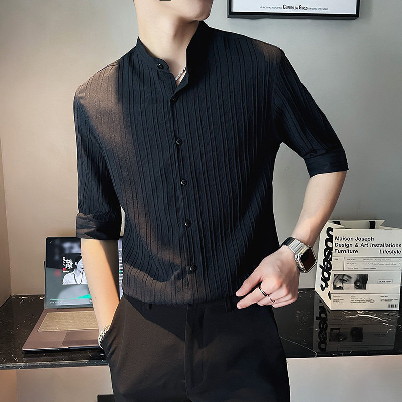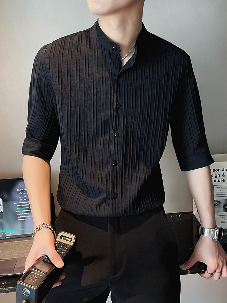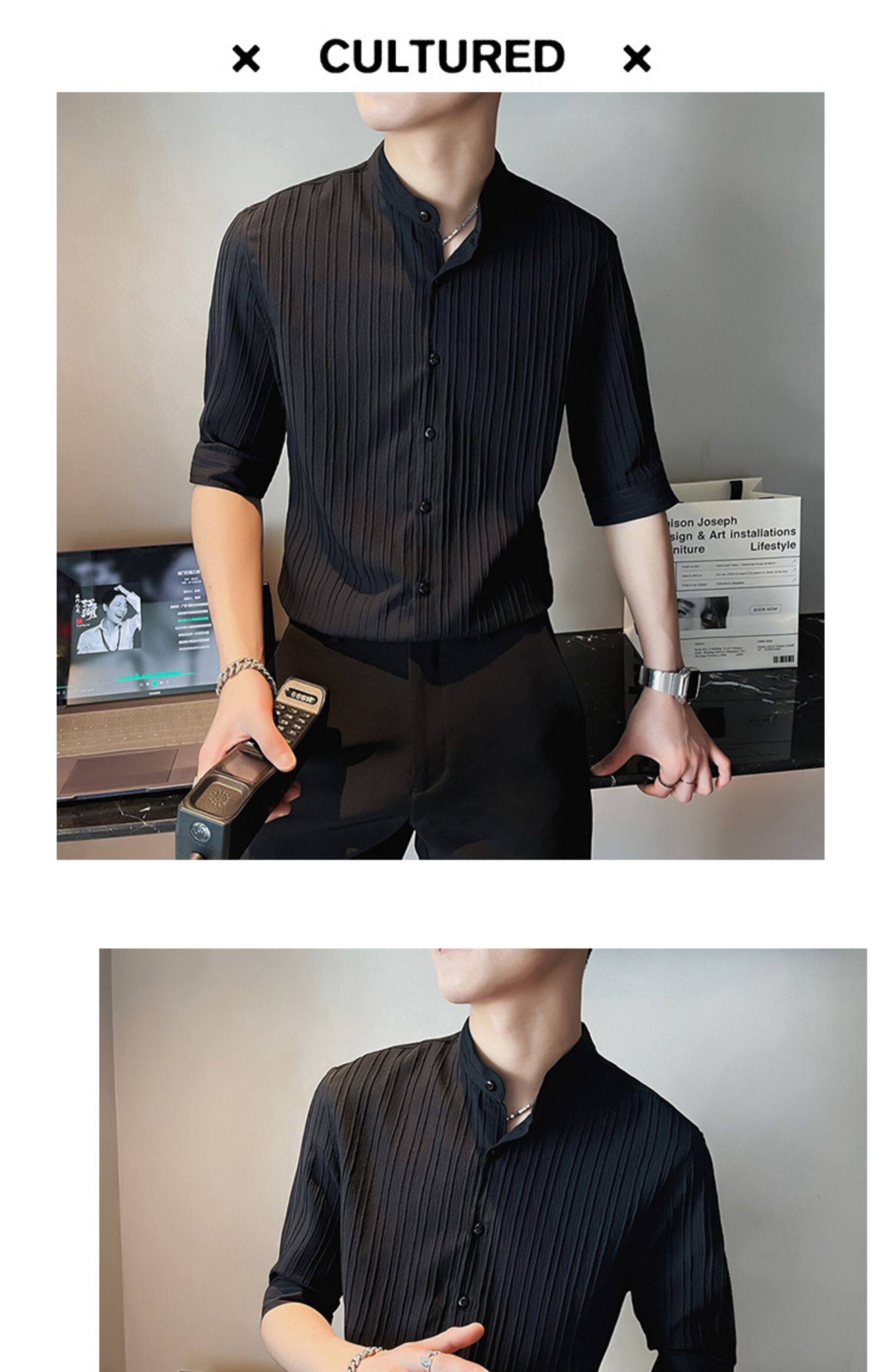 Stand Collar Shirt Men's Short-sleeved Summer Ice Silk Striped High-end Handsome
