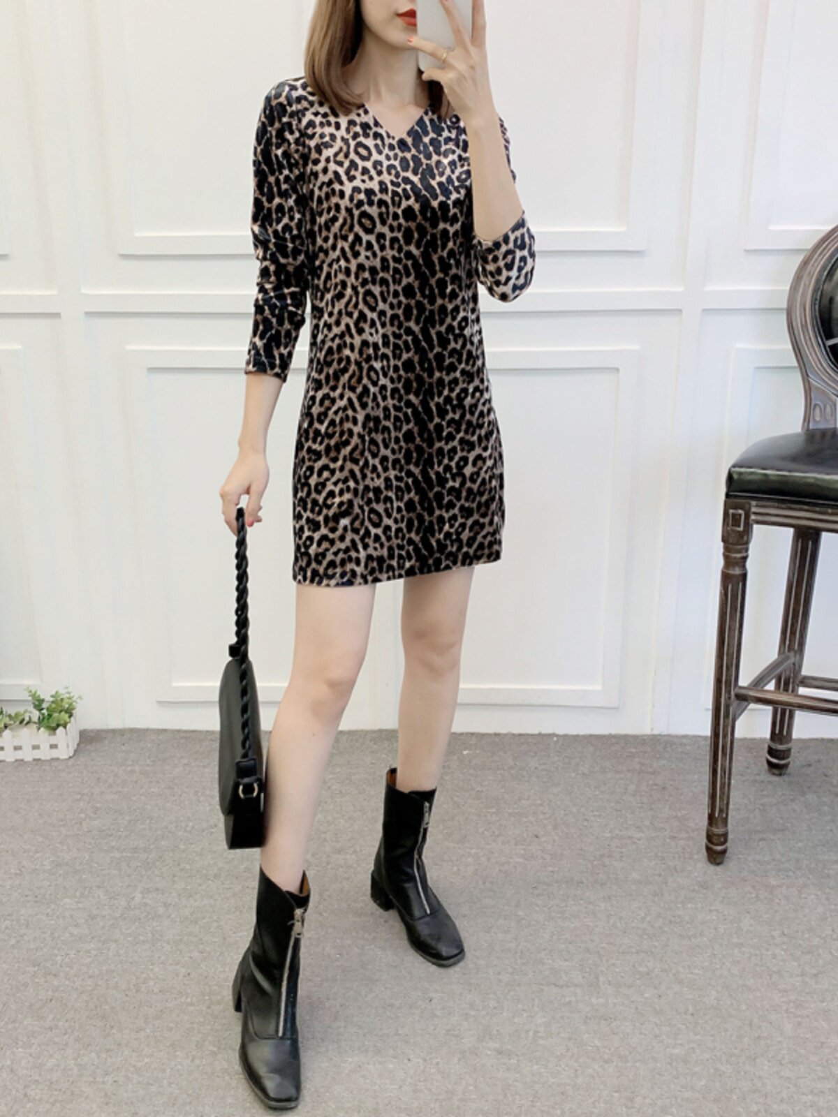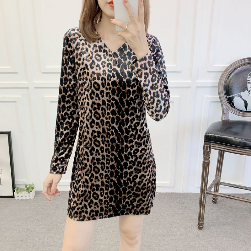 Women's New Autumn/Winter Plus Velvet Thickened Gold Velvet Leopard Print Dress