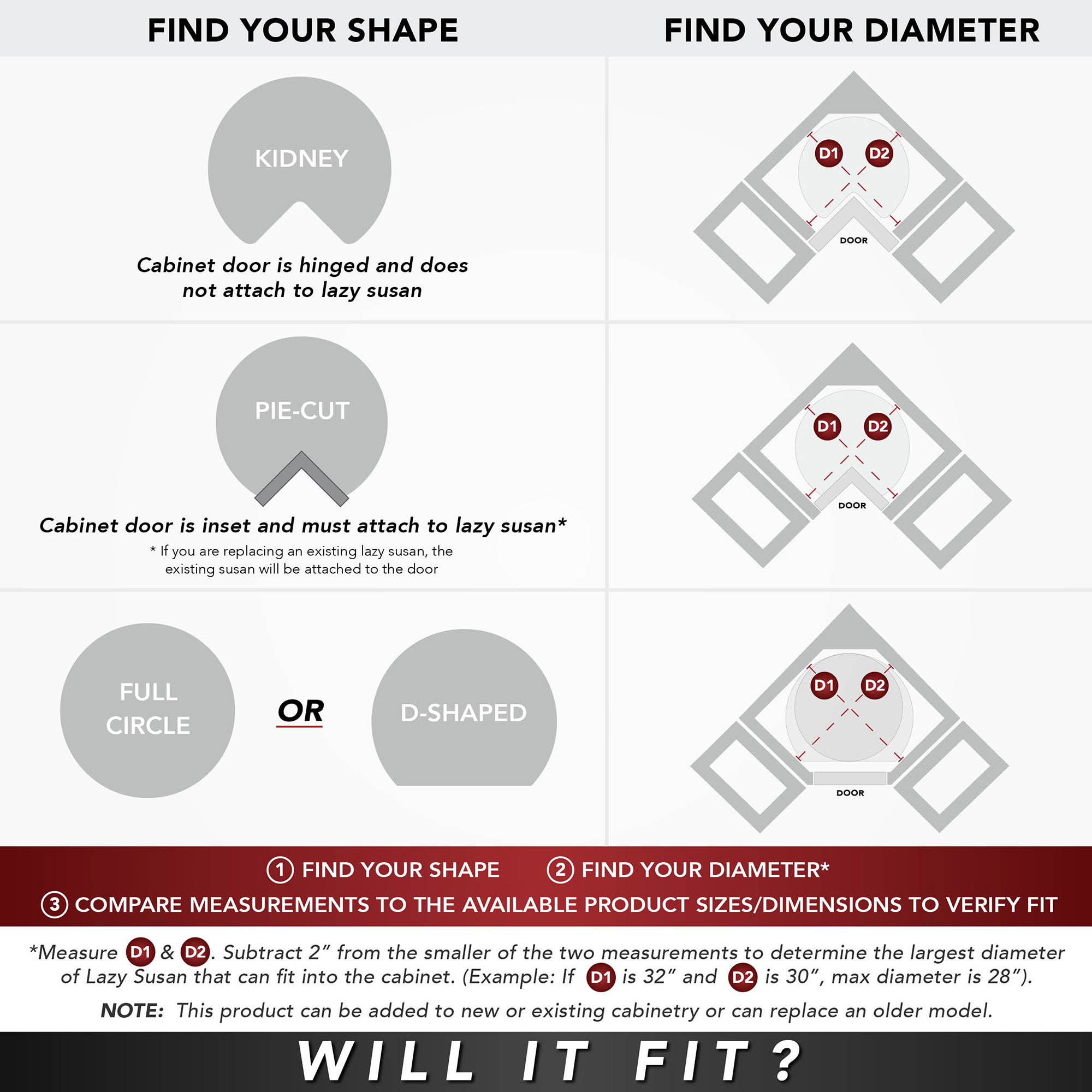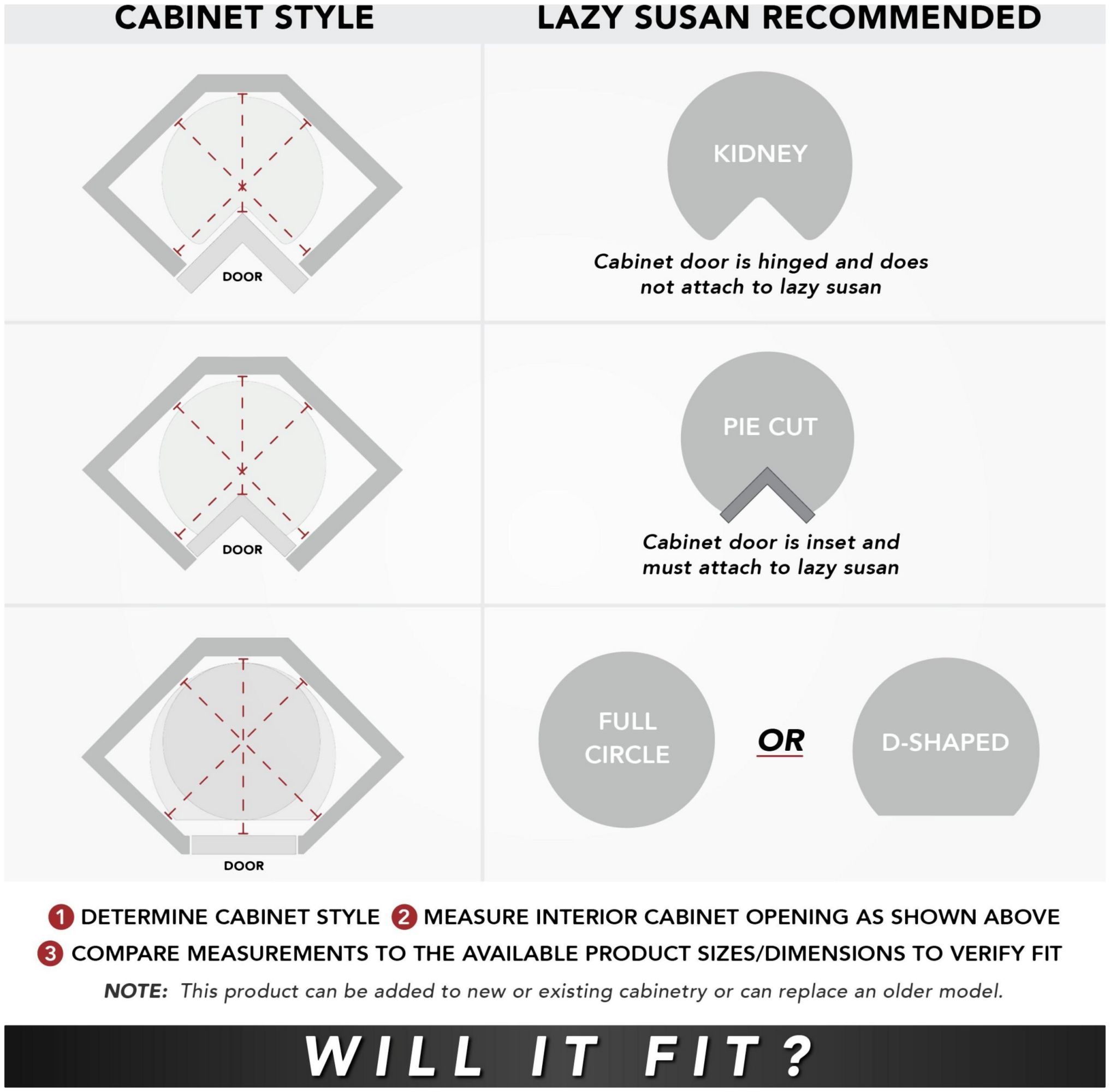 - Pie-cut lazy susans require a door to be attached to function correctly