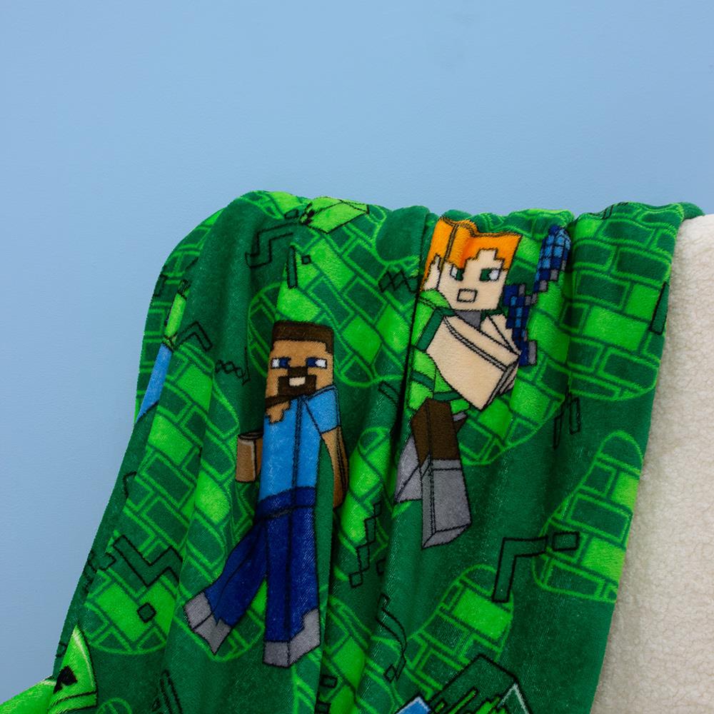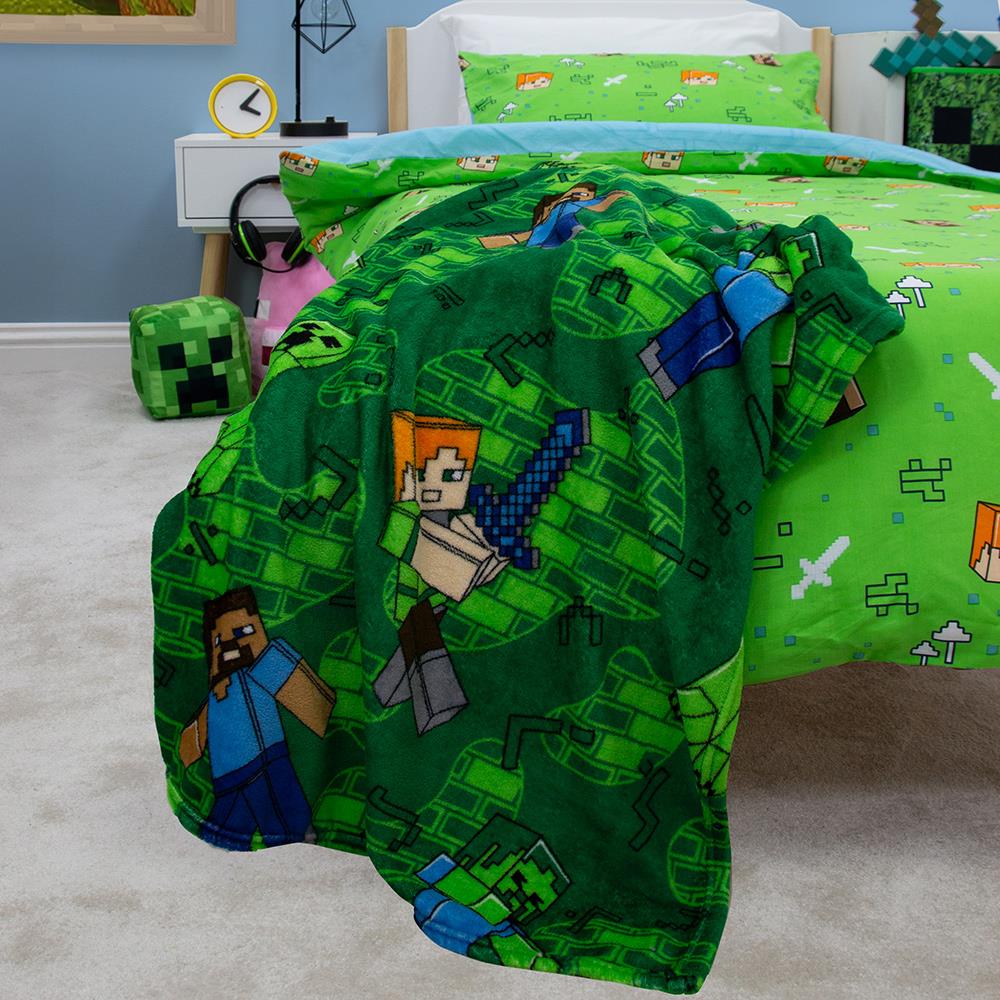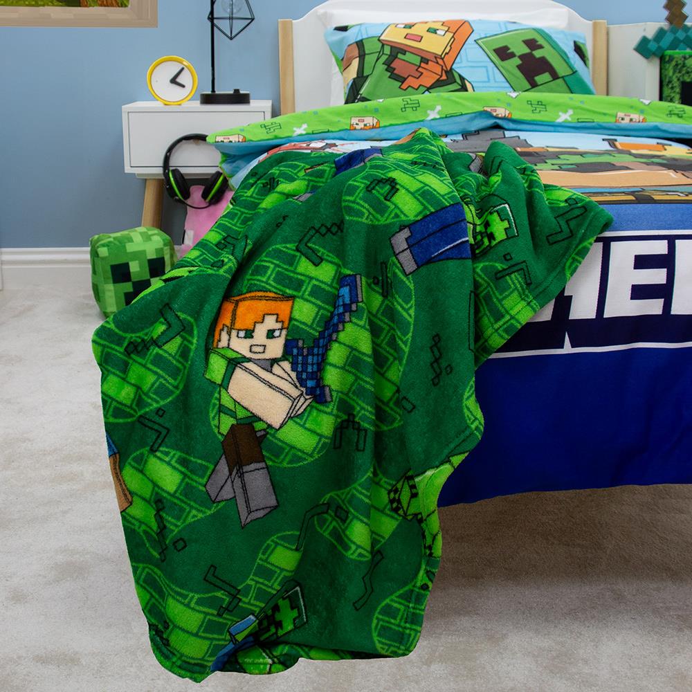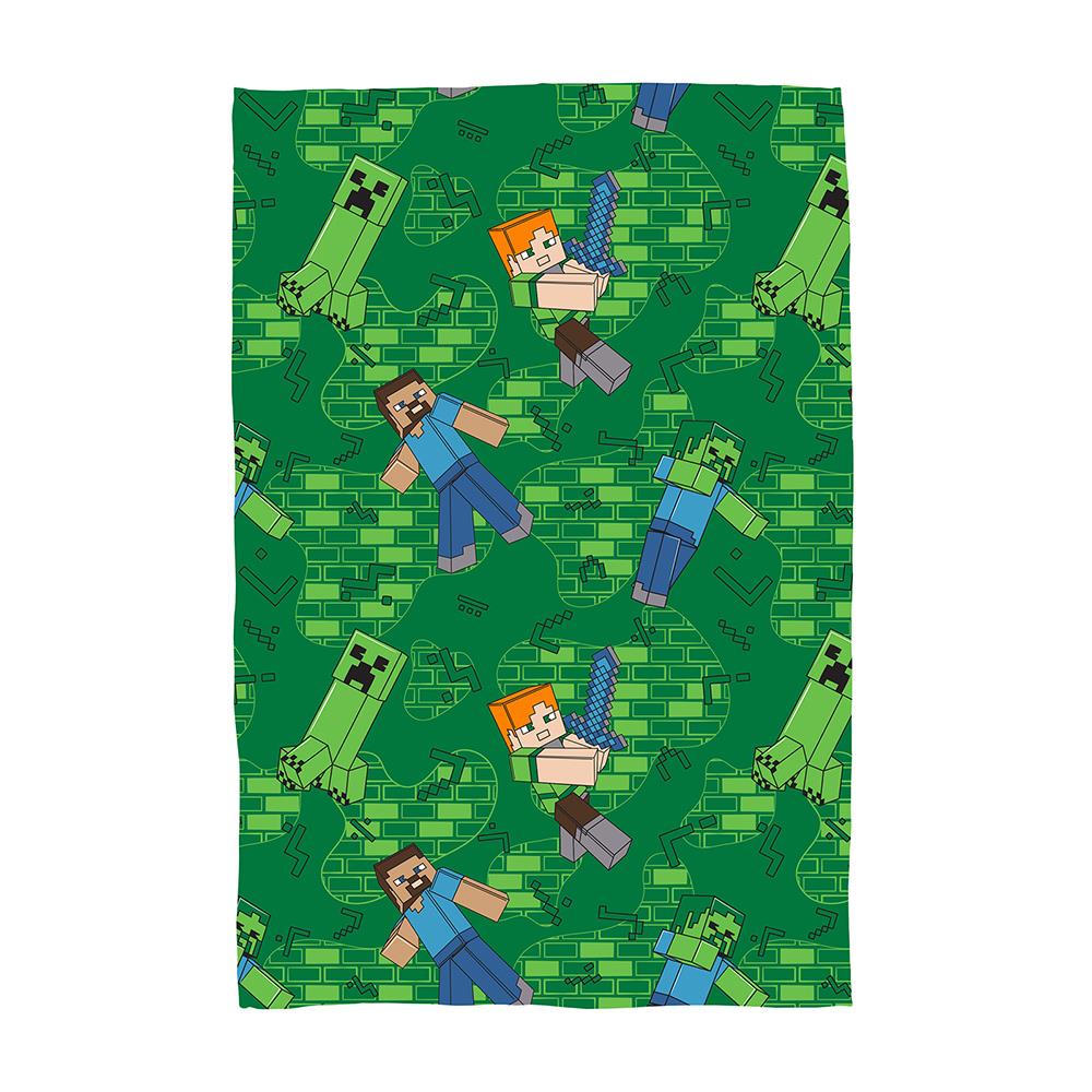 This Minecraft fleece blanket is suitable for Minecraft fans of all ages, whether it be for keeping warm and cosy whilst watching your favourite movie or to add an extra layer in bed. The design features a repeating pattern of Steve and Alex, with zombies and Creepers, set on a green background detailed with a brick motif. This soft blanket is machine washable and tumble dryer safe on a low setting.