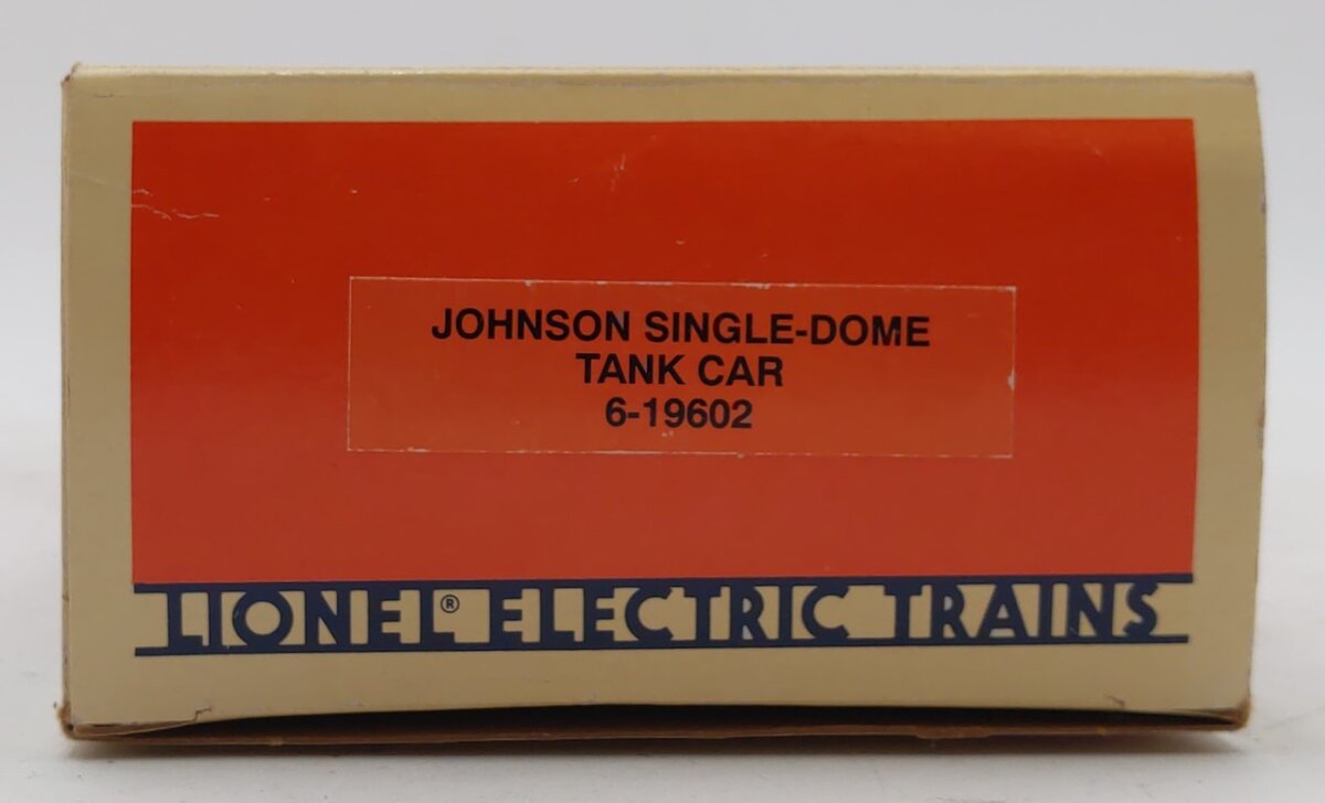 Here is a Lionel 6-19602 O Gauge Johnson Single Dome Tank Car #19602. This car features die-cast metal sprung trucks, die-cast metal operating knuckle couplers, metal wheels and axles.
