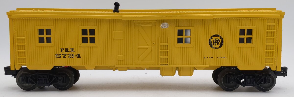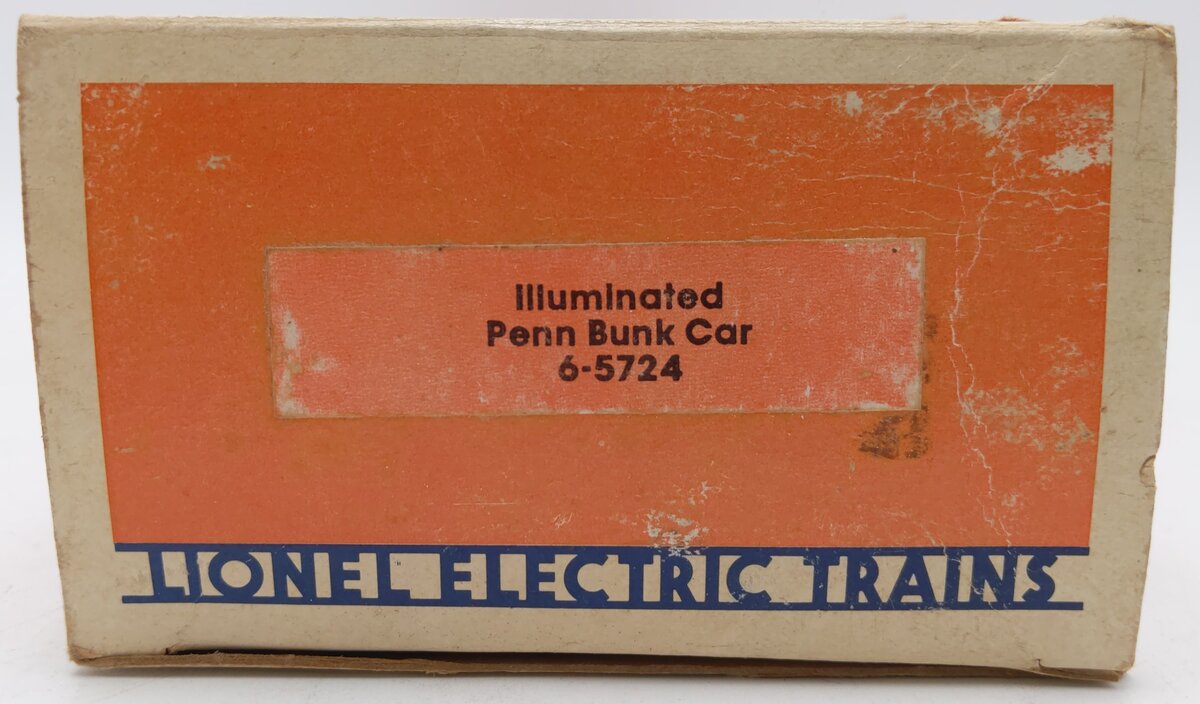 This is a Lionel 6-5724 O Gauge Pennsylvania Illuminated Bunk Car #5724 from 1984. This bunk car features interior illumination, plastic trucks, metal wheels and axles, and operating knuckle couplers.