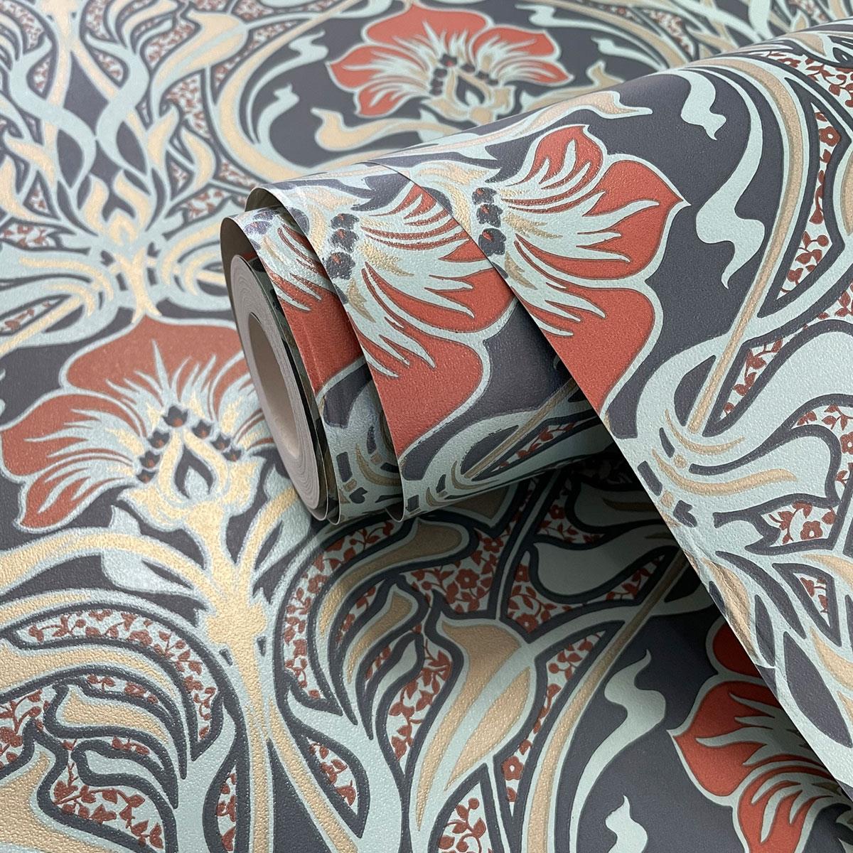 Ce papier peint Flora Nouveau de Crown donne une touche moderne à un papier peint classique à thème floral. Basé sur un dessin traditionnel des archives de Crown datant de 1910, le papier présente un motif floral audacieux de style damassé dans des tons de sarcelle, noir, rouille et or, avec certains éléments mis en valeur par un subtil éclat métallique. Ceci est superposé sur un petit imprimé floral en rouille sur un fond vert paon. Facile à appliquer, ce papier peint de haute qualité fera une belle déclaration dans votre maison.
