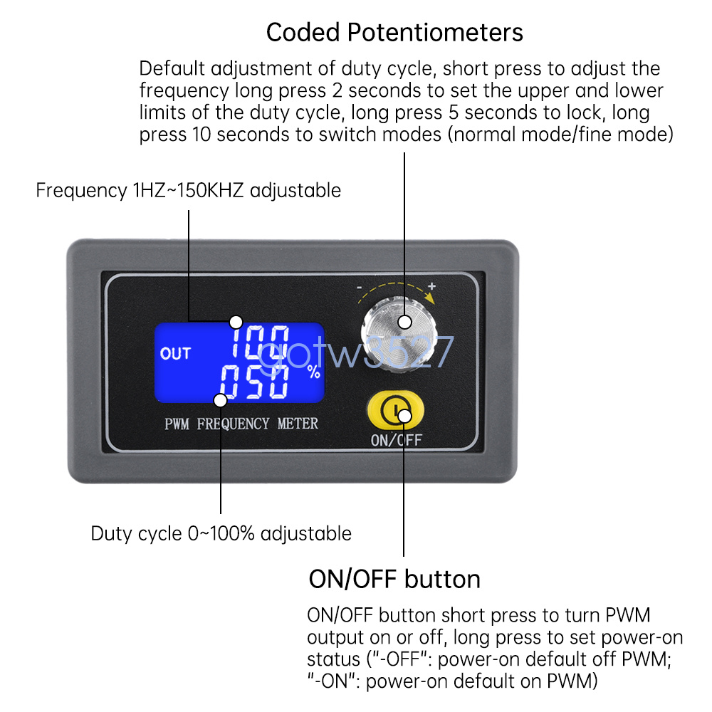 This product through the rotary potentiometer to adjust the frequency and duty cycle, according to the rotary speed judgment to achieve rapid adjustment, the default adjustment of the duty cycle, short press to adjust the frequency, long press 2 seconds to lock, long press 5 seconds to switch the mode (ordinary mode / fine mode), easy to operate, set up the parameters are automatically saved, power-down will not be lost.