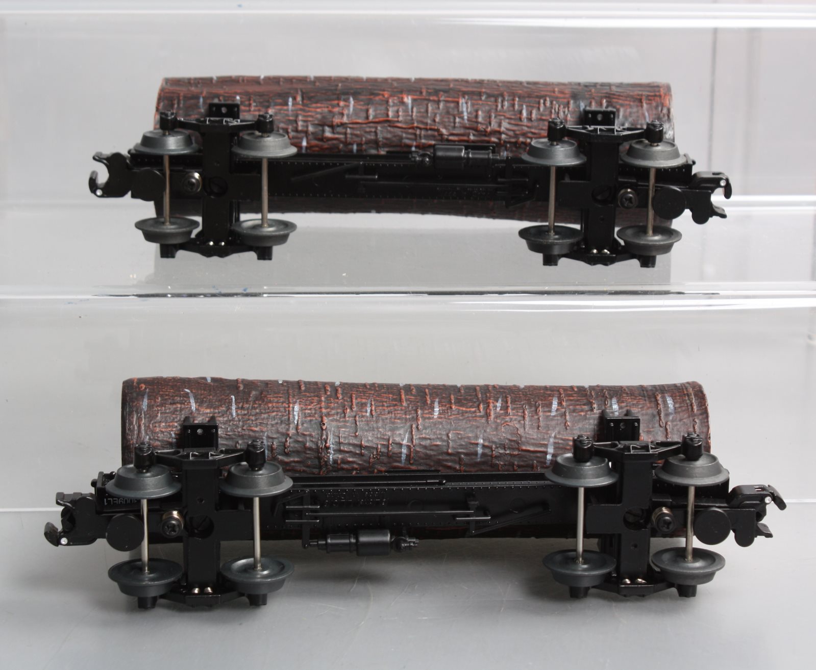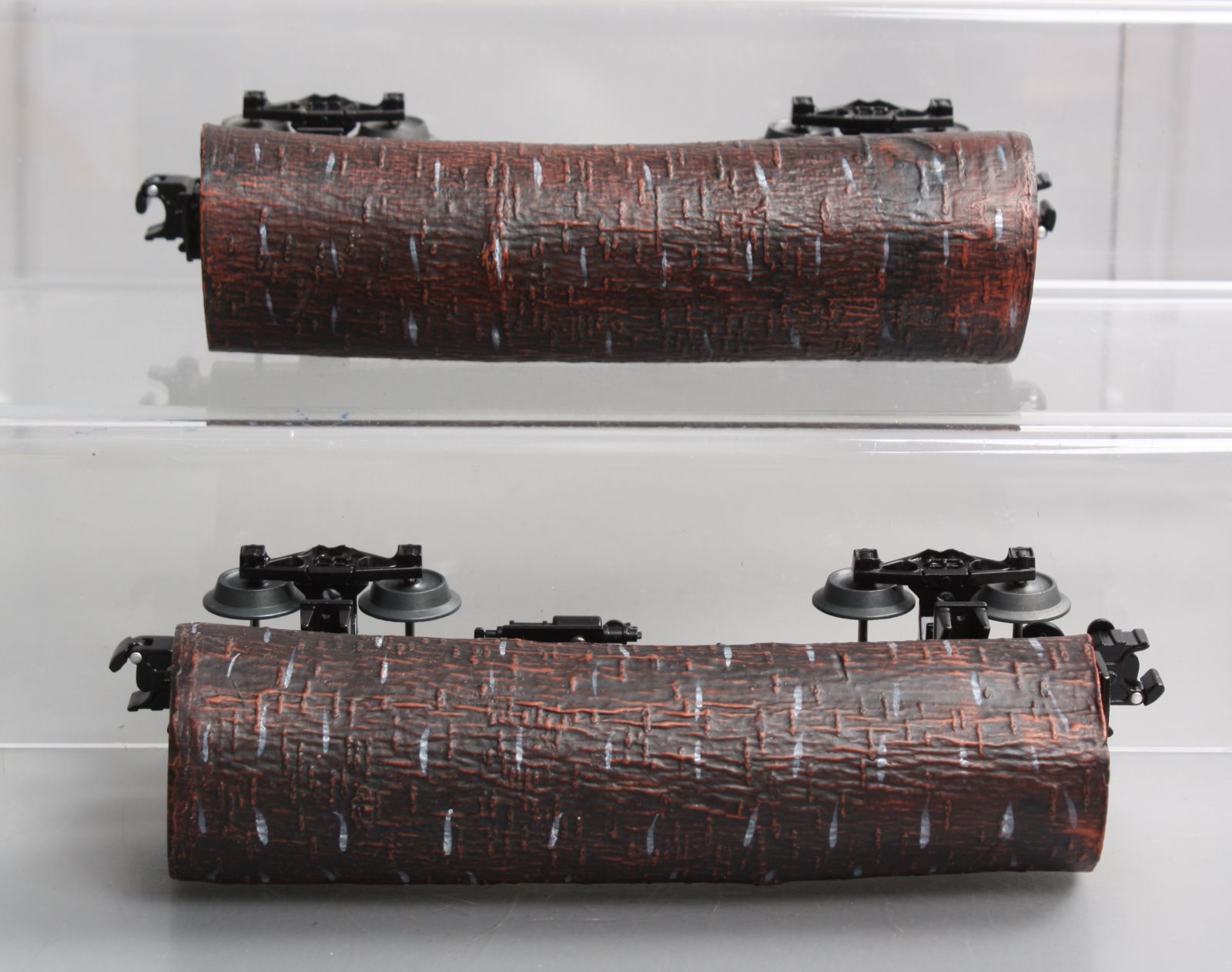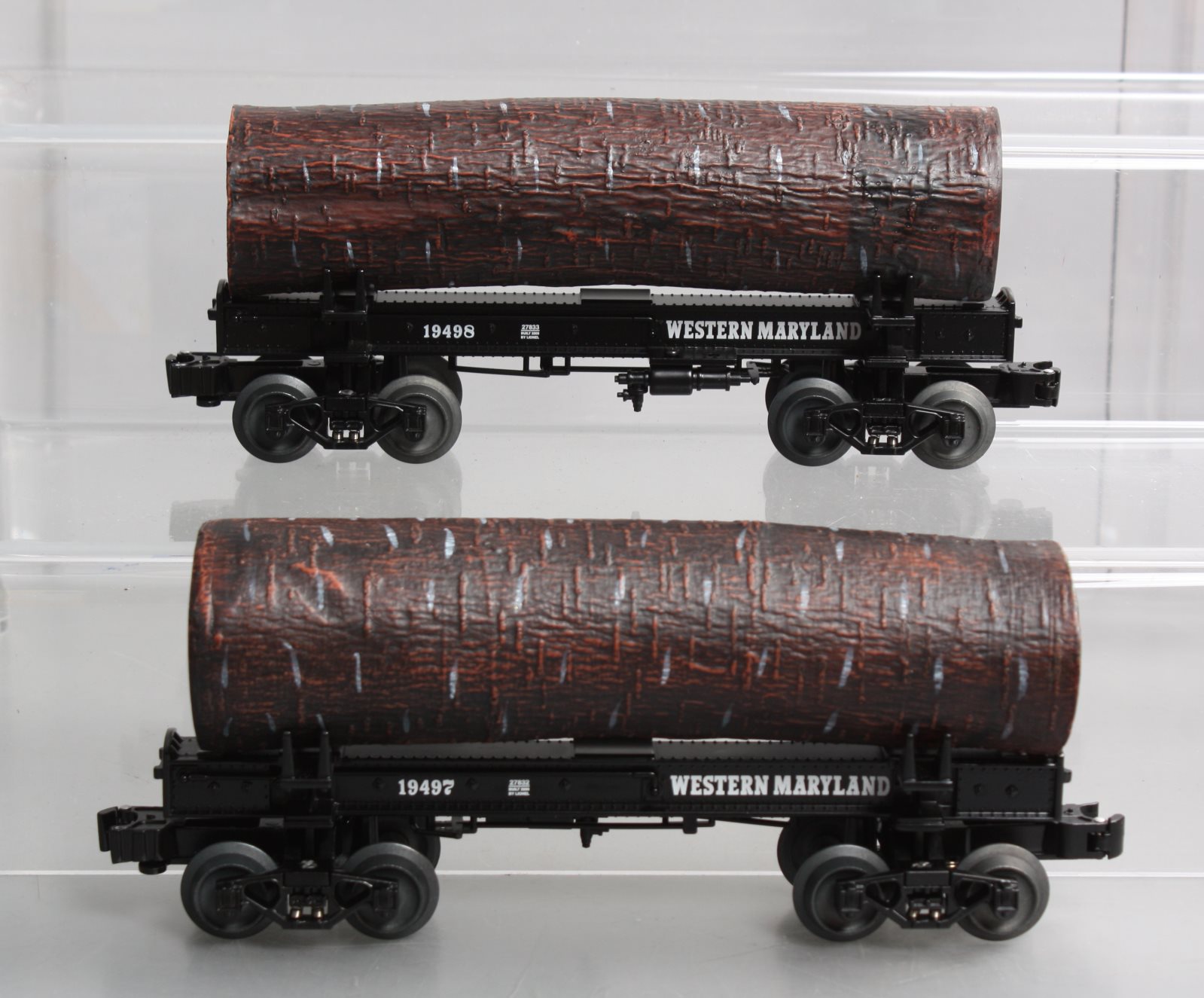 Here is a Lionel 6-27829 O Gauge Western Maryland Skeleton Log Cars #19497/19498 (2-Car Set). These cars are scale length and feature die cast trucks, removable loads, and hidden coupler tabs. They will not run on O-27 track.