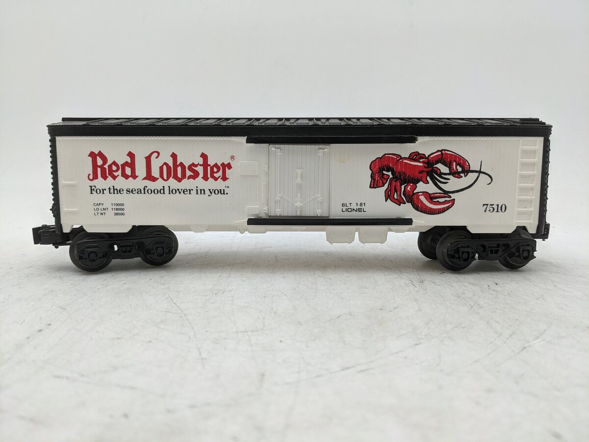 Here is a Lionel 6-7510 O Gauge Red Lobster Refrigerator Car. This car is the from the "Fast Food Freight" Set from 1981-82. The complete set includes the 8160 Burger King GP-20 Diesel, the 7509 KFC, 7510 Red Lobster, 7511 Pizza Hut, 7512 Arthur Treacher's, 7513 Bonanza, 7514 Taco Bell Refrigerator Car, and the 9449 Wendy's Caboose. It features sliding doors, plastic trucks, operating knuckle couplers, metal wheels and axles.