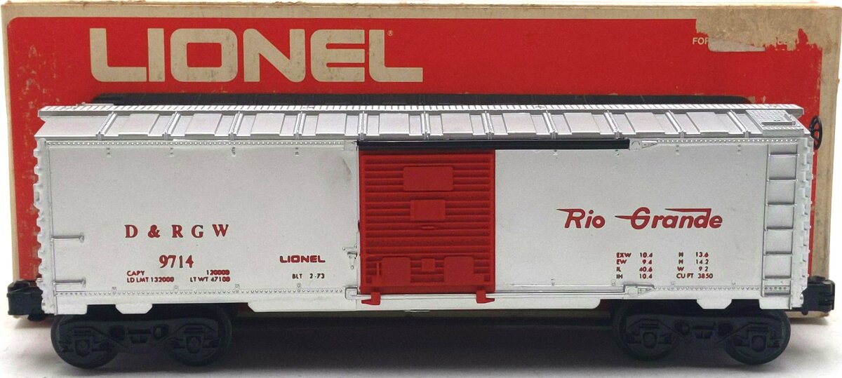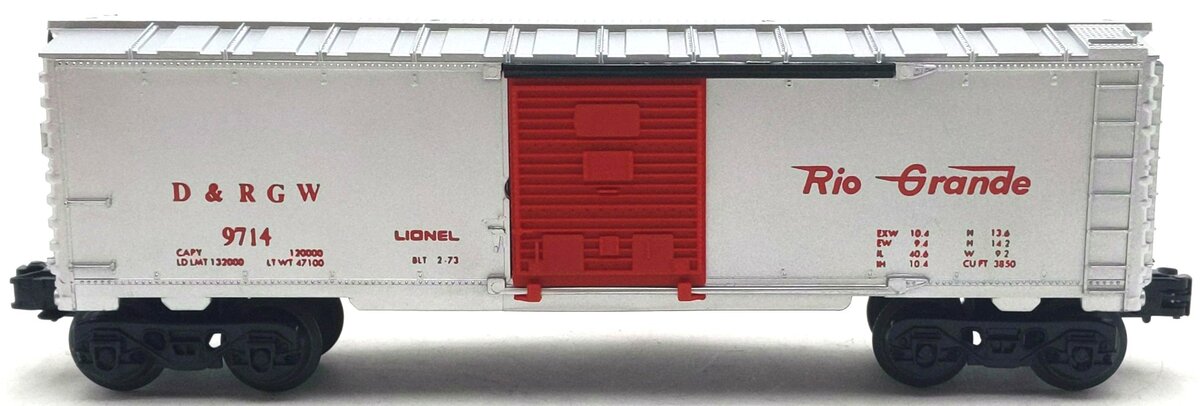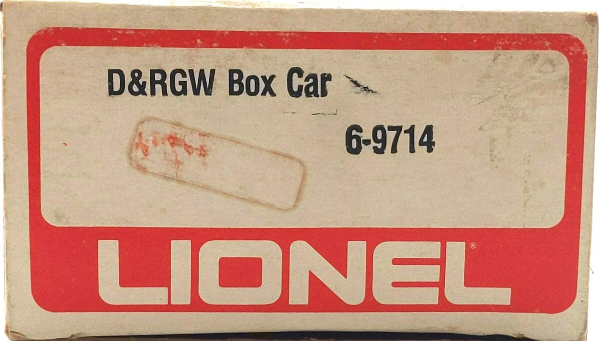 This is a Lionel 6-9714 O Gauge Denver & Rio Grande Western Box-car. This boxcar features sliding doors, plastic trucks, operating knuckle couplers, metal wheels and plastic axles. It measures approximately 10" long.