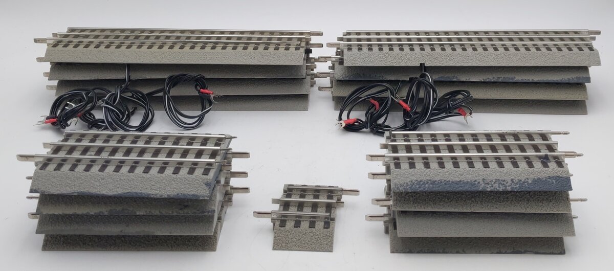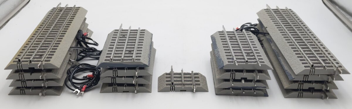 Here is an assortment of Lionel O Gauge FasTrack Straight Track Sections: 6-12040, 6-12016, 6-12073 [17]. These items feature plastic roadbeds and metal rails. Included in this assortment are [8] of the 6-12040 5 inch transition track sections, [8] of the 6-12016 10 inch terminal track sections, and [1] 1.75 inch track section.