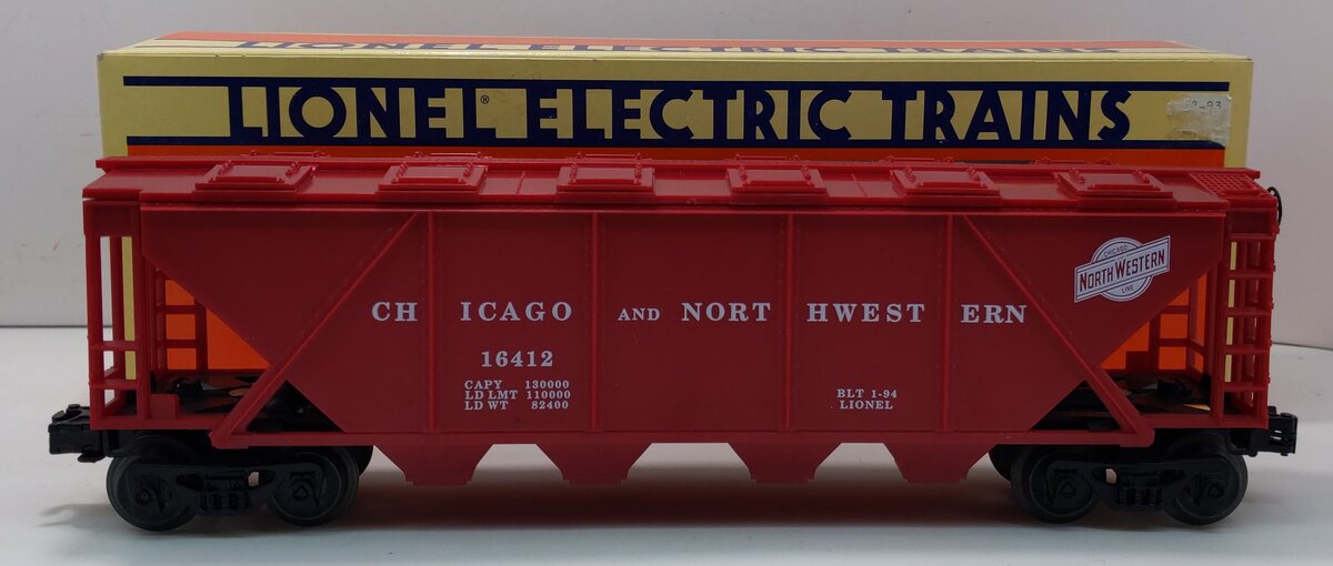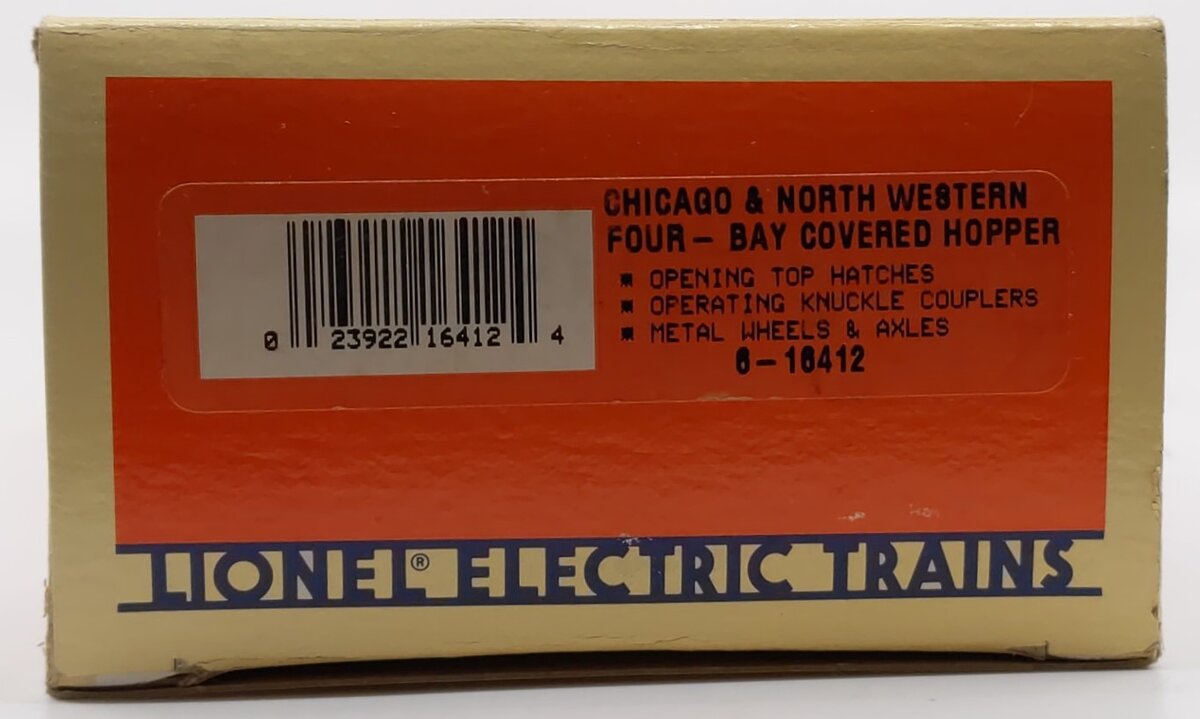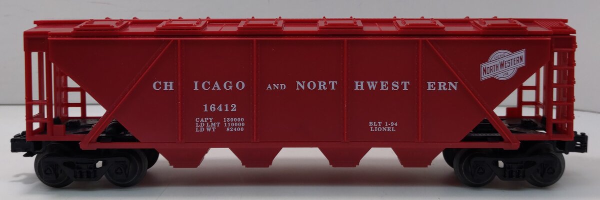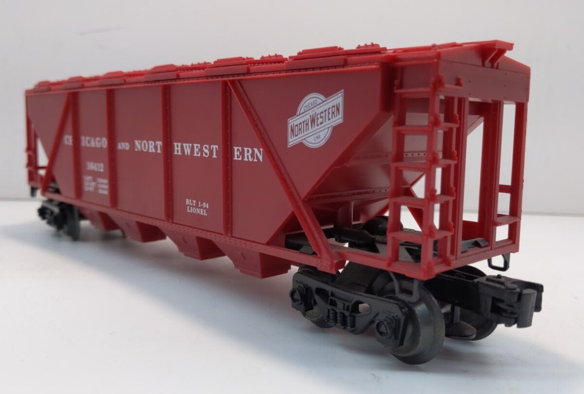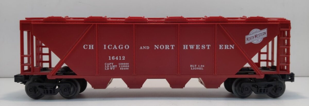 Here is a Lionel 6-16412 O Gauge Chicago & North Western 4-Bay Covered Hopper. It features opening top hatches, operating knuckle couplers and metal wheels and axles.