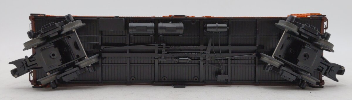 This car features a plastic construction with die-cast metal sprung trucks, metal wheels and axles, attractive painting, and operating metal knuckle couplers.