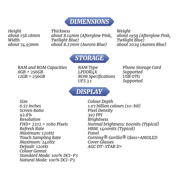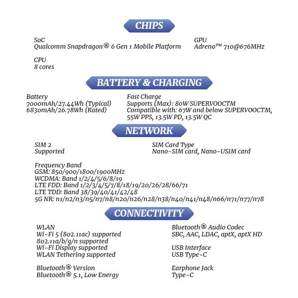 80W SUPERVOOC™ Flash Charge: High-speed charging technology that can take your phone from 1% to 100% in just approximately 64 minutes.