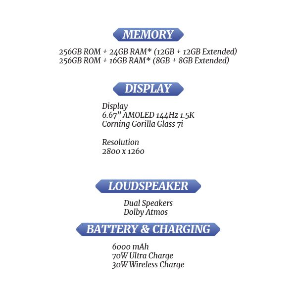 - Memory: 256GB ROM + up to 24GB RAM (12GB extended option)