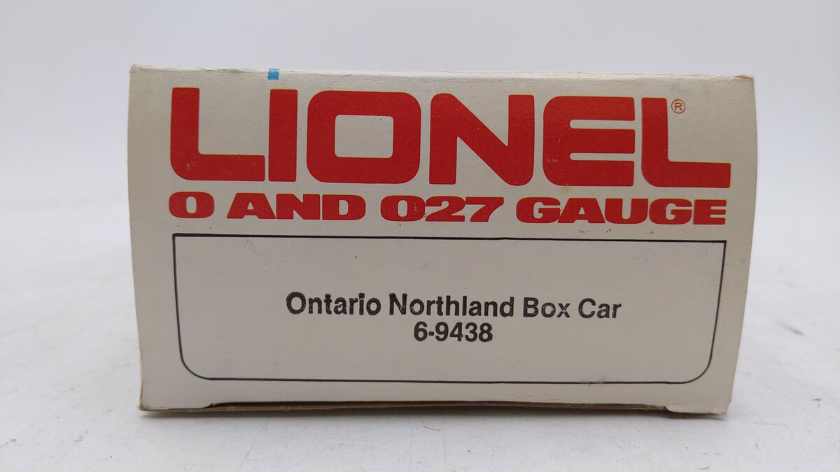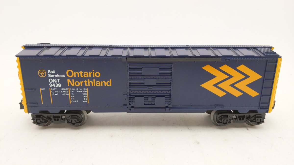 Here is a Lionel 6-9438 O Gauge Ontario Northland Box Car from 1981. This car features a plastic construction with sliding doors, a metal frame, plastic trucks, metal wheels and axles, molded details, and operating knuckle couplers.