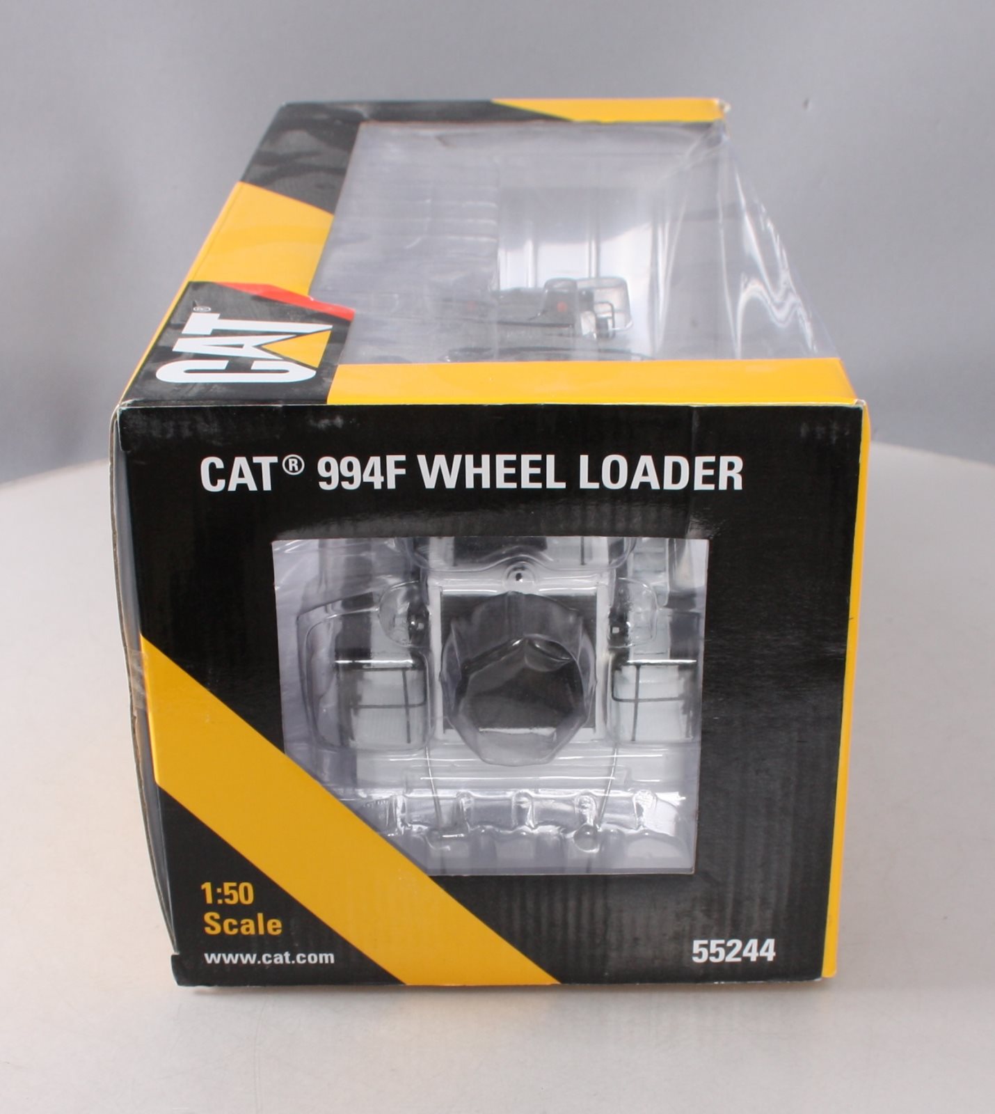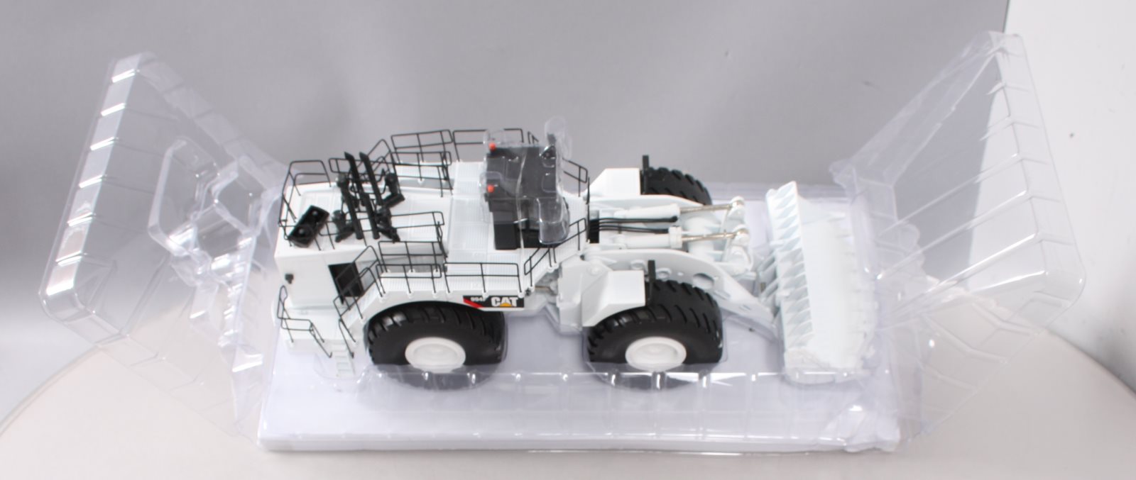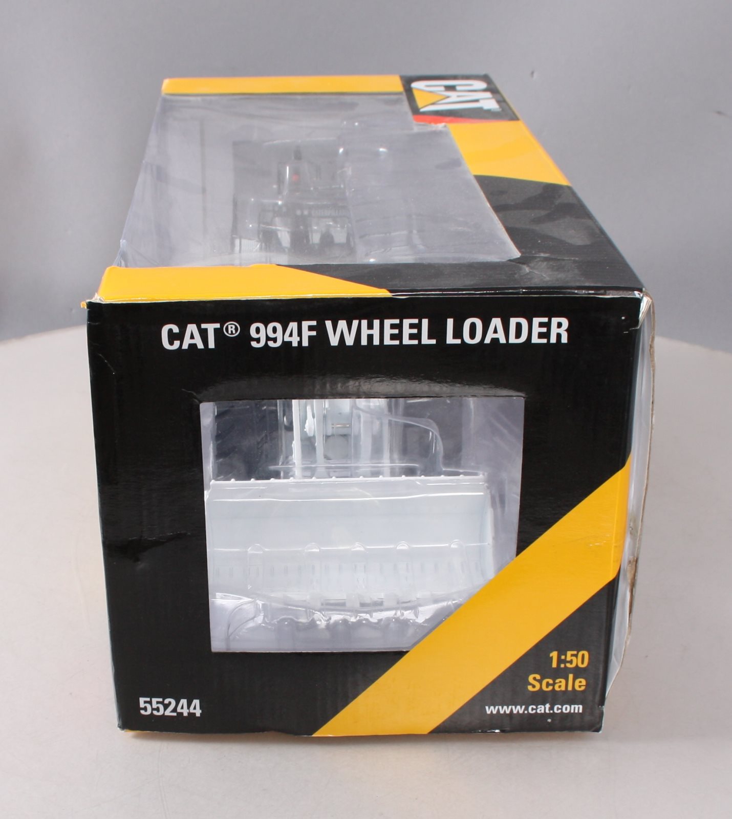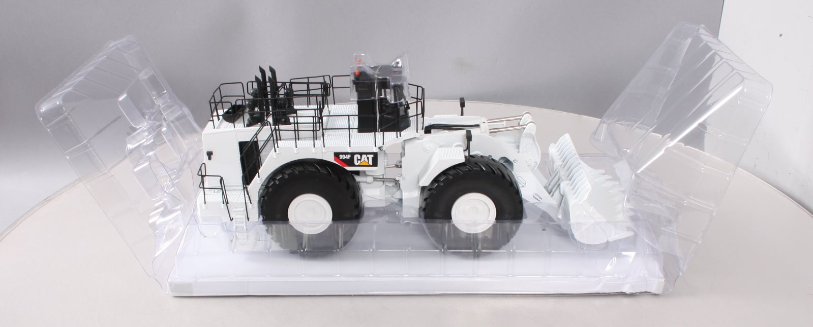 This is a Norscot 55244 1:50 Scale Die-Cast Caterpillar 994F Wheel Loader. Collectible die cast metal model CAT 994F wheel loader with articulated steering, boom raises and lowers, bucket scoops and dumps, wheels roll with actual tread design, rear wheels oscillate, metal railings and grab rails. Interior cab detail. Special white edition, limited run of 1250 pieces.