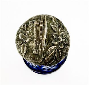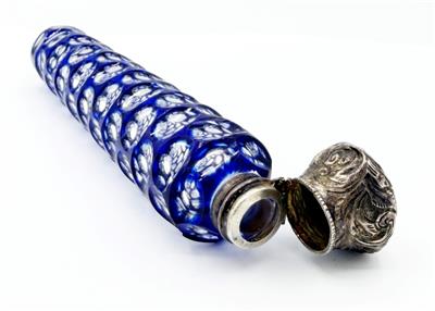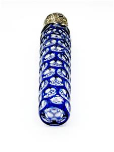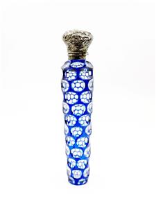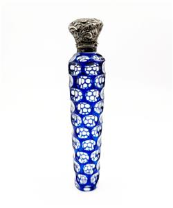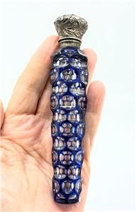Antique 1800s cobalt blue cut to clear glass perfume/scent bottle with sterling silver repousse cap, featuring a striker.