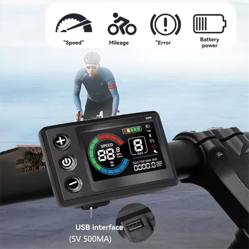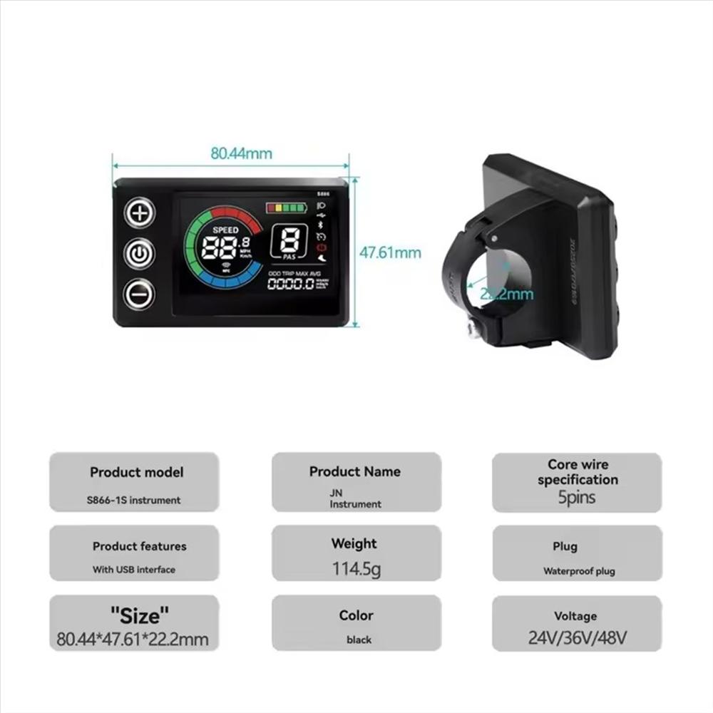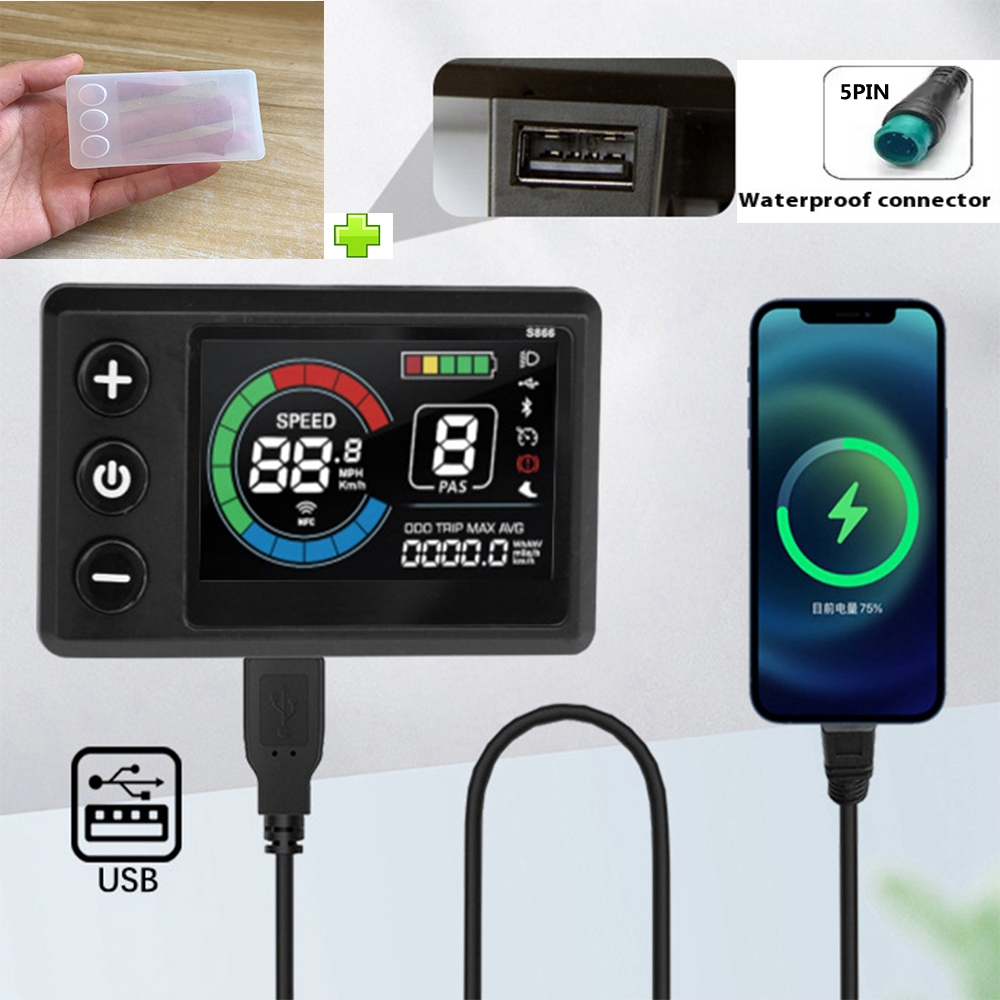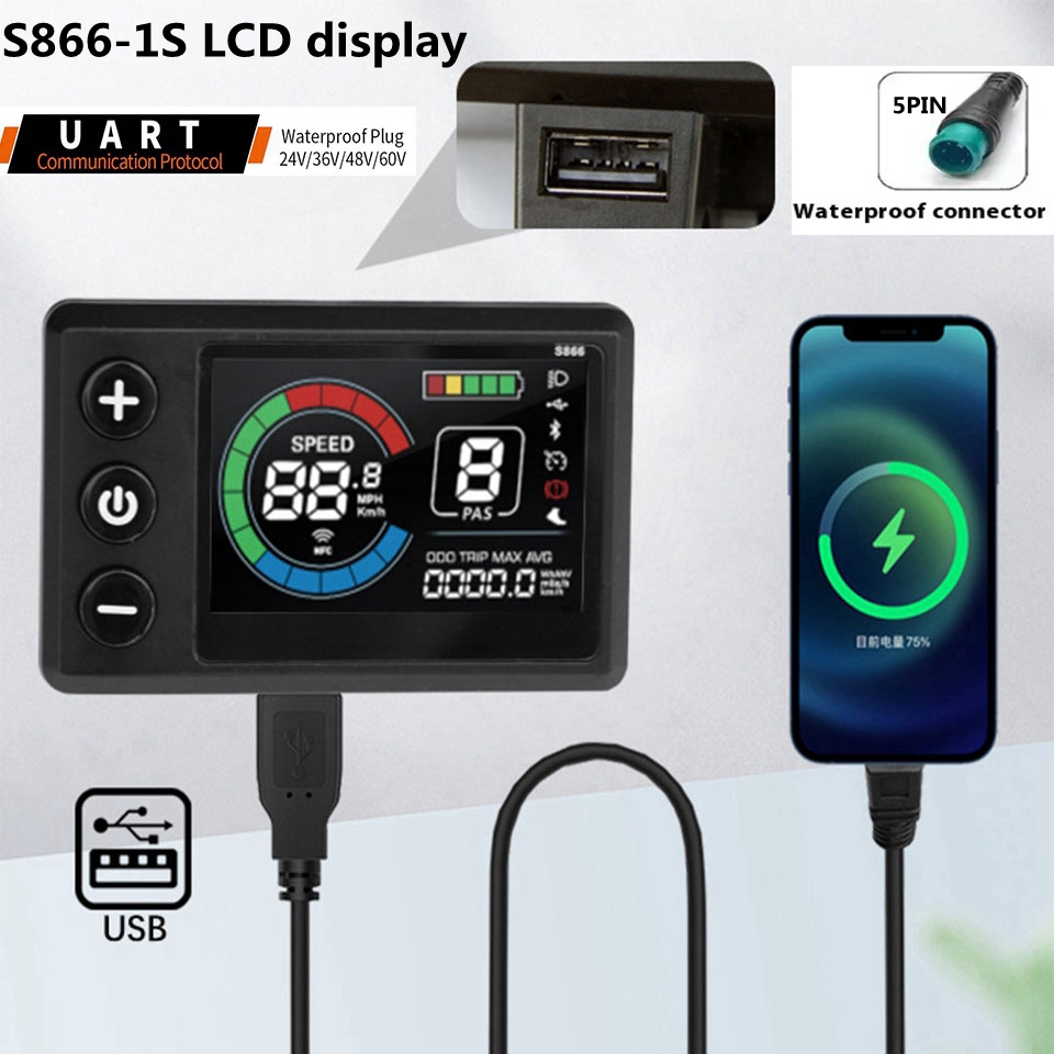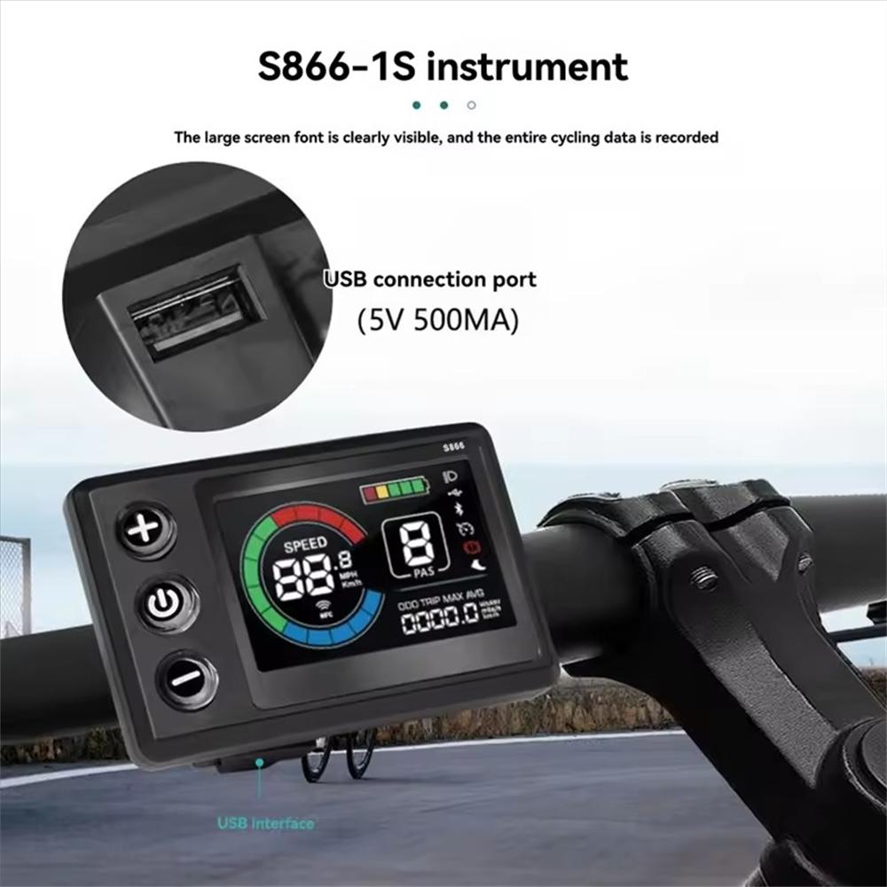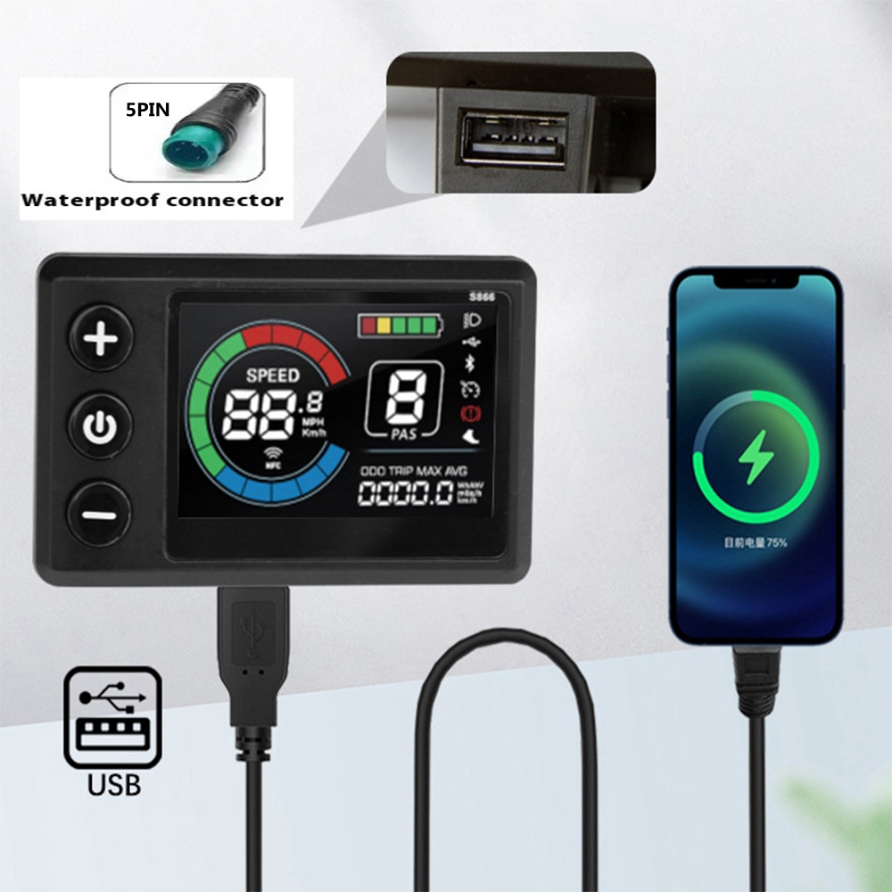 Specifications: Product Name: S866-1S Color display with USB Charging Port Material: ABS + LCD Screen Plug Specification: WP: 5PIN Cable Length: 1900mm Operating Voltage: 24V/36V/48V/60V Communication Protocol: UART USB Port Voltage: 5V 500mA
