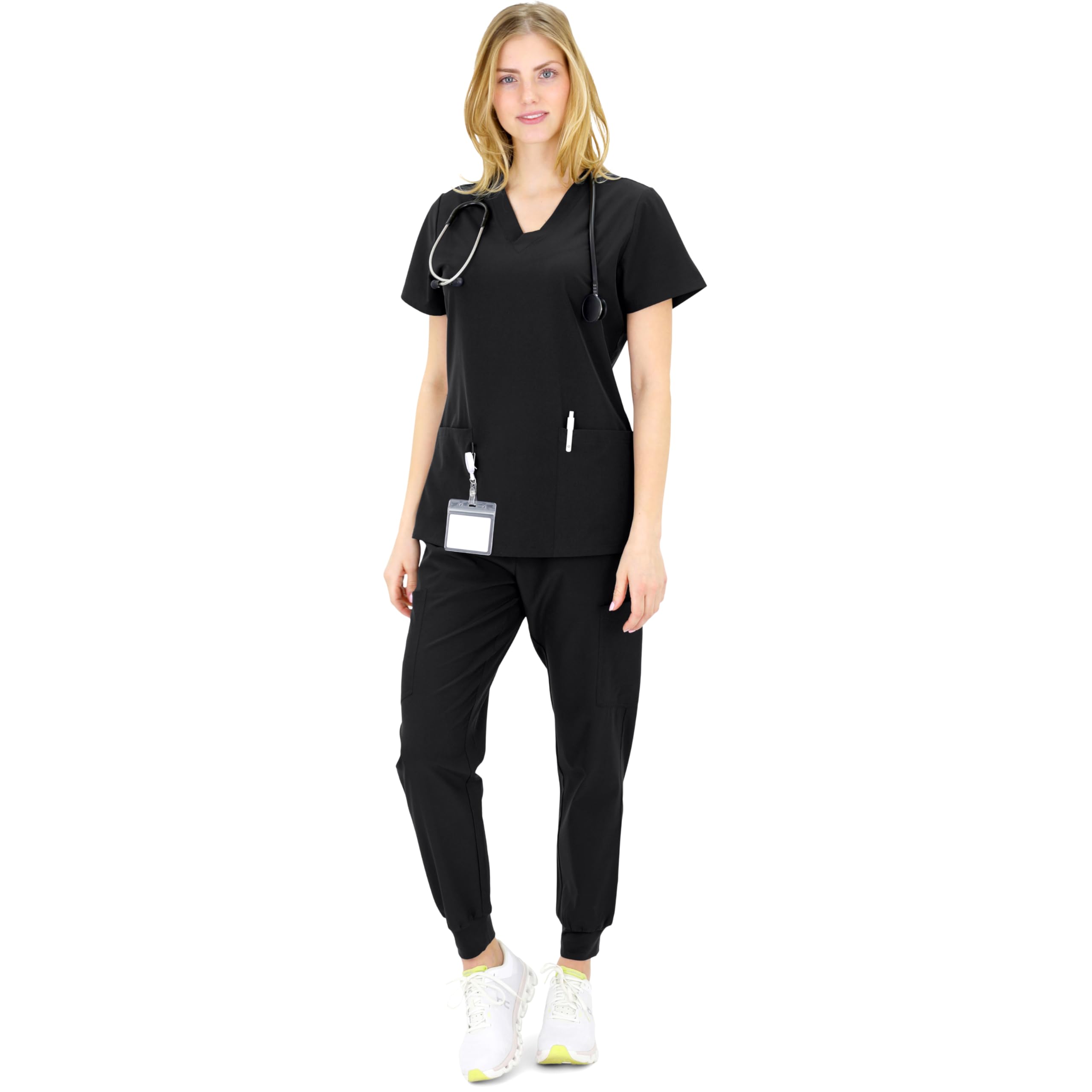 Dive into all-day comfort with ’ super soft, stretchy, and breathable scrubs set for women. Modern fit, packed with pockets, and lightweight fabric designed for function and all-day wear. The set comes with 1 curved v-neck scrub top and 1 pair of scrub jogger pants. With 15 pockets total, you are sure to stay on top of your game, with everything you need at your fingertips. The v-neck scrub top features 2 large front pockets, with 4 built-in hidden utensil pockets and 1 hidden cell pocket. The jogger bottoms feature 2 back pockets, 3 cargo pockets, 1 hidden pocket and 2 side pockets. Our Scrub Set is a tailored fit featuring back princess seams and side vents for premium comfort. The mid-rise joggers feature a soft yoga waistband and drawstring. Durable, stylish and comfortable, our scrub set is made to last. Our scrub set for women is crafted from high-quality performance twill fabric, allowing you to feel fresh, cool and comfortable during a long shift. Easy to care for and quick drying, this Scrub Set features a 4 way stretch design. Start your shift off right!