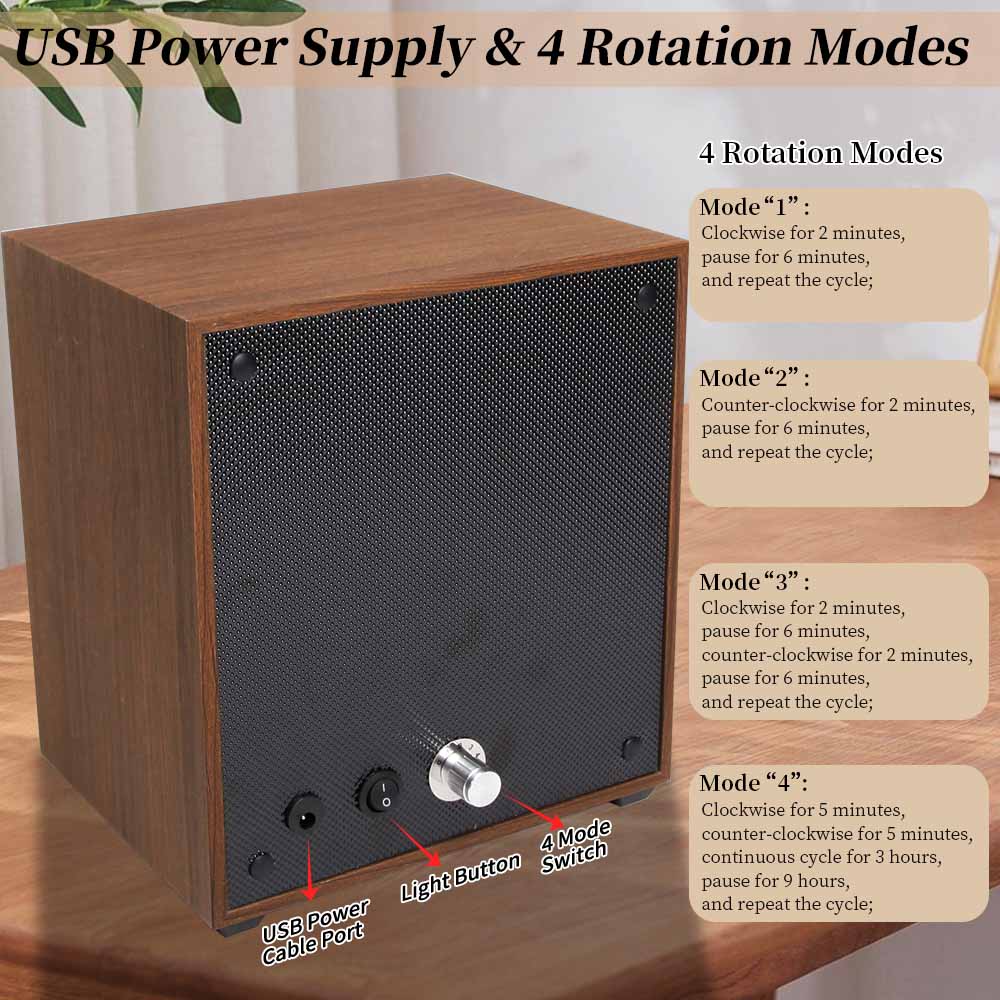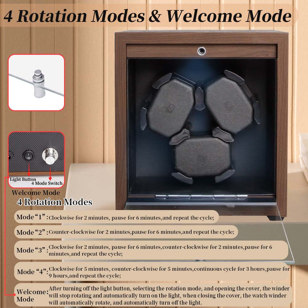 Welcome mode: When the glass cover is opened, the watch winder will stop rotating, which is convenient to take the watch, and automatically turn on the LED atmosphere light, cover the glass cover to automatically work, and actively turn off the LED atmosphere light. You can make the LED lights stay on through the light switch.