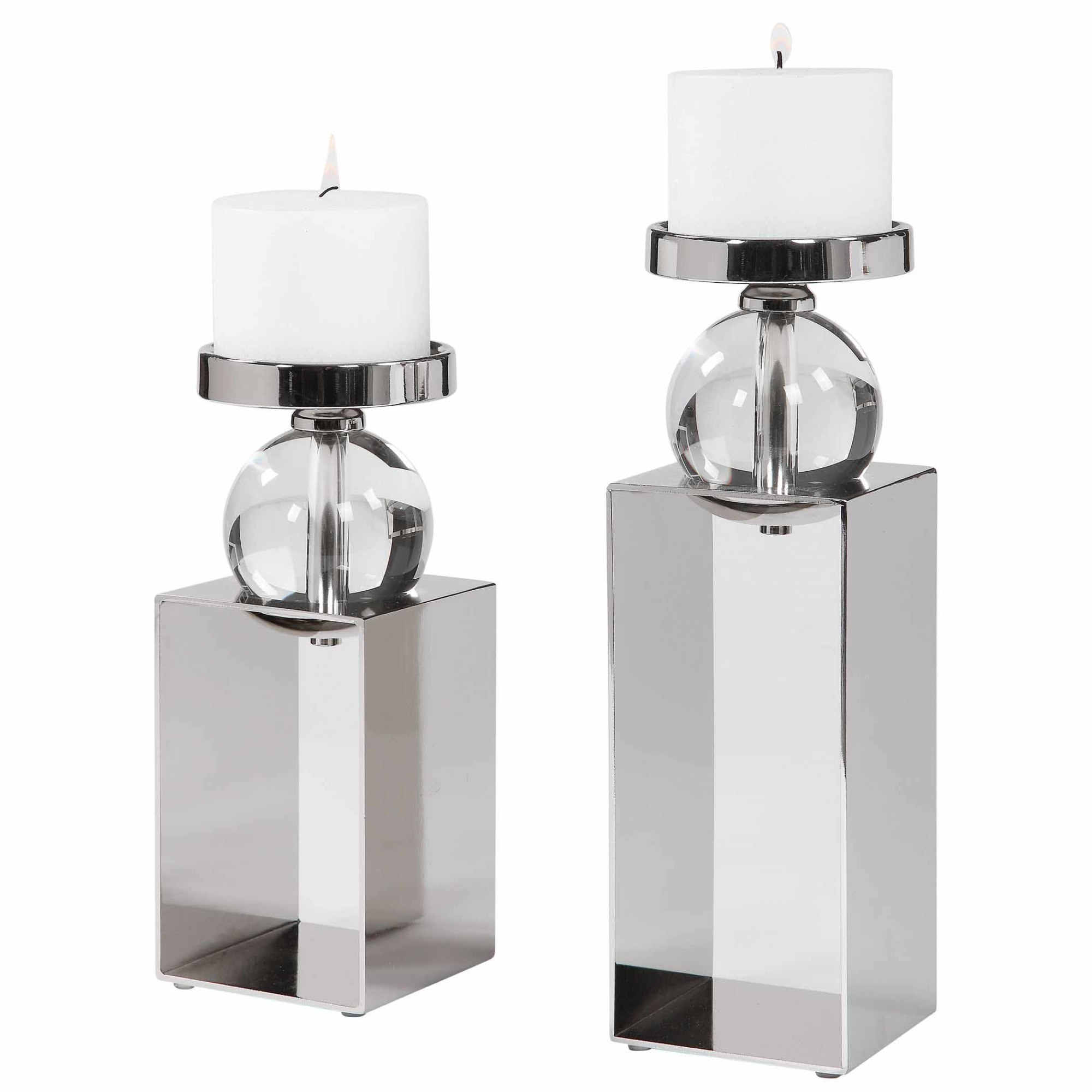 - Set of two candleholders featuring an open steel frame with crystal accents
