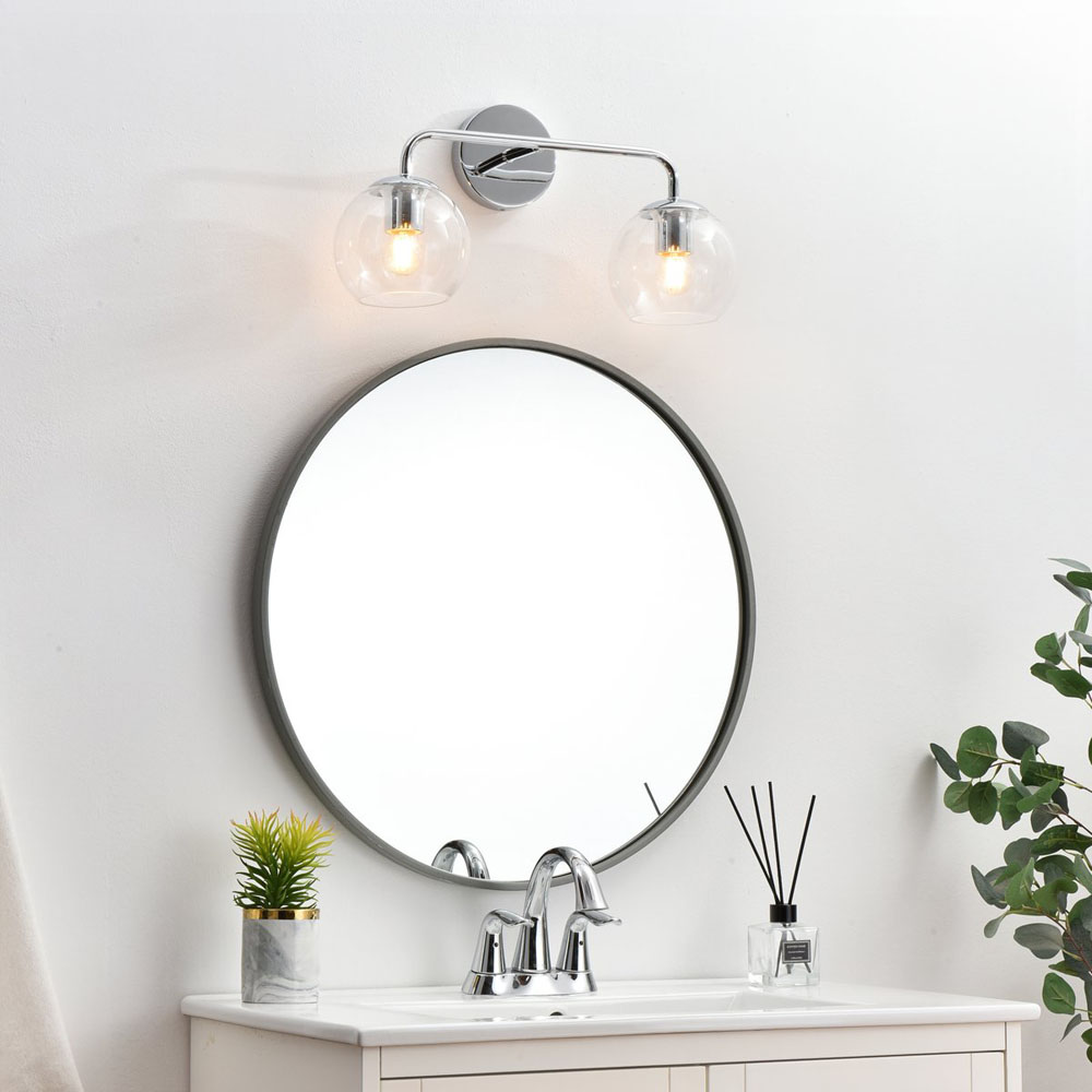 Item DescriptionA modern twist on a traditional design, this vanity light is perfect for sprucing up your bathroom. Rated for use in damp locations, this iron fixture features a round backplate, curved arms, and orb accents. Completely versatile, you can place this wall light as an uplight or downlight. Rated for use in damp locations, this will work perfectly over a vanity in your bathroom.