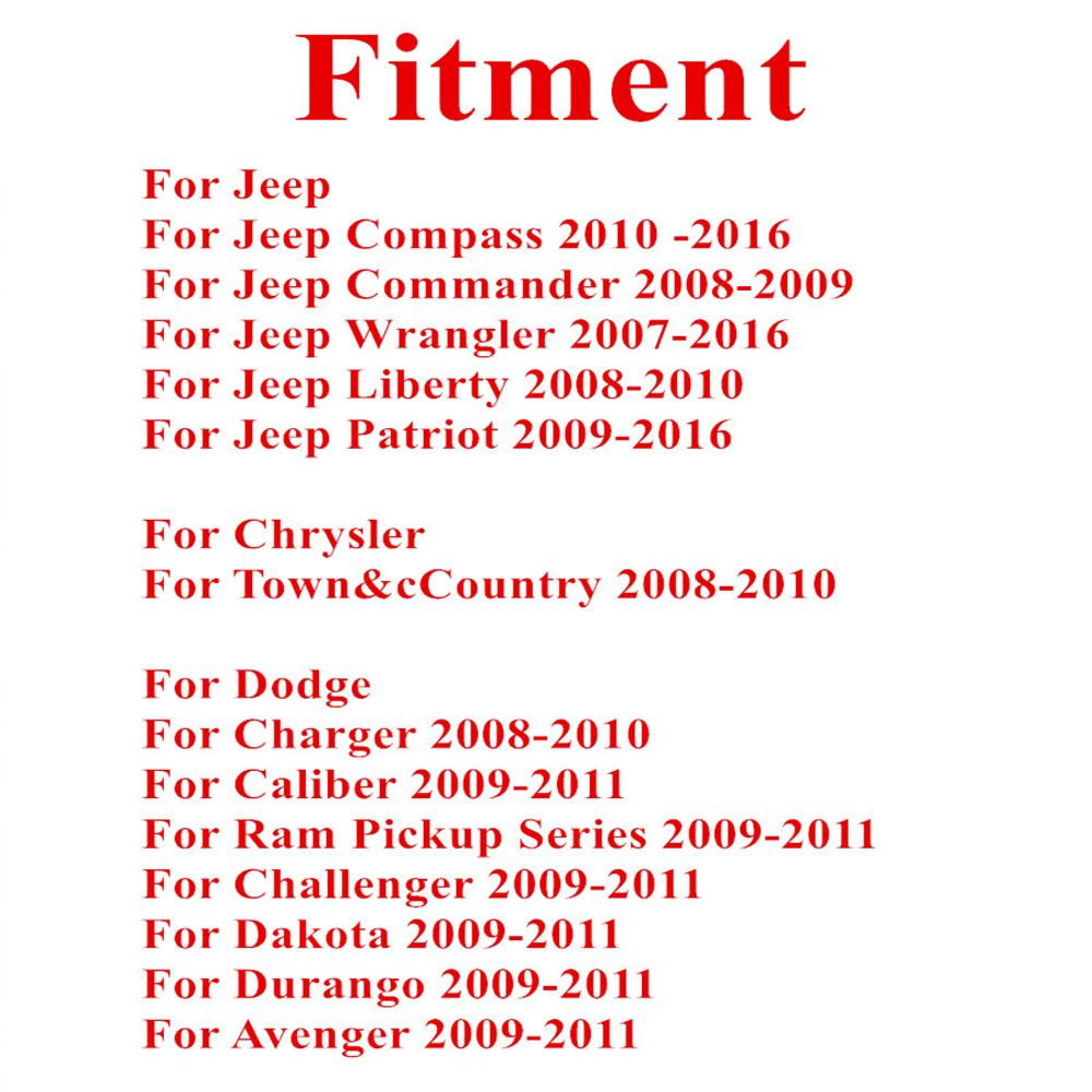 | Fitment | - For Jeep For Jeep Compass 2010 -2016 For Jeep Commander 2008-2009 For Jeep Wrangler 2007-2016 For Jeep Liberty 2008-2010 For Jeep Patriot 2009-2016 - For Chrysler For Town&cCountry 2008-2010 - For Dodge For Charger 2008-2010 For Caliber 2009-2011 For Ram Pickup Series 2009-2011 For Challenger 2009-2011 For Dakota 2009-2011 For Durango 2009-2011 For Avenger 2009-2011 |