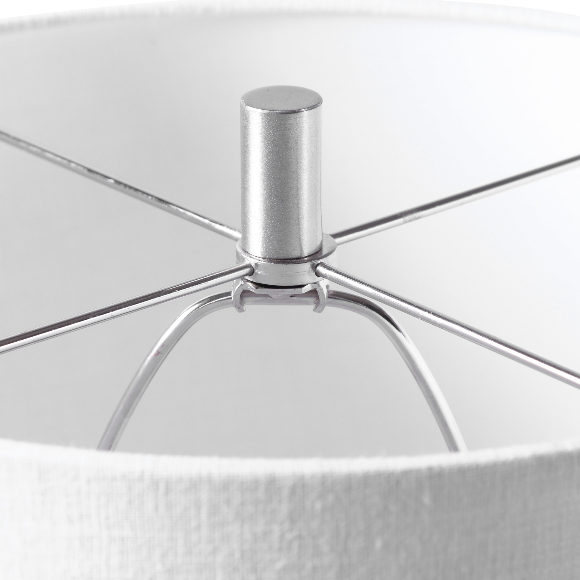 - The lamp is paired with a tapered round hardback shade in an off-white linen fabric with light slubbing