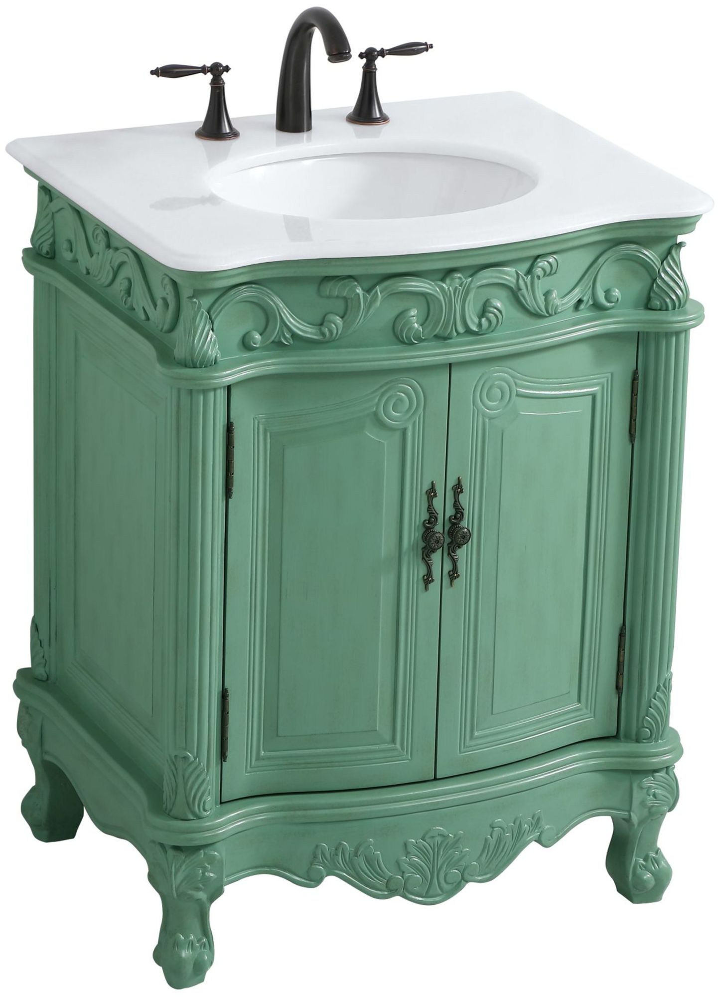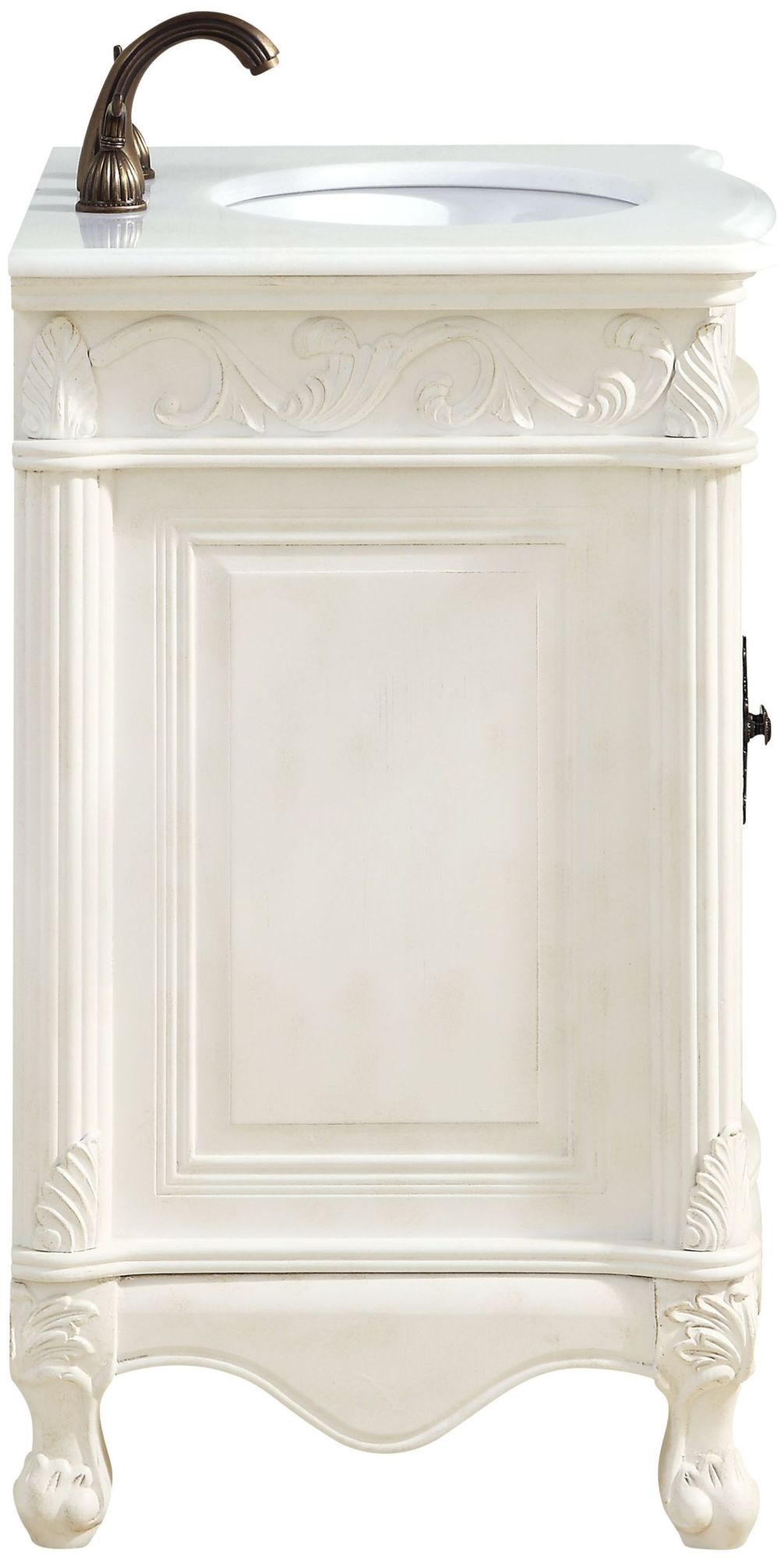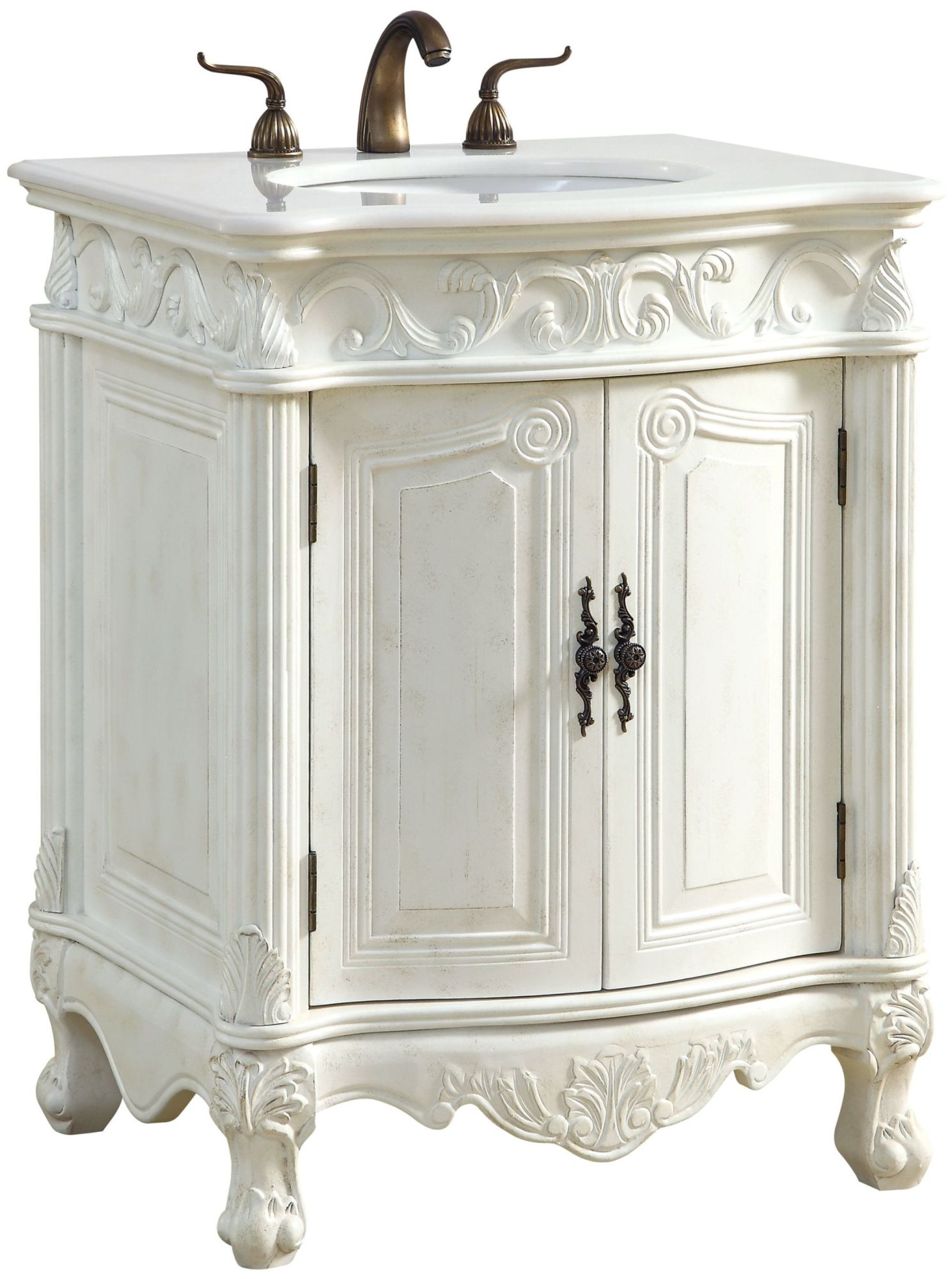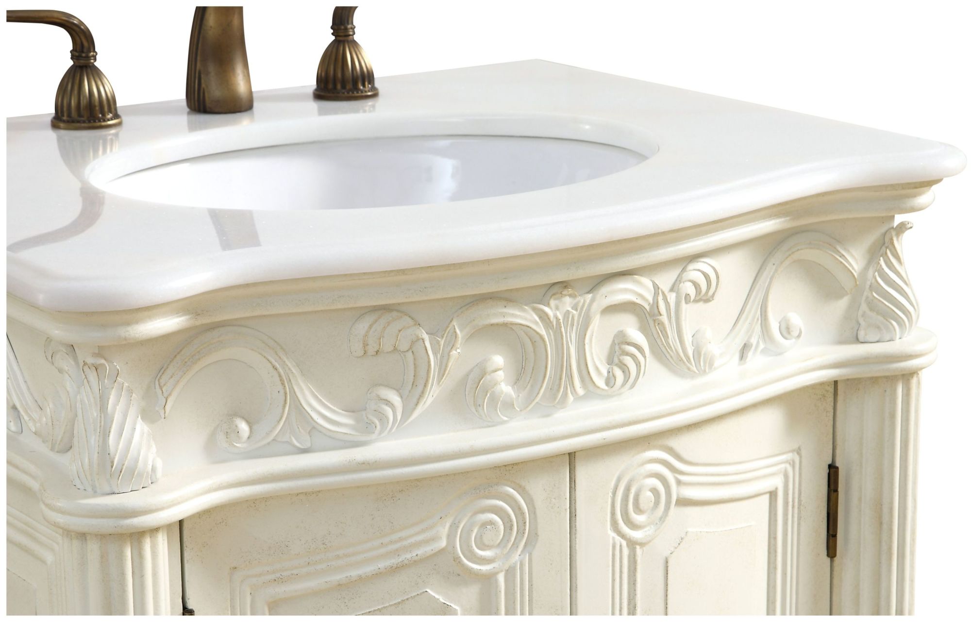 Item DescriptionThis superb balance of timeless tradition and opulent beauty in a quartz-topped vanity will certainly enhance the aesthetics of any home or office bathroom! Featuring a durable quartz countertop complementing the hand painted cabinet with a delicate carved floral design, stands on stylishly carved solid wood French scroll feet. Don't let the design fool you: the quartz countertop and porcelain undermount sink allows for space to get ready, while the antique bronze hardware allows you to discover storage spaces with ease. You and your guests will marvel at this vanity that will both store away your bathroom essentials and enhance the aesthetics of your room.