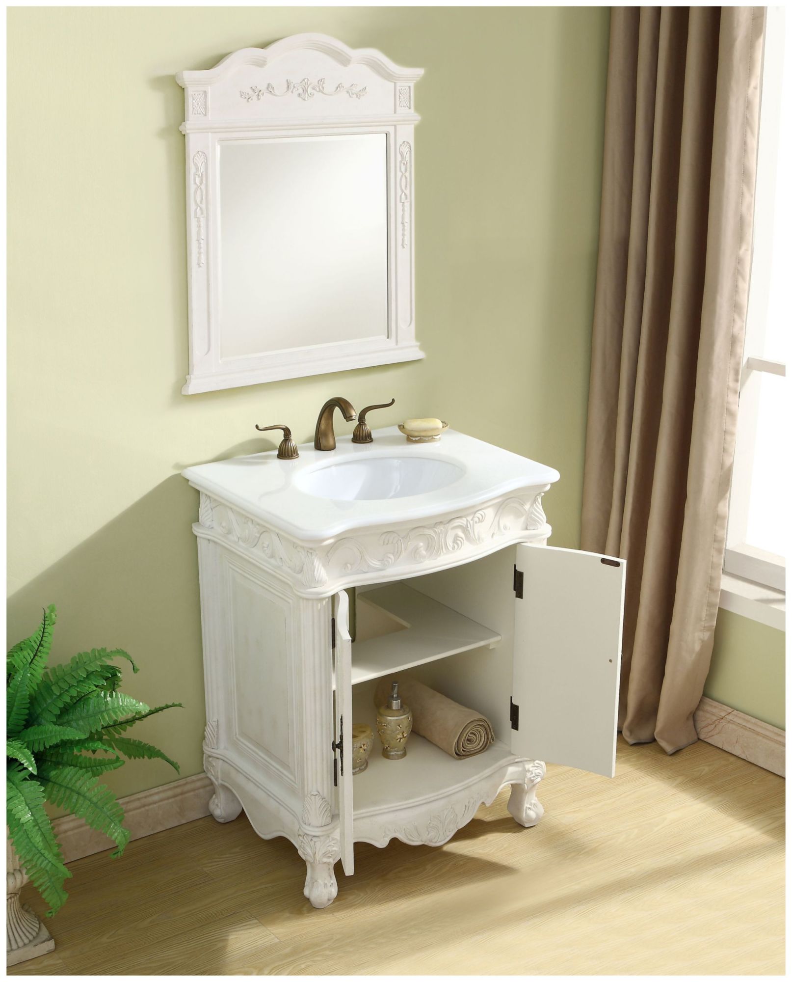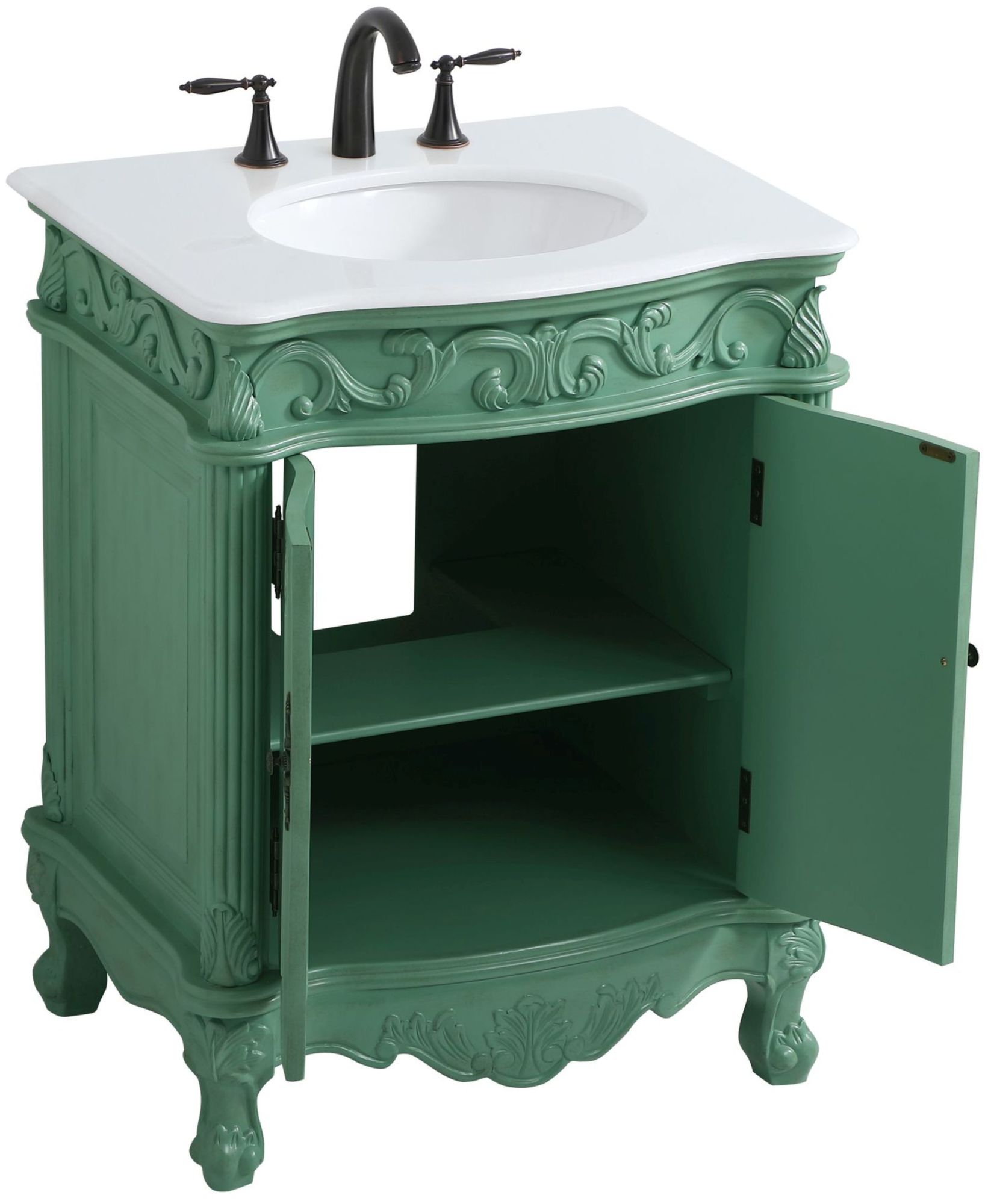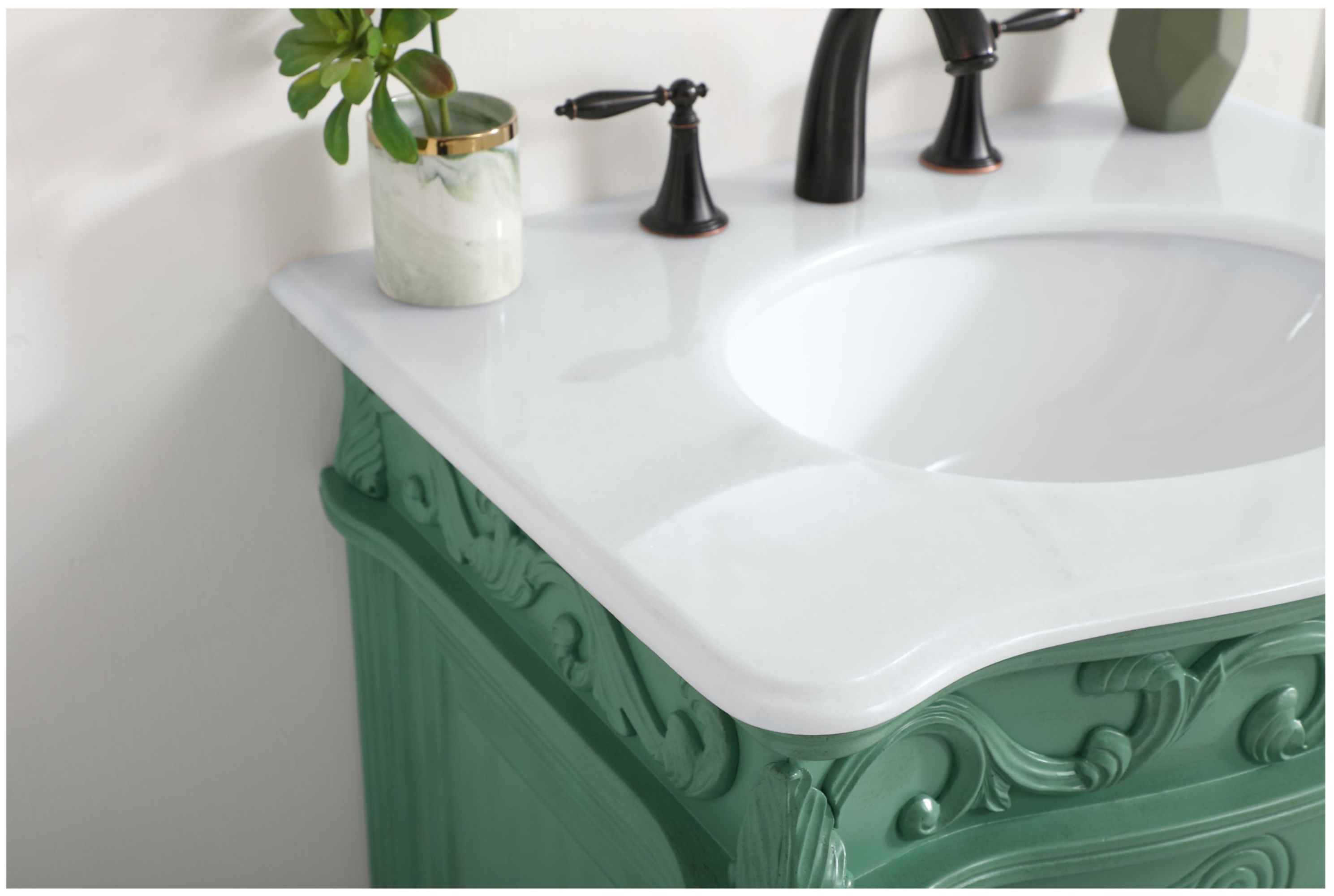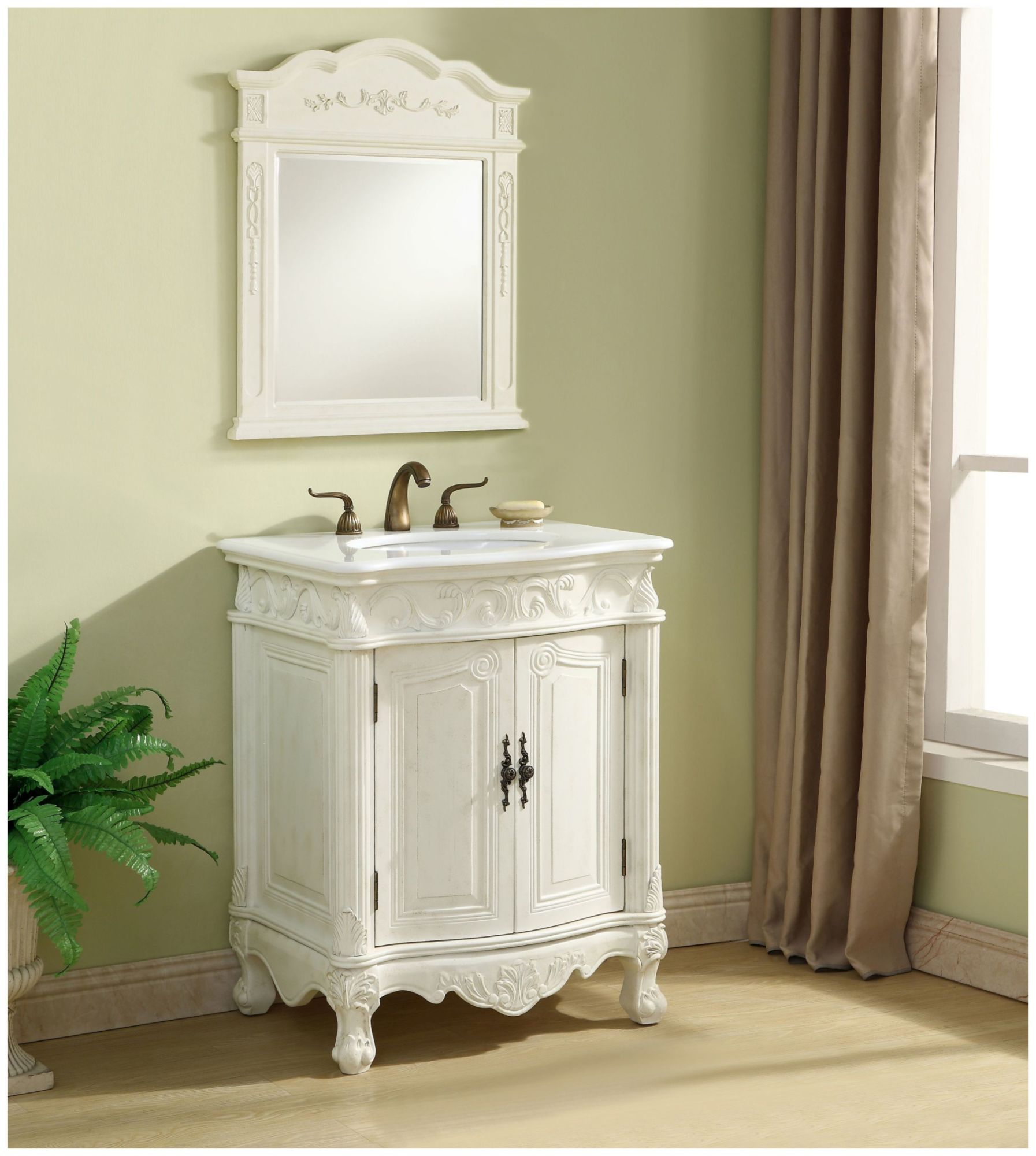 Item DescriptionThis superb balance of timeless tradition and opulent beauty in a quartz-topped vanity will certainly enhance the aesthetics of any home or office bathroom! Featuring a durable quartz countertop complementing the hand painted cabinet with a delicate carved floral design, stands on stylishly carved solid wood French scroll feet. Don't let the design fool you: the quartz countertop and porcelain undermount sink allows for space to get ready, while the antique bronze hardware allows you to discover storage spaces with ease. You and your guests will marvel at this vanity that will both store away your bathroom essentials and enhance the aesthetics of your room.