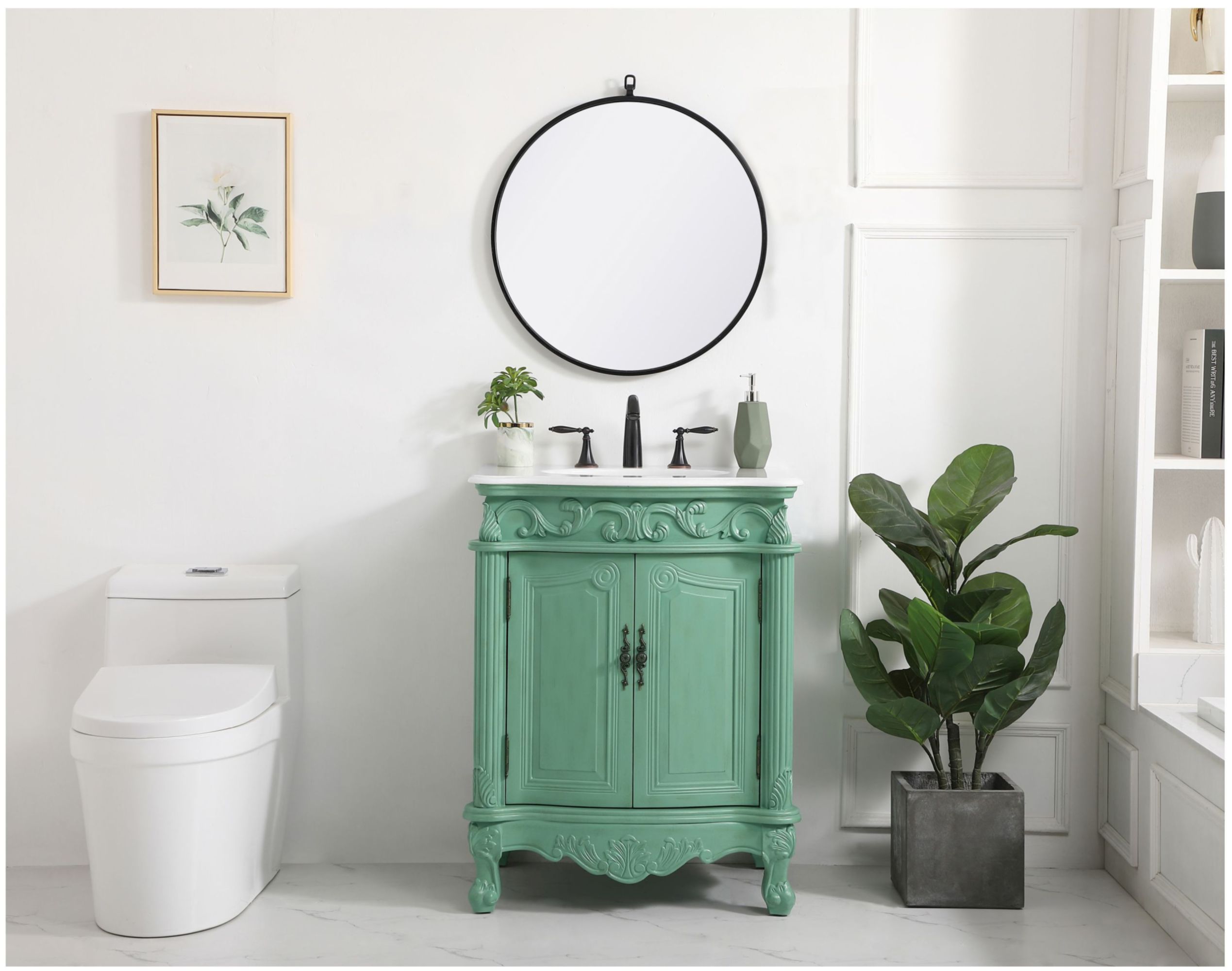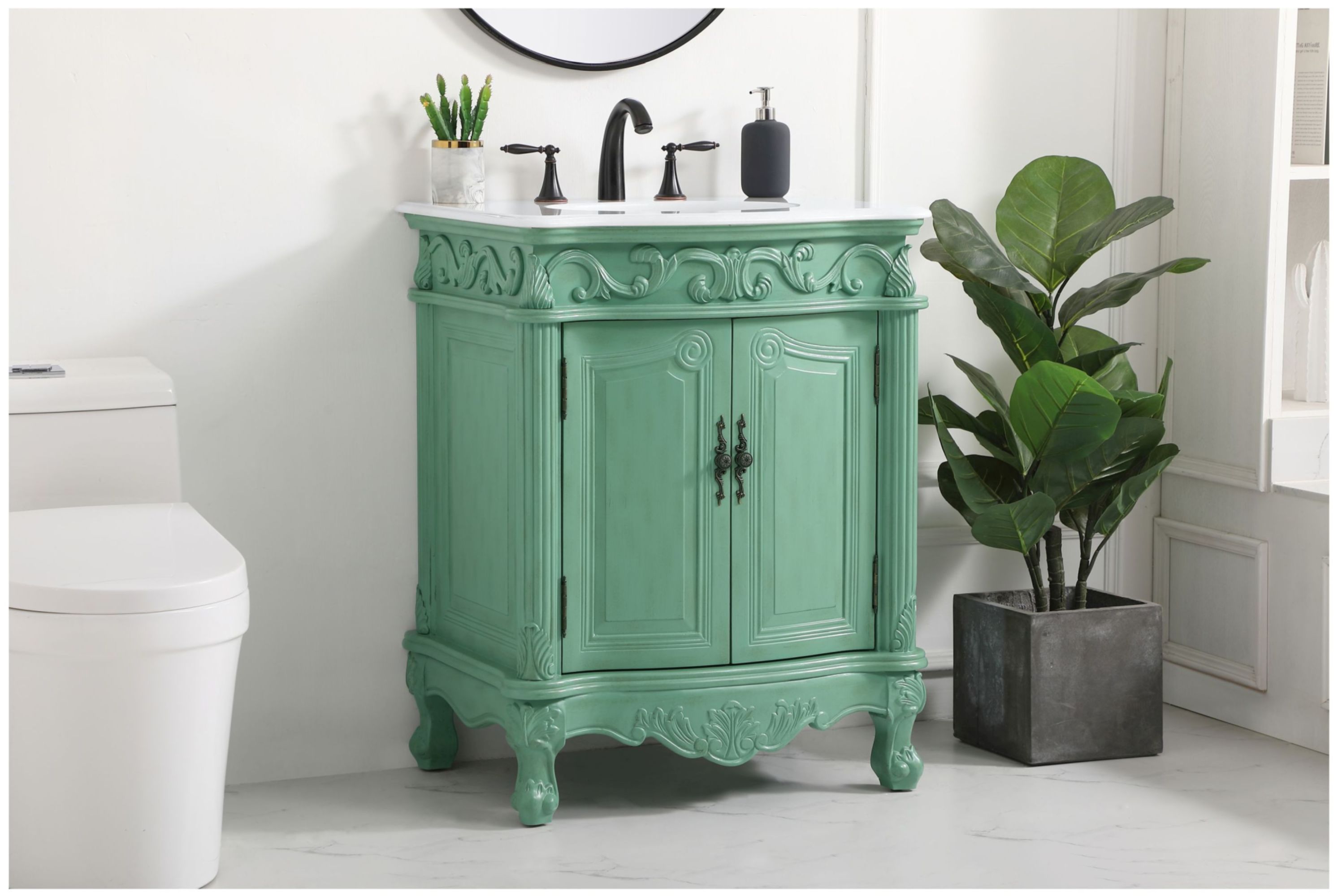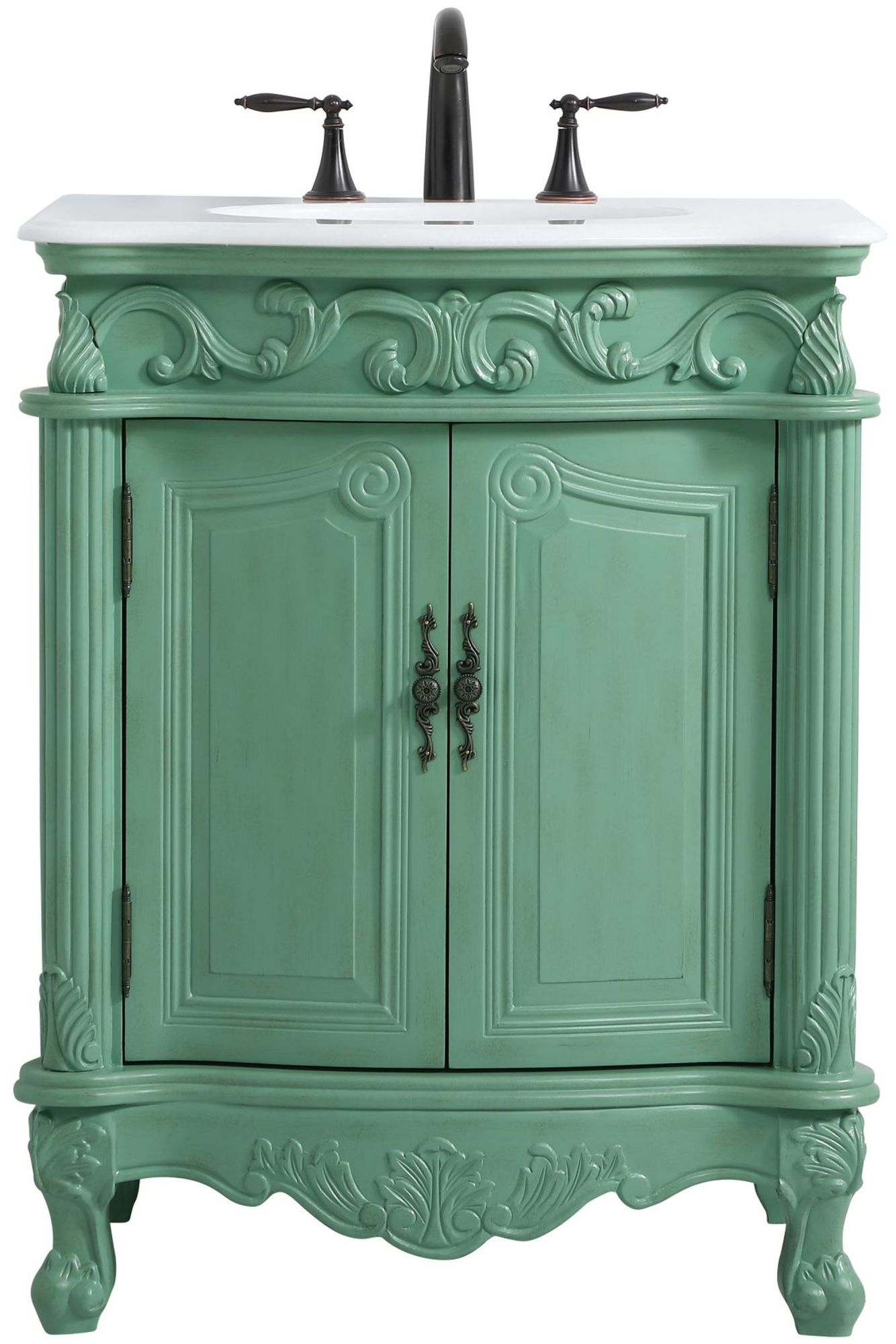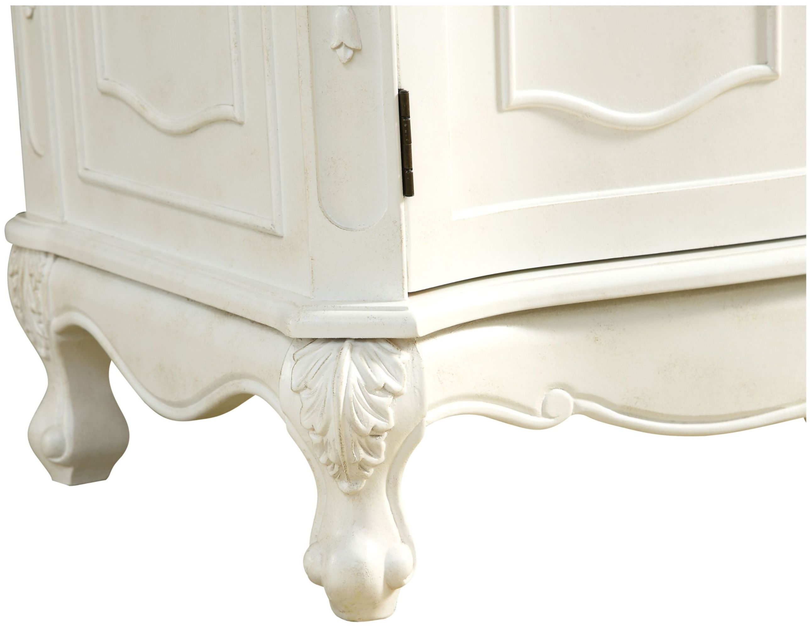 Item DescriptionThis superb balance of timeless tradition and opulent beauty in a quartz-topped vanity will certainly enhance the aesthetics of any home or office bathroom! Featuring a durable quartz countertop complementing the hand painted cabinet with a delicate carved floral design, stands on stylishly carved solid wood French scroll feet. Don't let the design fool you: the quartz countertop and porcelain undermount sink allows for space to get ready, while the antique bronze hardware allows you to discover storage spaces with ease. You and your guests will marvel at this vanity that will both store away your bathroom essentials and enhance the aesthetics of your room.