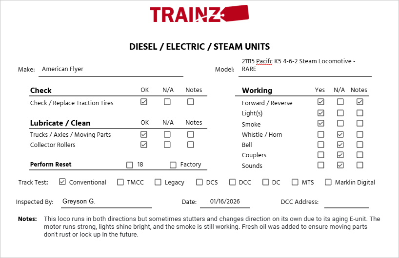This item has been graded per TCA standards C-6: Very Good based on visual appearance. The locomotive will occasionally change direction on its own due to an aging E-Unit. The locomotive and tender show scratches and spots of paint loss throughout various sections of the shell and chassis. The locomotive and tender show rust throughout various sections of the chassis and trucks. This item has been inspected by our repair shop. Please see the attached picture for inspection details and additional operation information. The instruction manual is not included. The original box is not included. Please check the photos for a detailed look at this item. Overall condition is Very Good.
