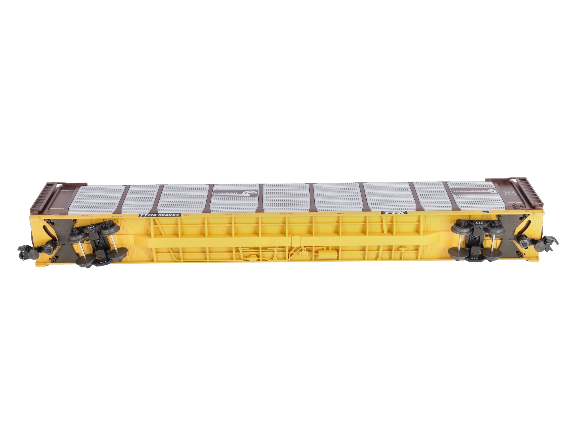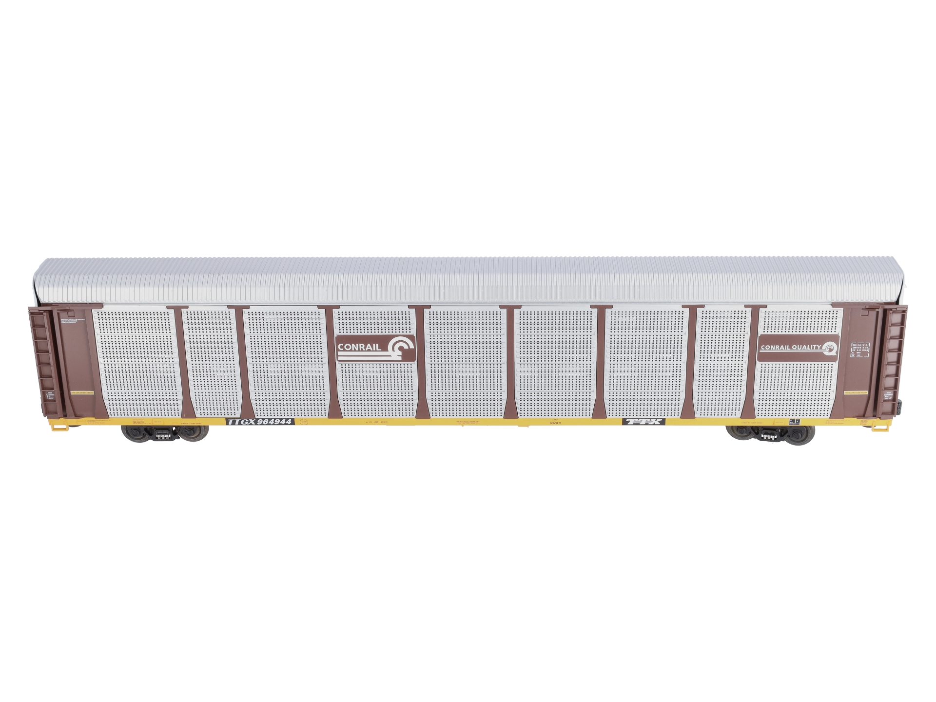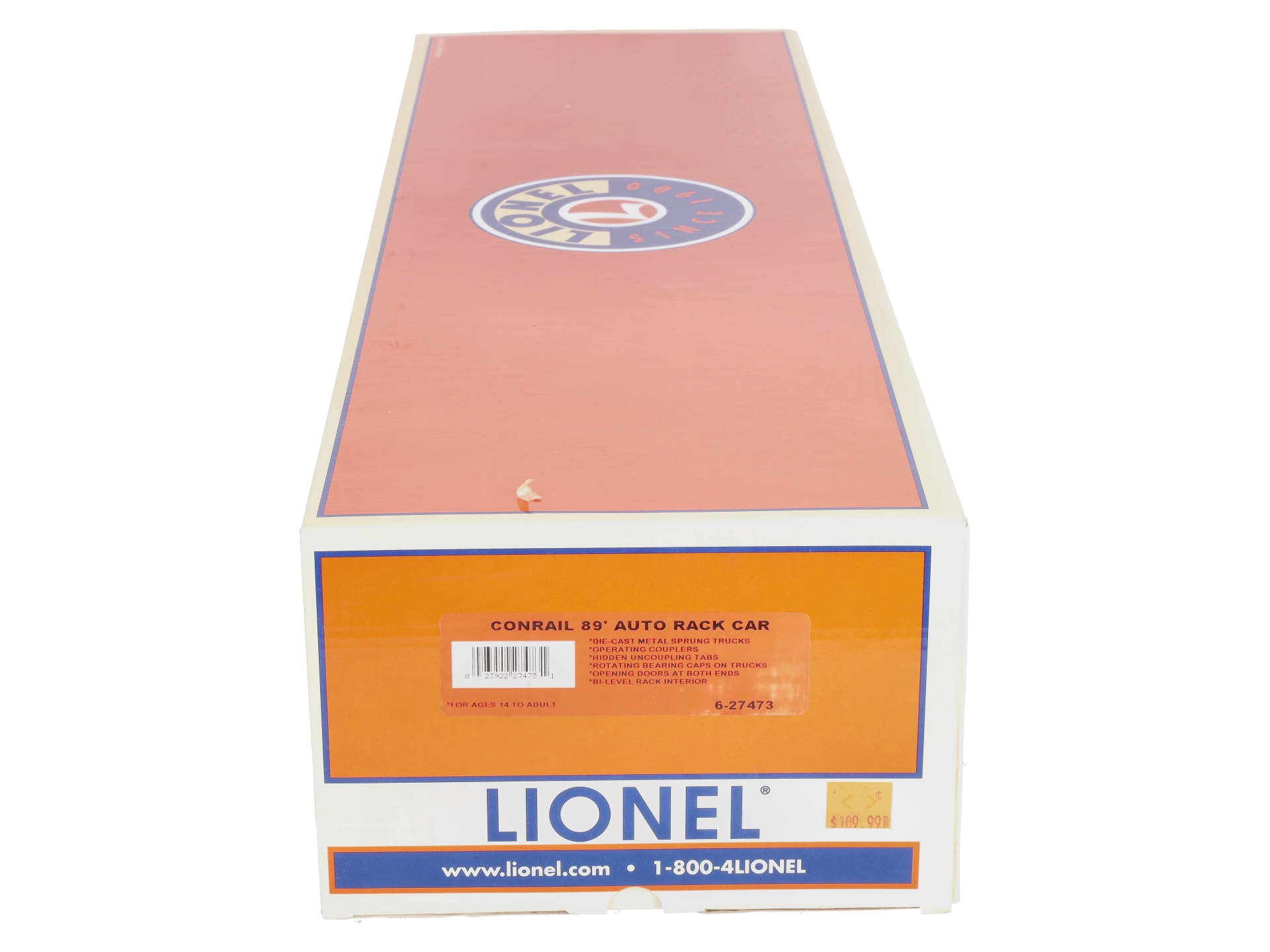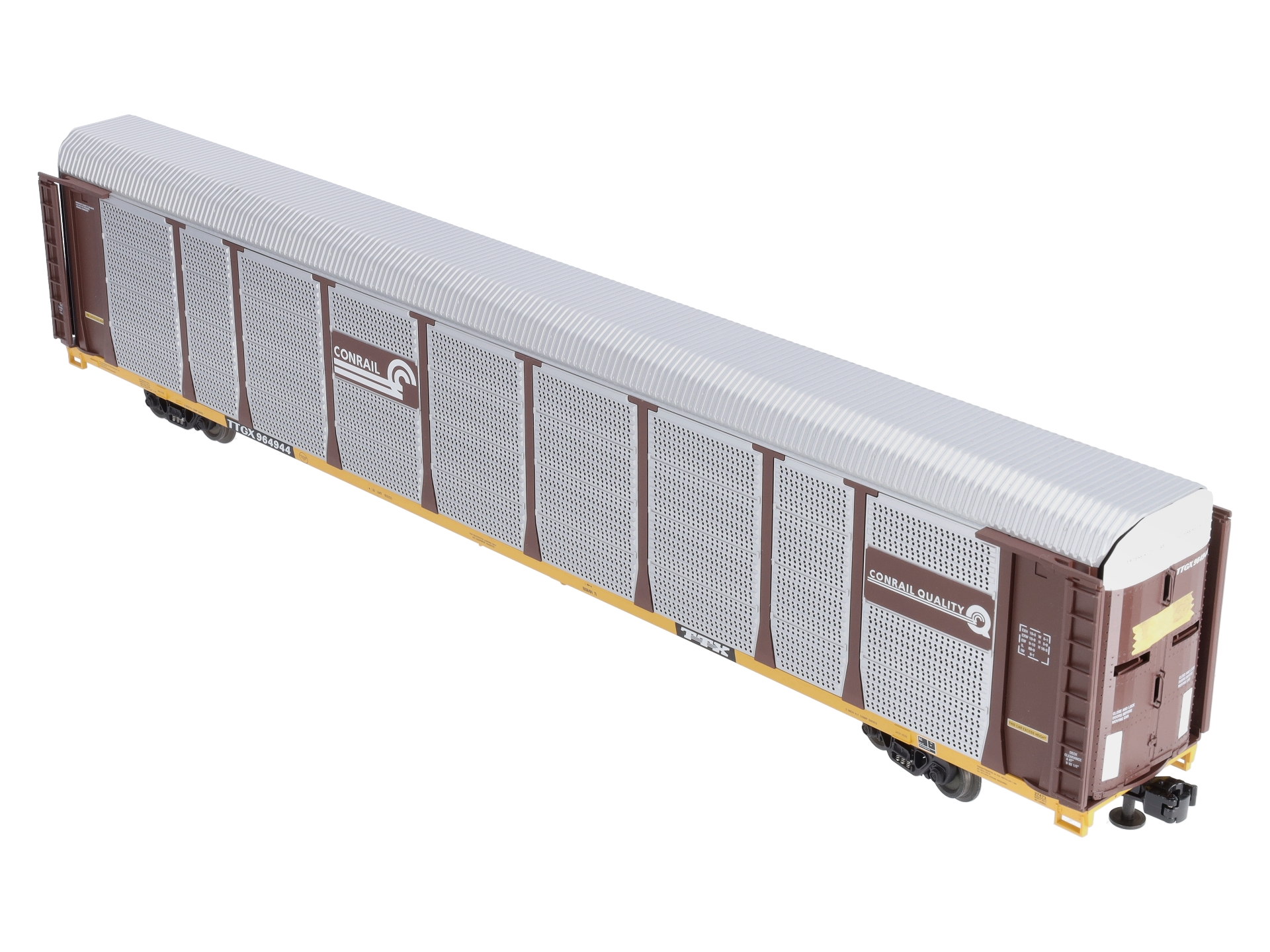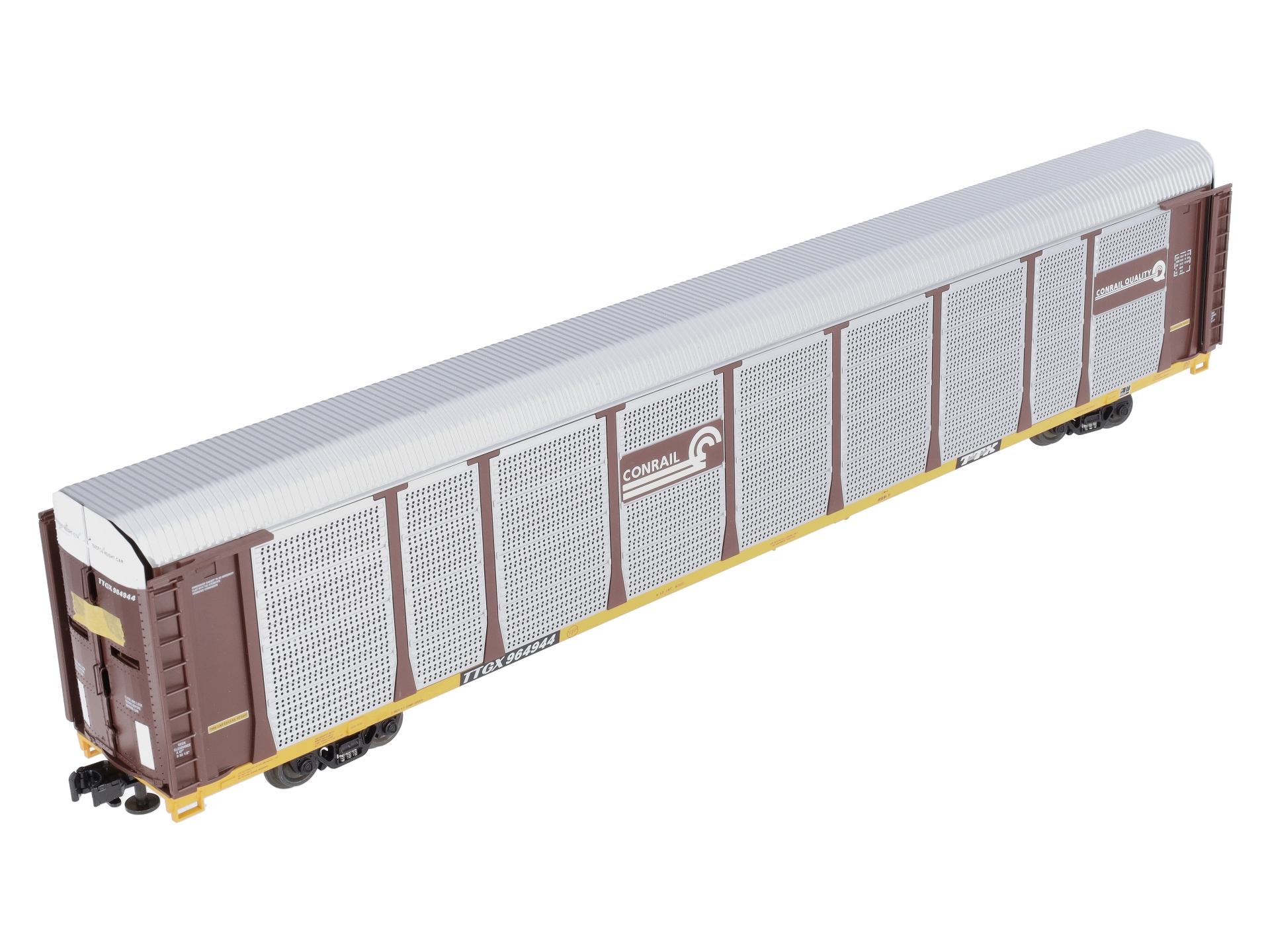 This is Lionel 6-27473 O Gauge Conrail 89' Auto Rack Car #964944. Newly tooled 89’ auto rack car. Features include: a plastic construction, all-new tooling, accurate 1:48 scale design, die-cast metal sprung trucks and operating knuckle couplers, hidden uncoupling tabs, opening doors at both ends, bi-level rack in interior, and the self-adjusting couplers allow for operation on tighter curve layouts.