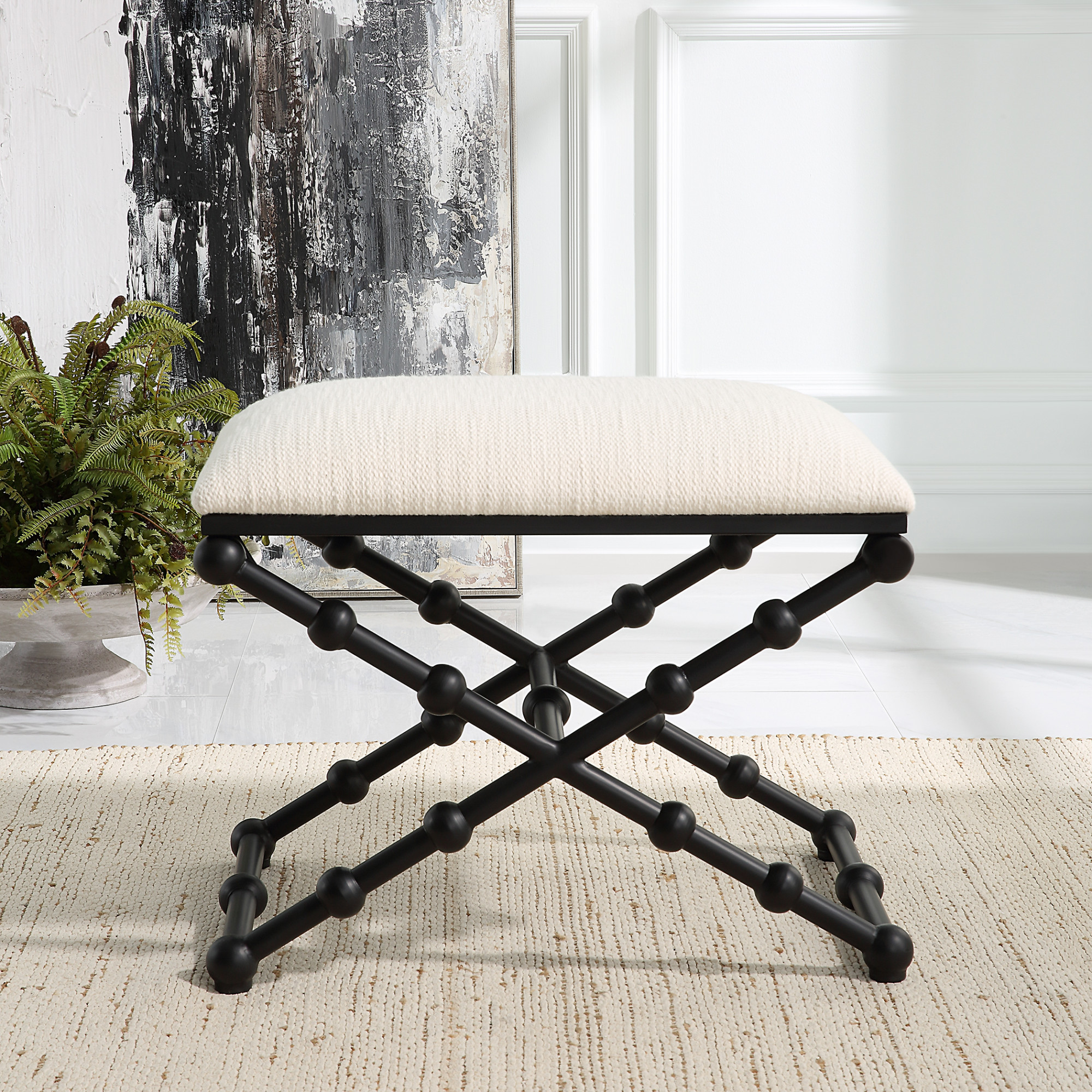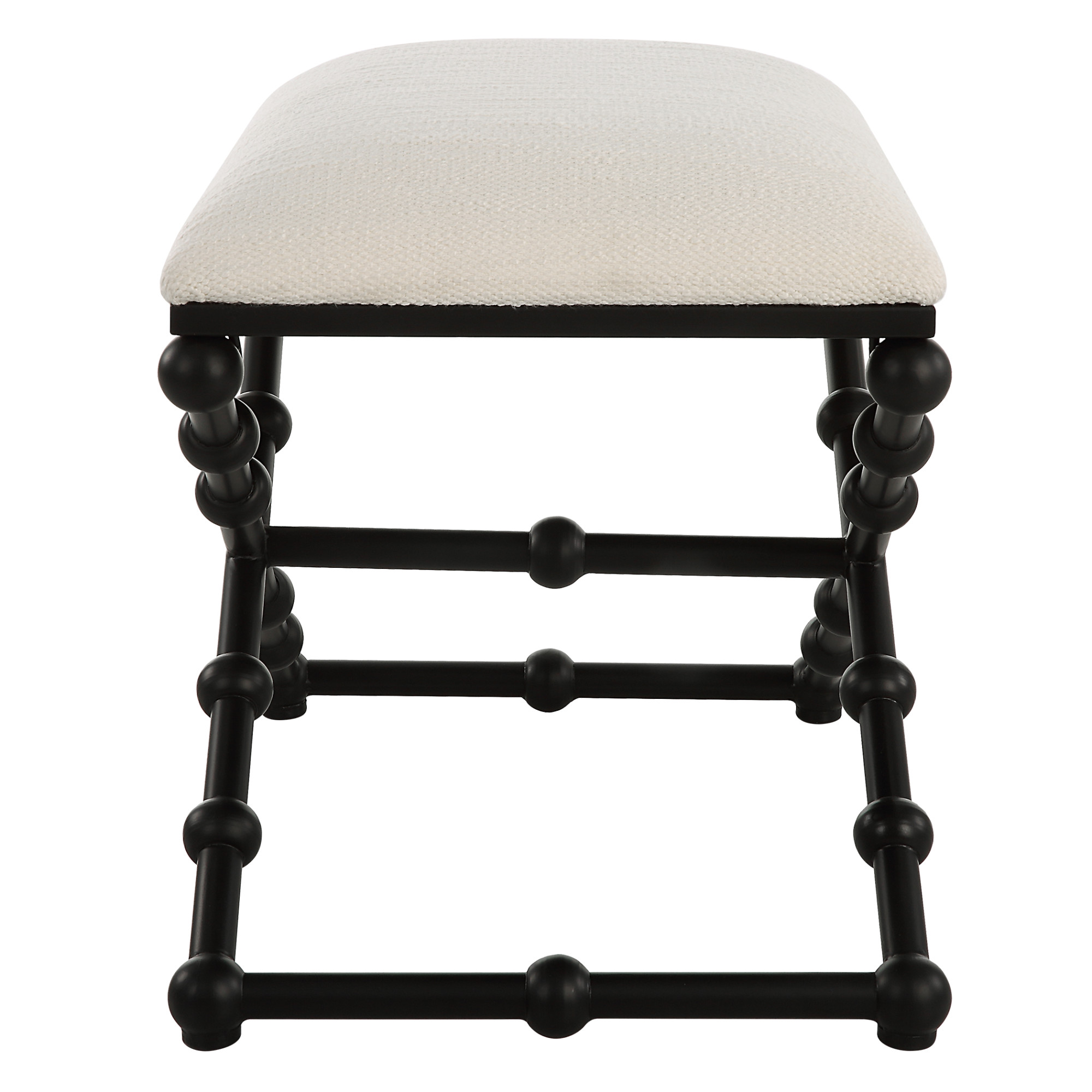 Item DescriptionSophisticated style created by the whimsical bubble legs ensures this bench to stand out in any home. crafted in iron with a satin black finish contrasted with a cushioned seat in a crisp white textured polyester fabric with performance treatment.