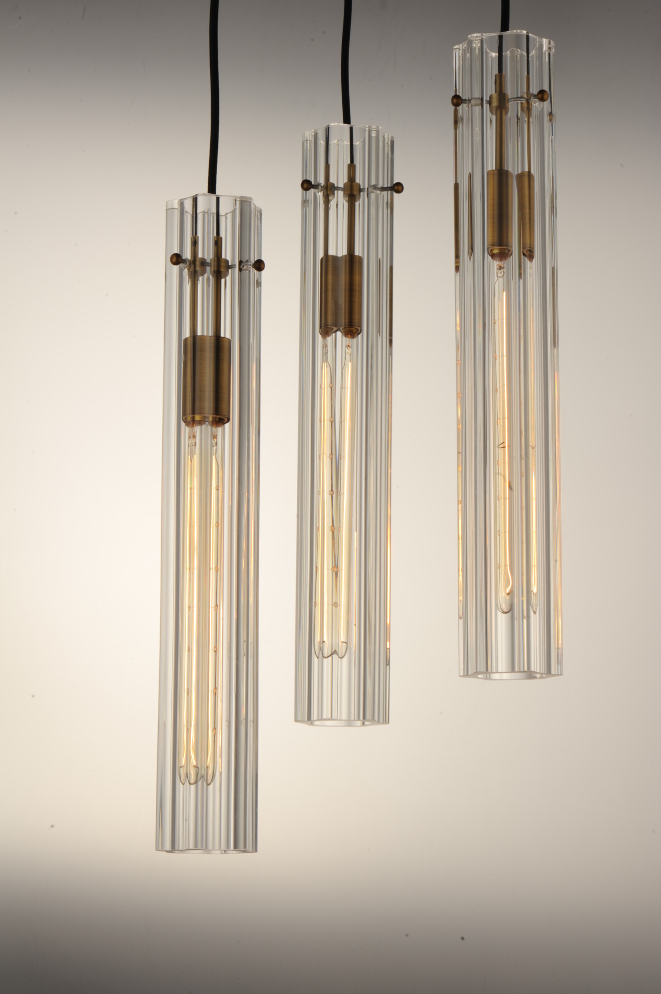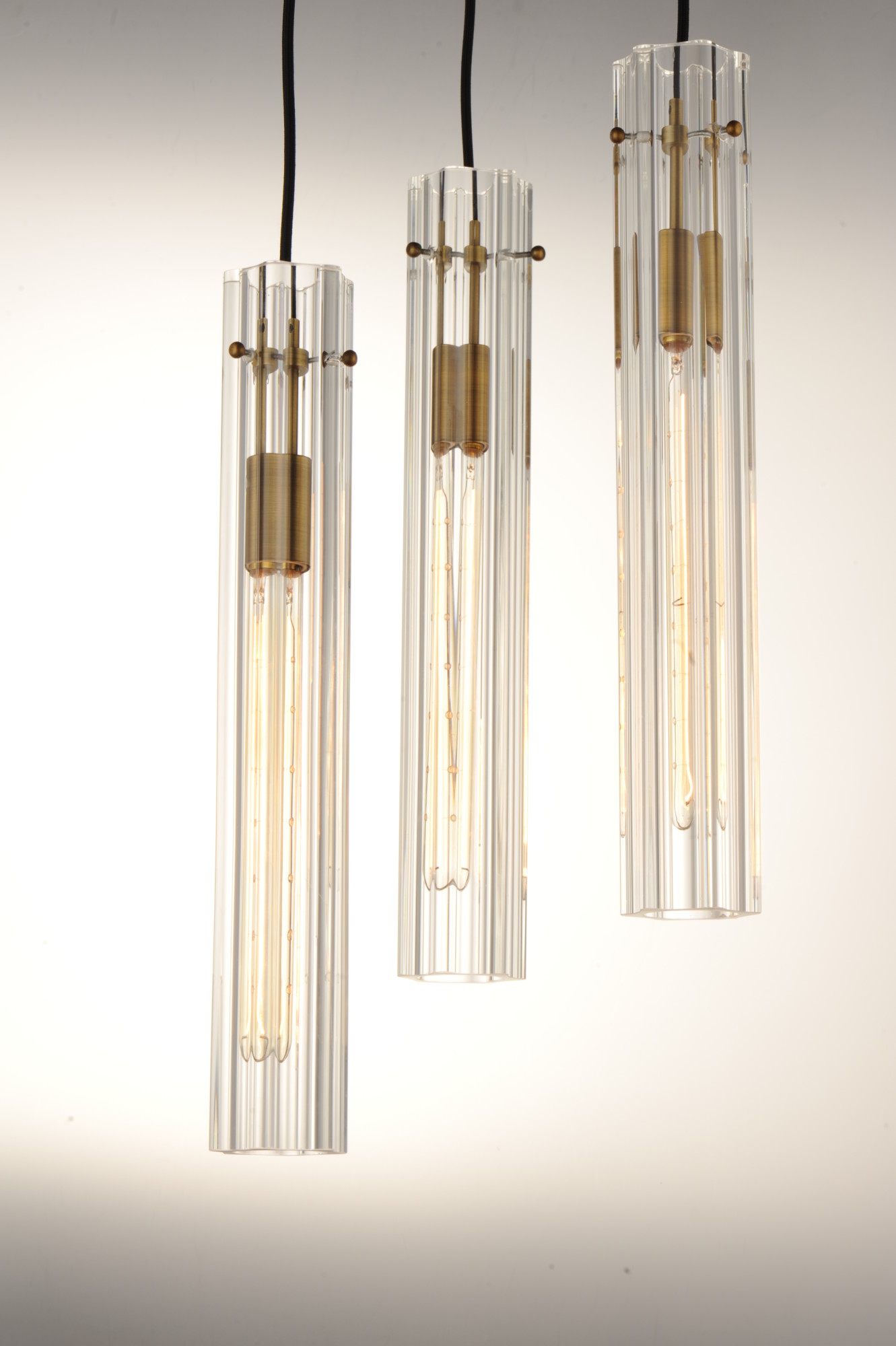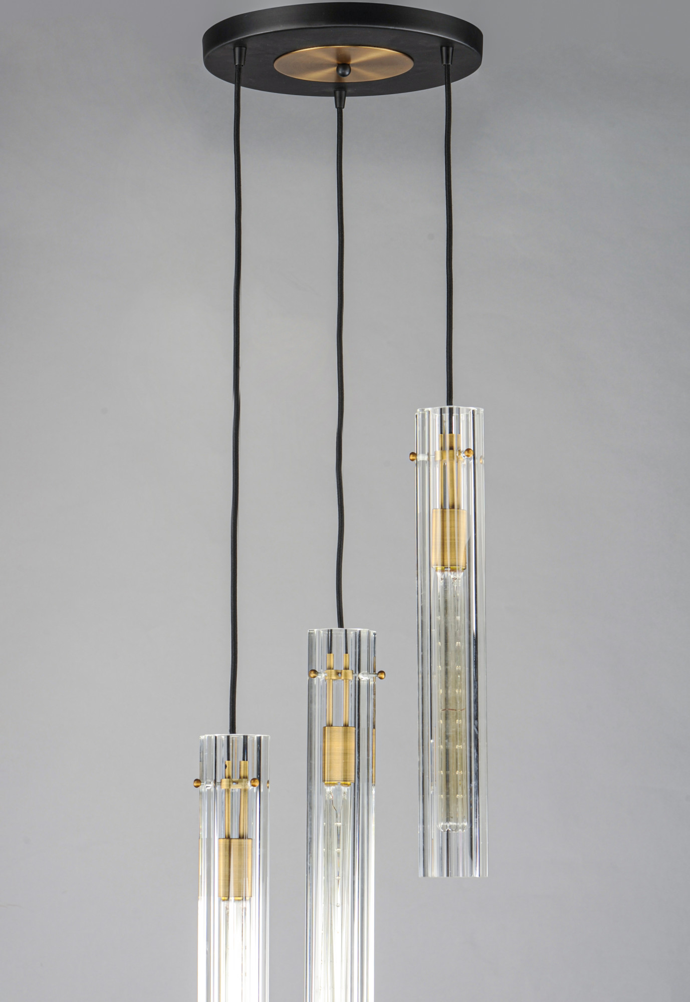 Item DescriptionAn exquisite collection featuring scalloped cylindrical Clear glass shades on unique metal frames finished in a combination of Black and Antique Brass. The cascading design of the chandeliers can be paired over a dining table or used as an entry fixture.