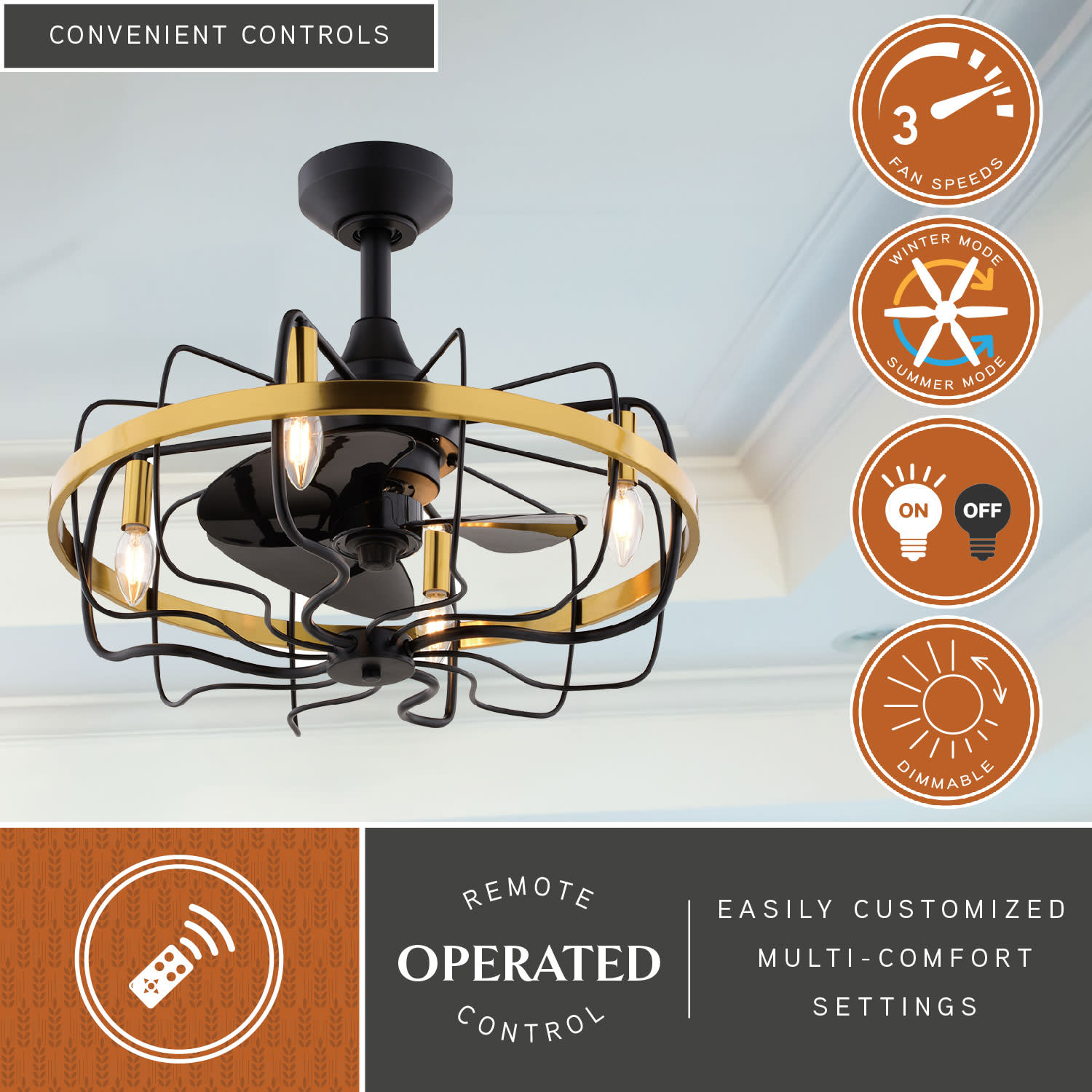 Item DescriptionElevate your contemporary space with the Kenton 21-in ceiling fan, blending industrial charm with modern sophistication. Its captivating cage frame adds a striking focal point to smaller spaces including family rooms, bedrooms, kitchens, or hallways. With remote control convenience, 3 speed settings, adjustable height, and included dimmable LED bulbs, this fan offers both style and functionality, ensuring lasting elegance and peace of mind for your home with safety certifications and a lifetime limited warranty.