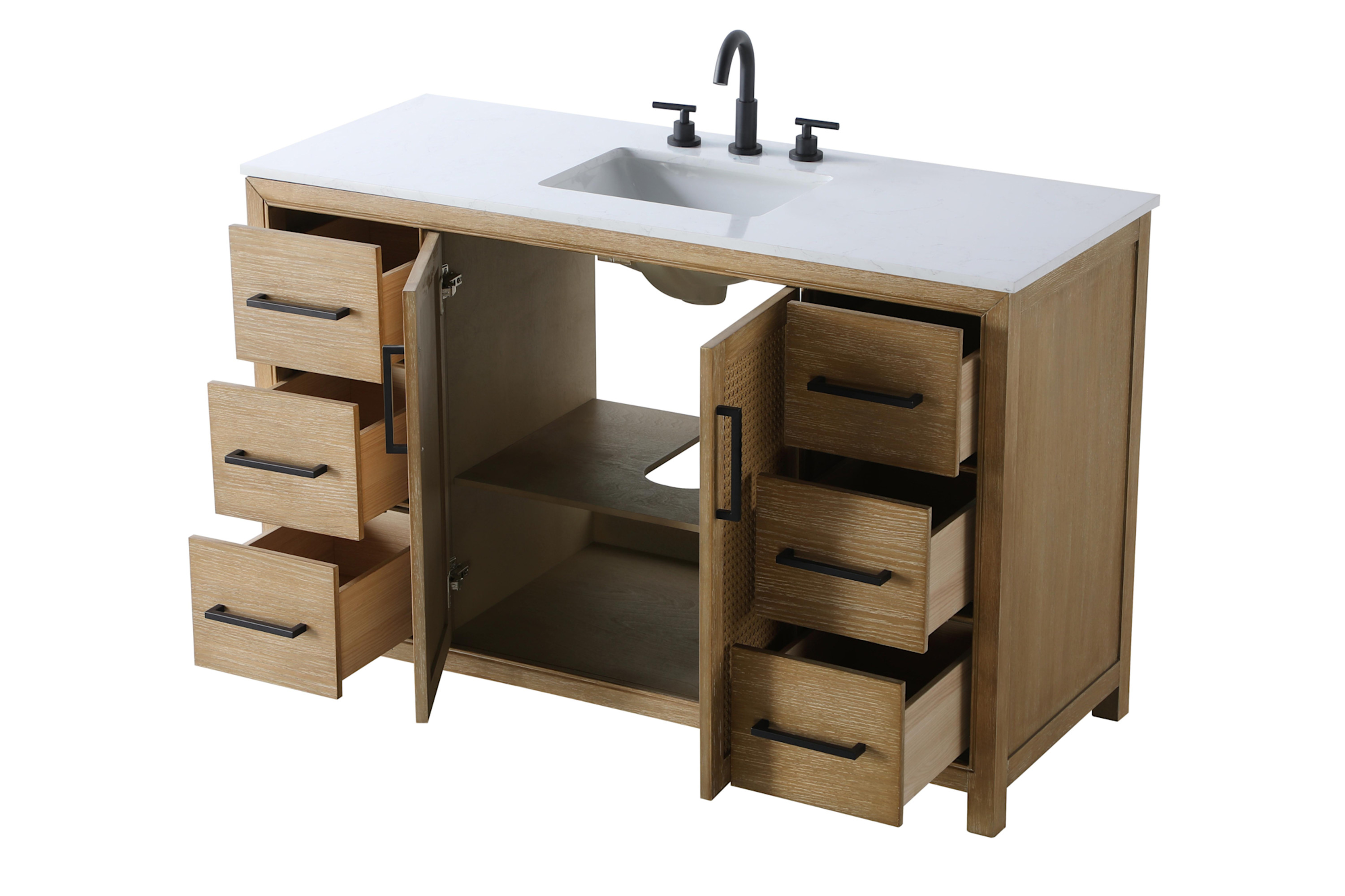 - Engineered wood and wood vanity cabinet with 2 doors, 6 drawers, and 1 shelf