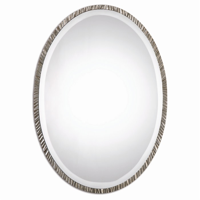 Item DescriptionTextured metal frame finished in a plated polished nickel. Mirror has a generous 1 1/4" bevel. May be hung horizontal or vertical.