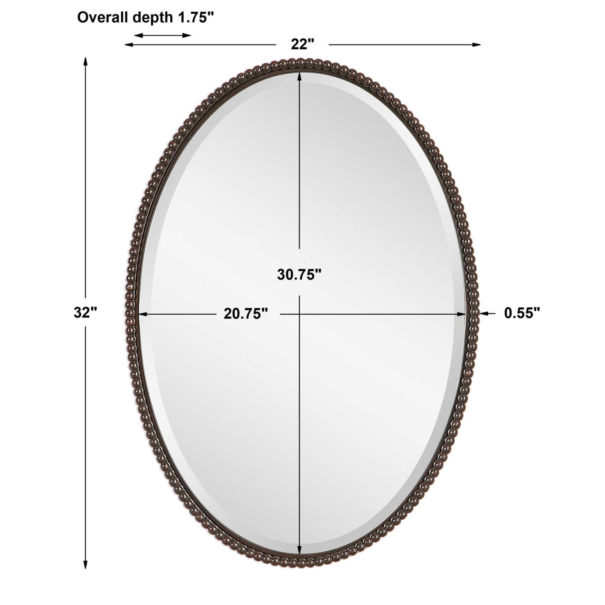 Item DescriptionThis oval mirror features a beaded frame made of hand forged metal finished in lightly distressed, oil rubbed bronze. Mirror edge is beveled.