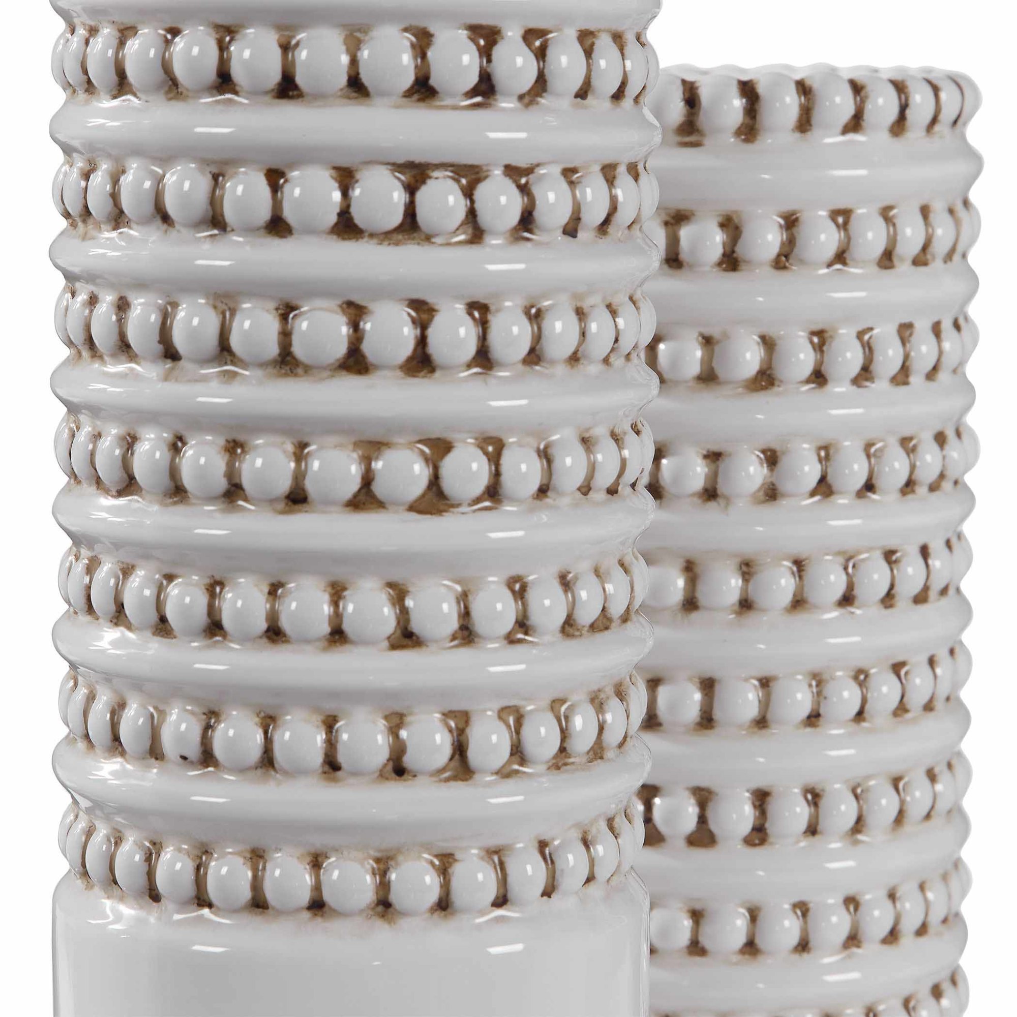 - Set of two ceramic vases finished in a glaze with beautiful accents, beaded texture, and a ribbed interior