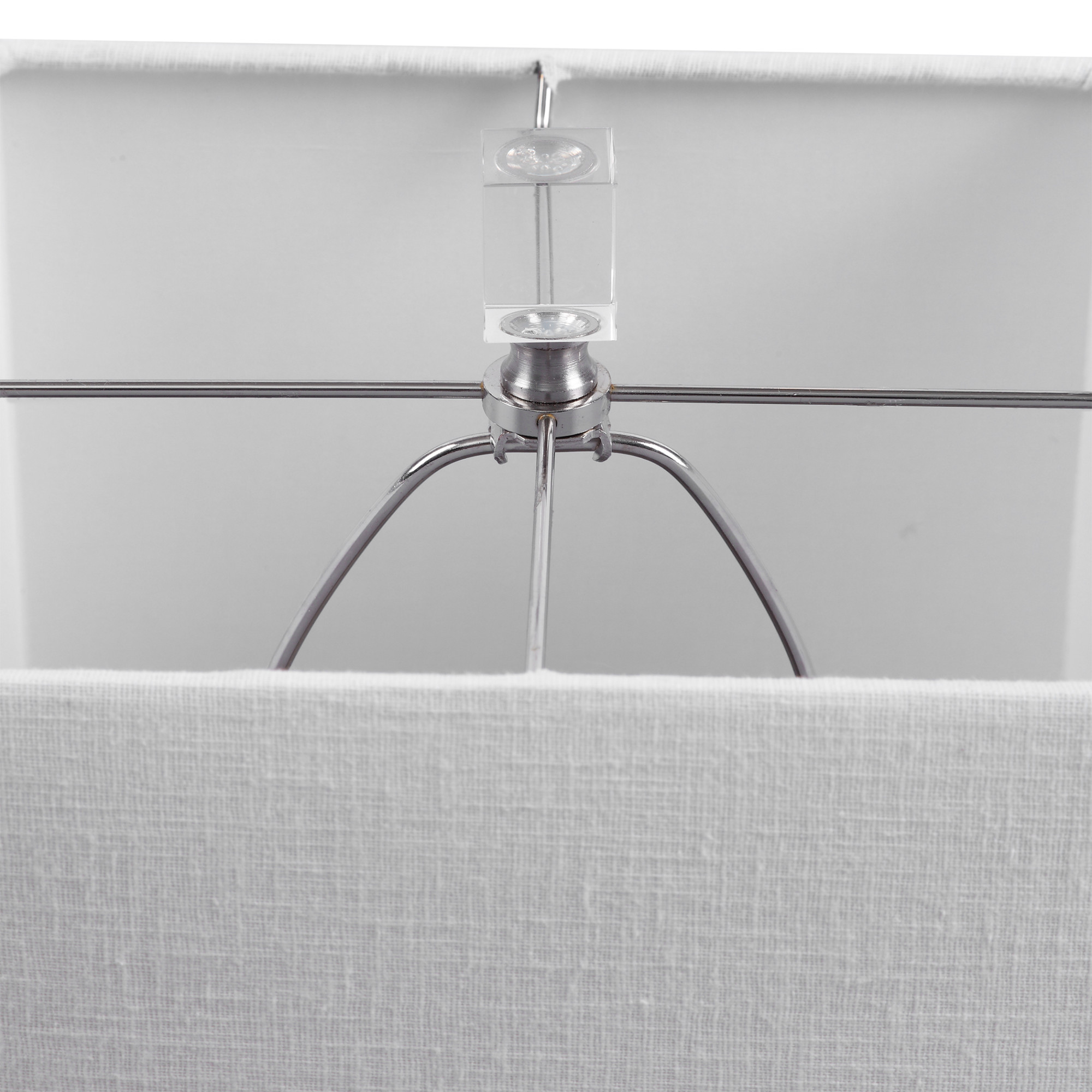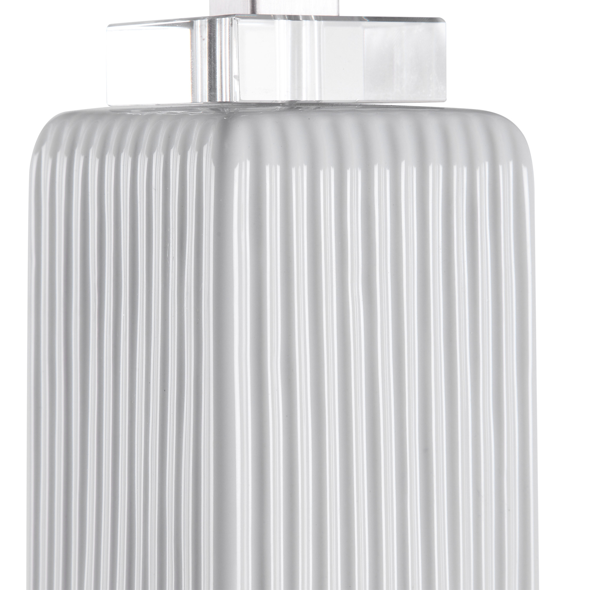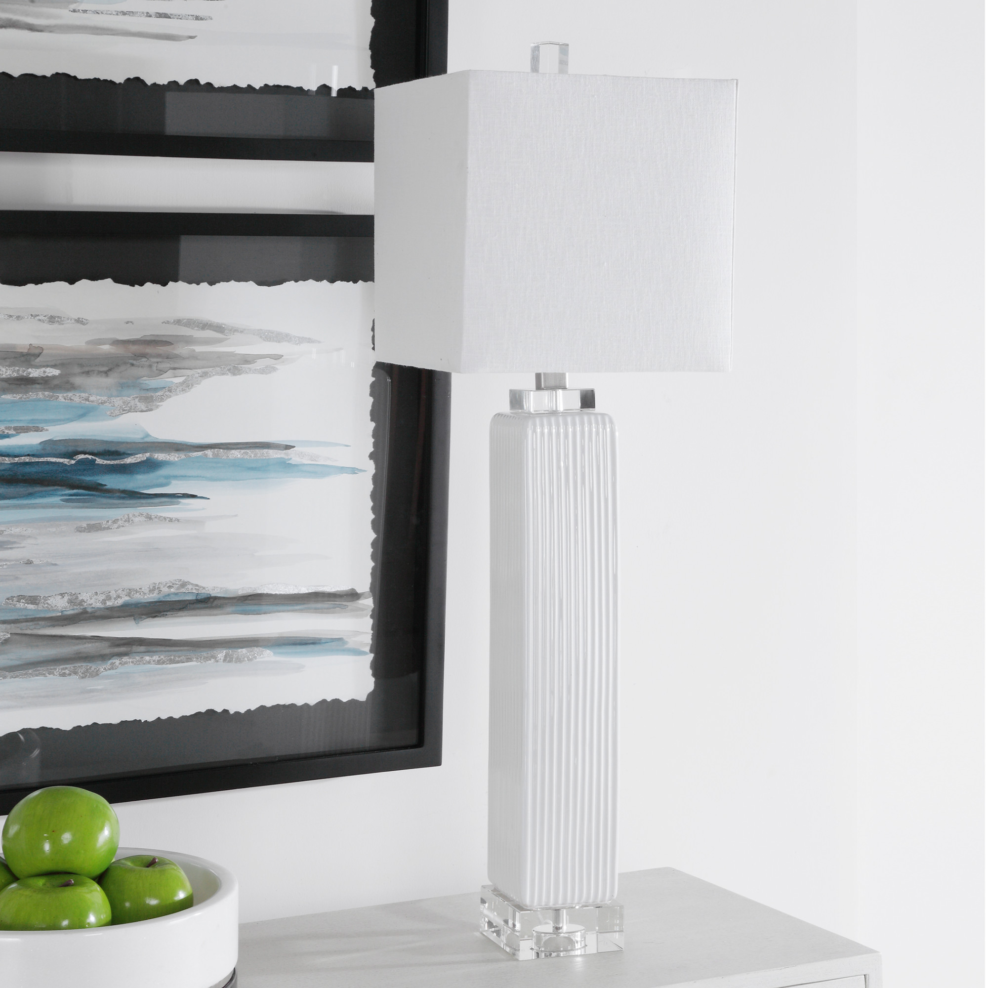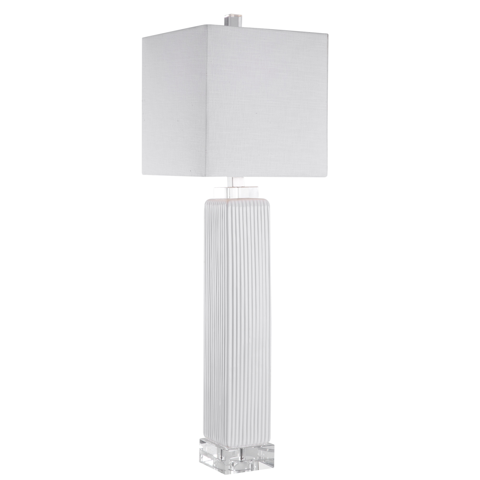 - Showcasing a refined transitional style, this buffet lamp can be easily placed with its square ribbed base finished in a gloss white glaze, paired with thick crystal details and brushed nickel accents