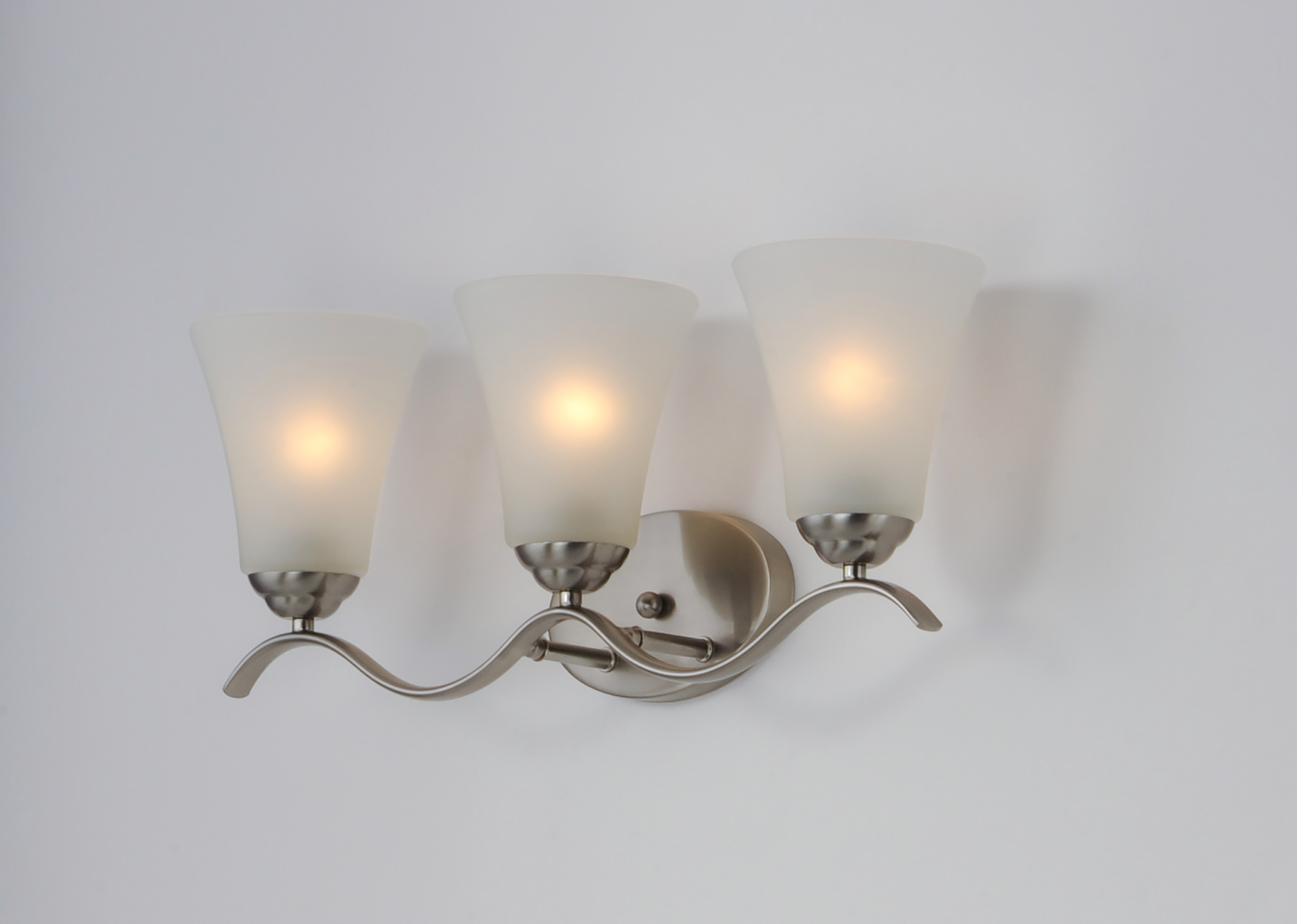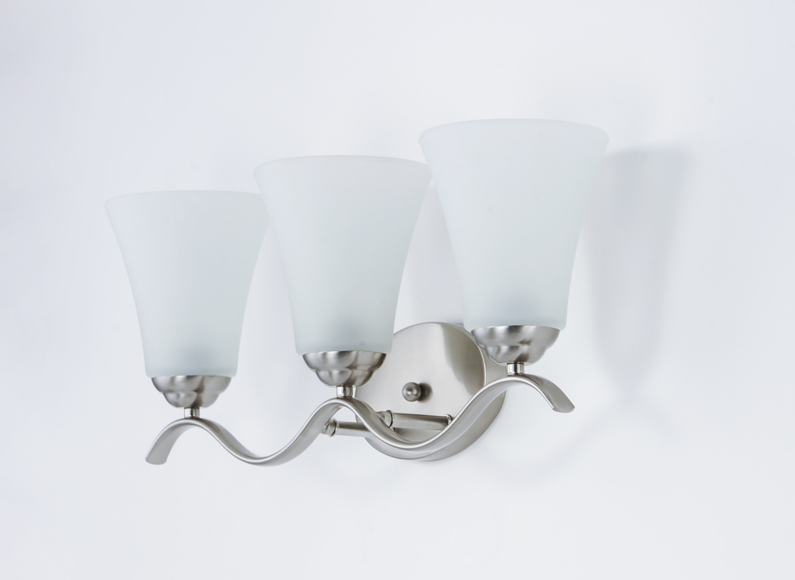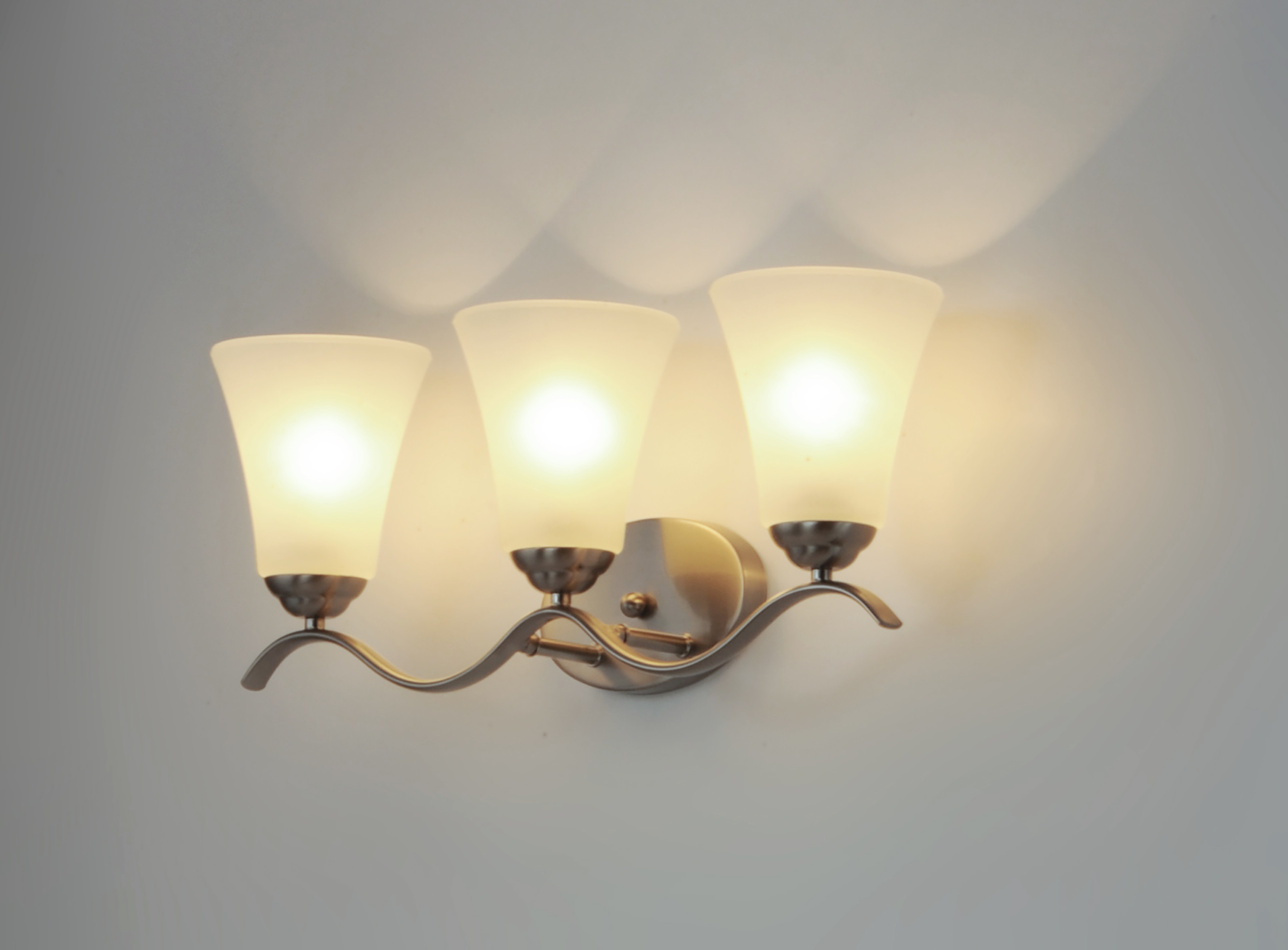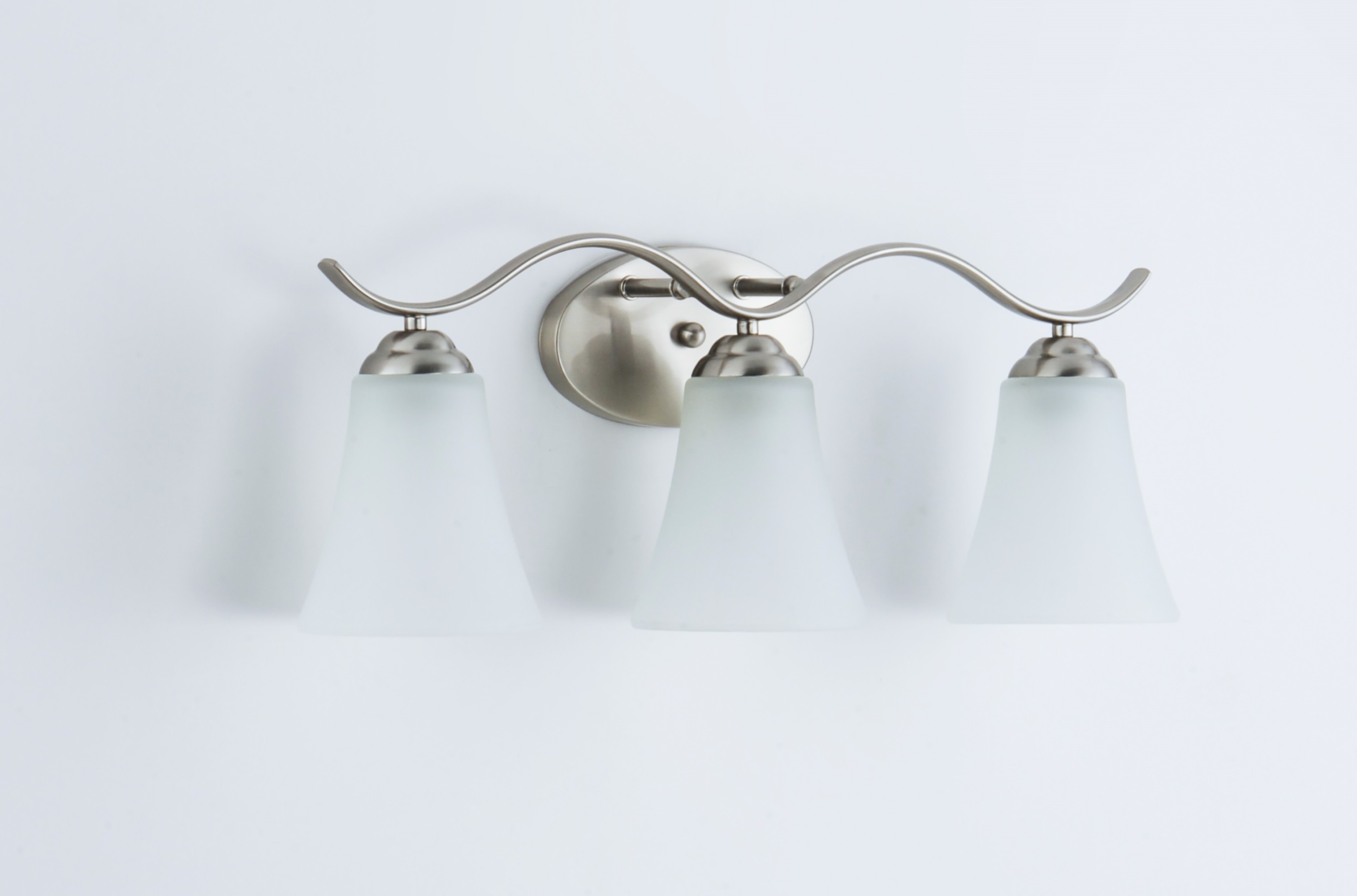 Item DescriptionGently waving arms of metallic color support tall-profile glass shades creating a scale normally not found in this category of lighting. The bath vanity may be installed up or down and also includes metallic finishes.